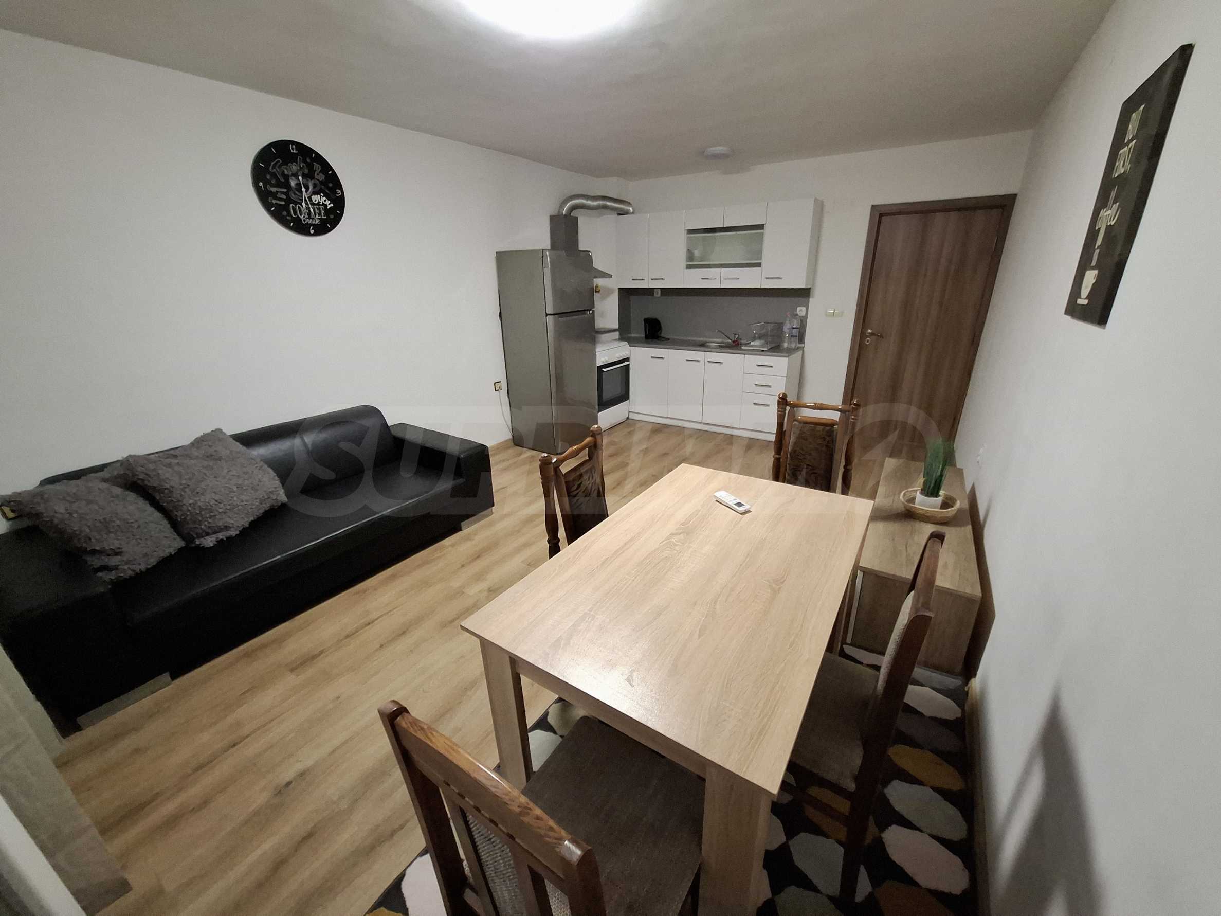 • furnished living room with dining area and fully equipped kitchen with cabinets, extractor hood, stove and refrigerator;