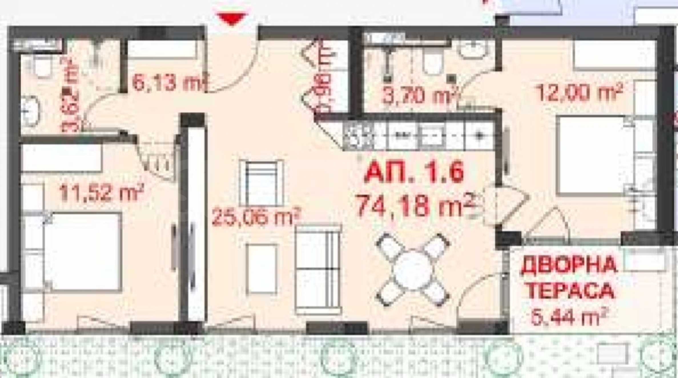 The apartment is being let in a state of completion according to Bulgarian Construction Code, with all modern installations, including air conditioning, internet, TV, security system and video intercom. There is a possibility of finishing according to an individual project. It is suitable for both personal, year-round use and for investment.
