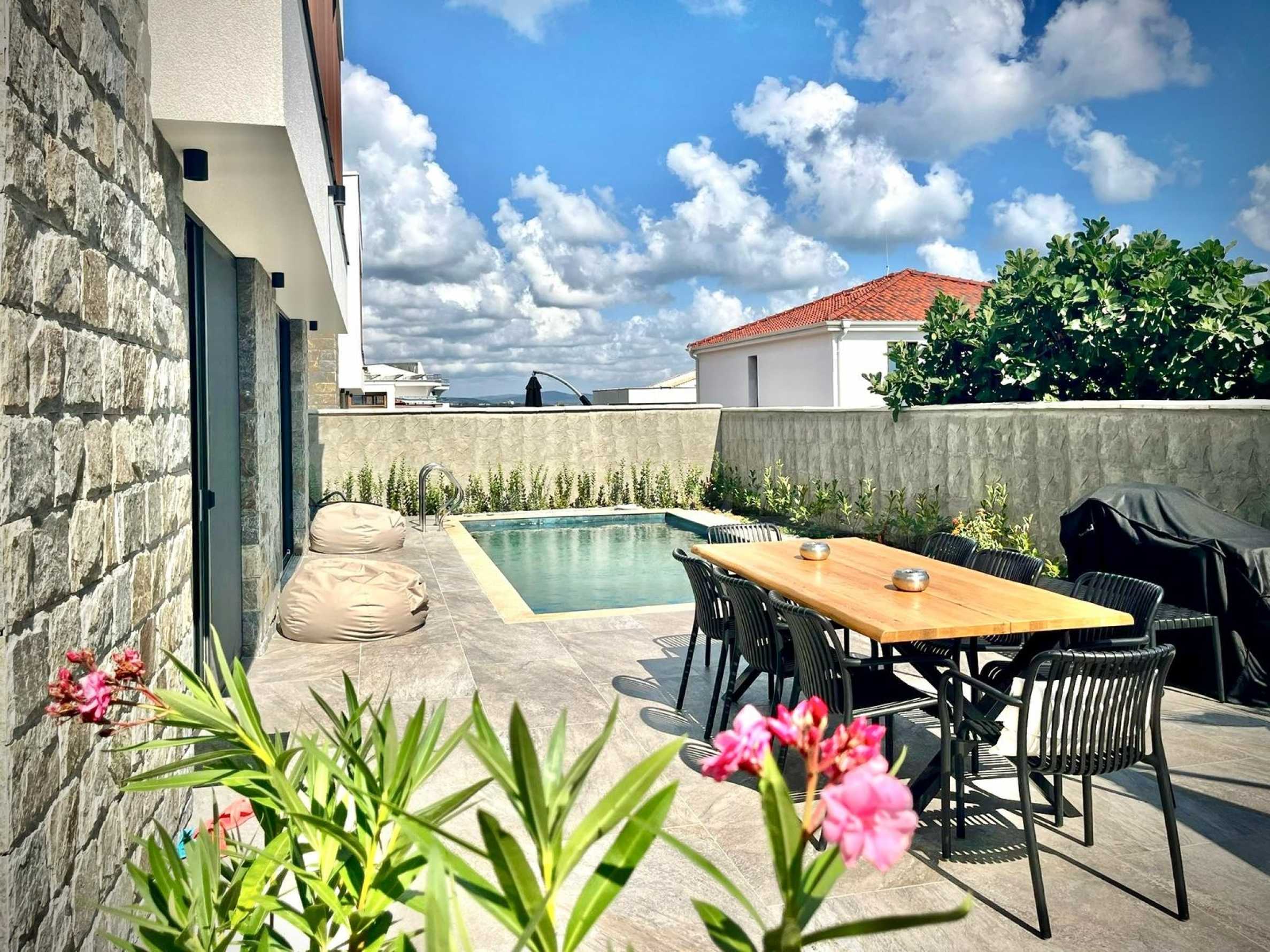 • Floor 1: entrance hall, living room with dining area and kitchen, bathroom with toilet, storage room, internal staircase, veranda with access to the pool;