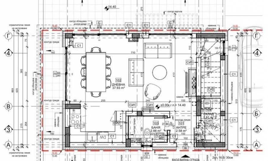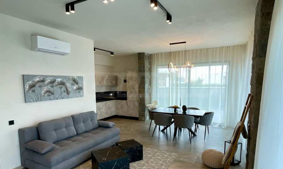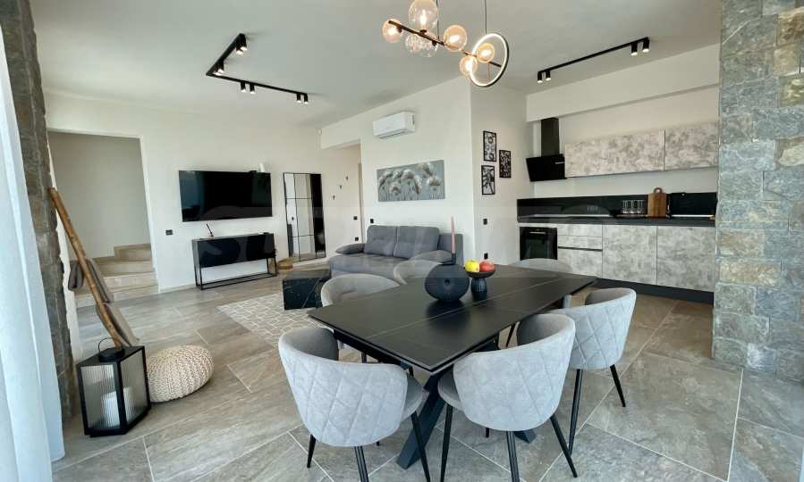 On the ground floor is the living room with kitchen, dining table and sofas with a total area of 38 m2. All furniture is imported from Italy, and the appliances are Bosch: built-in refrigerator, built-in dishwasher, extractor hood, four-burner induction hob, oven and host electrical appliances. The entrance hall divides the space between the bathroom with toilet and the storage room under the stairs, in which two boilers are placed, providing hot water in the house.