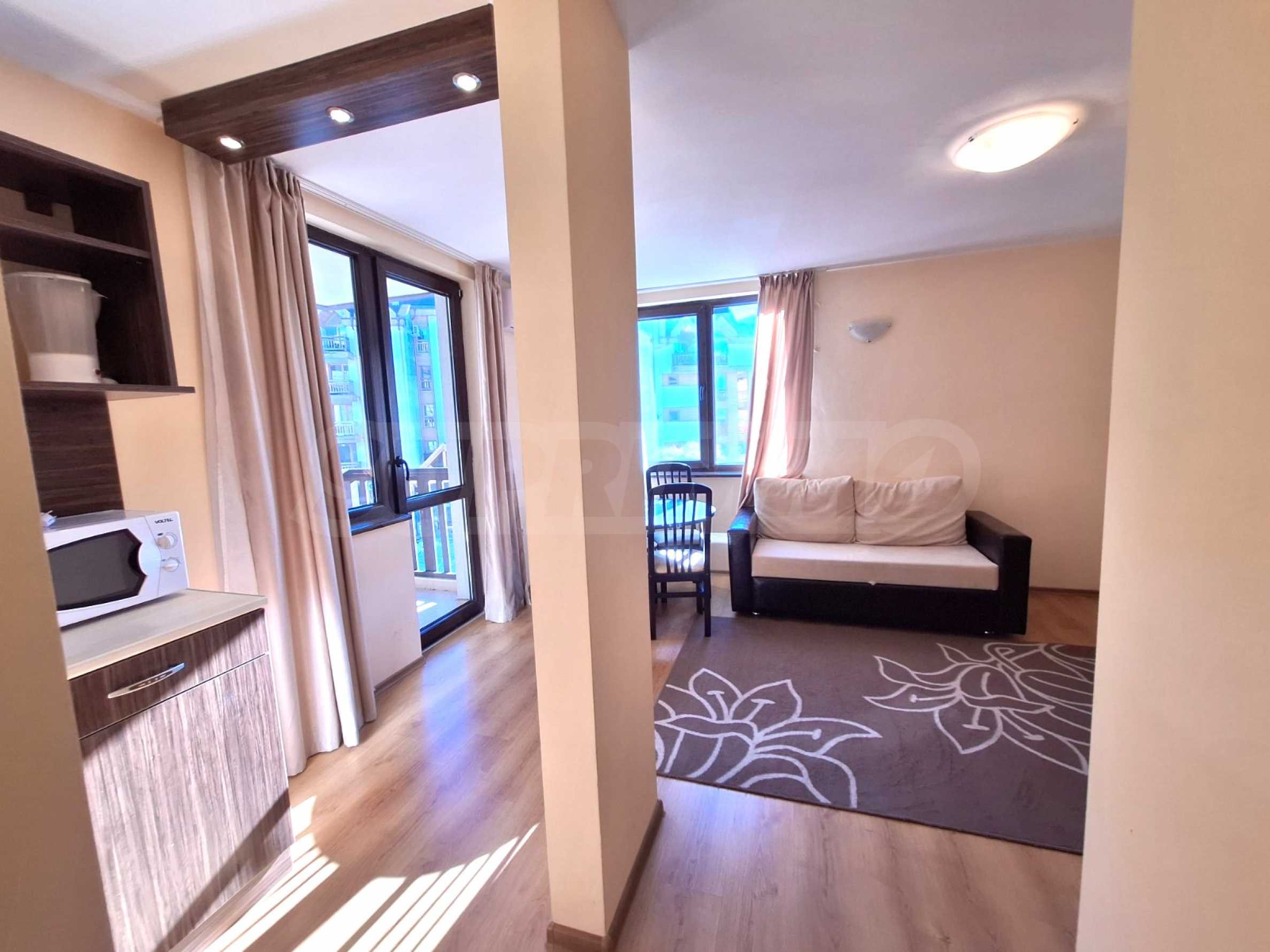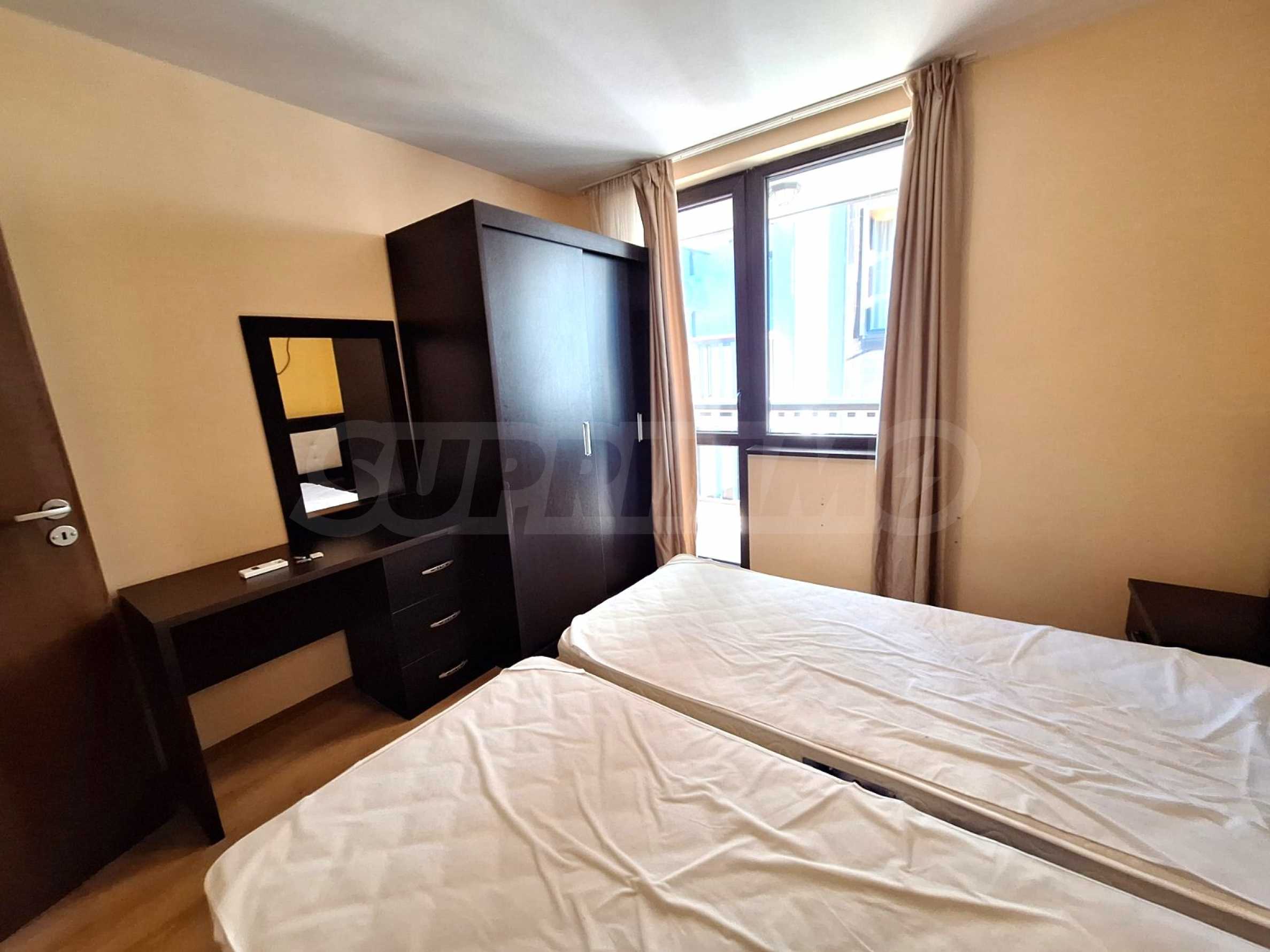 Furnished one-bedroom apartment in a hotel complex located at the foot of Pirin Mountain, just a few minutes from the gondola lift and the ski slopes of Bansko.