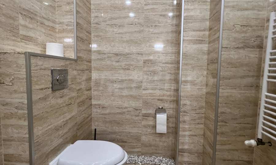 -bathroom with shower cabin and toilet, separate guest toilet;