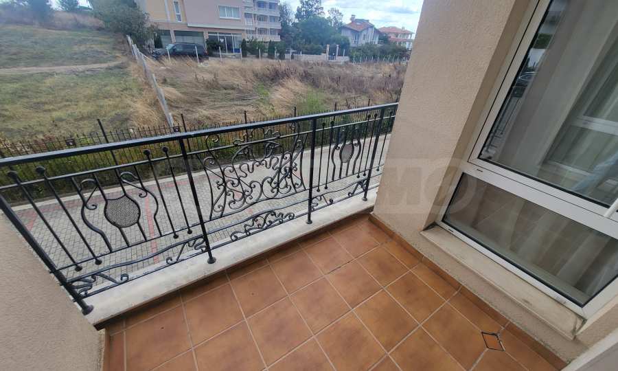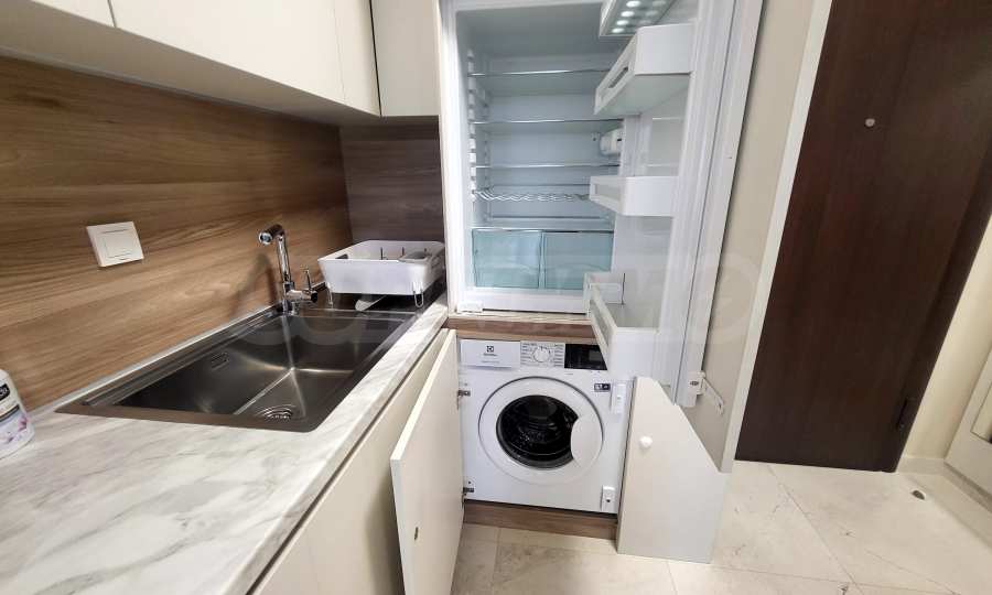 The apartment is located on the second floor of the building (first above the ground floor) and features a spacious balcony with views of the sea and the inner courtyard of the complex. It is fully furnished with built-in furniture made to order, as well as free-standing furniture from renowned brands. The white goods are mainly from the prestigious brand Bosch — washing machine, dishwasher, oven, and a built-in refrigerator with a separate large freezer compartment. On the balcony, there are rattan furnishings — a coffee table and chairs, as well as a retractable awning providing protection from the sun and rain, which can be extended and retracted with a handle.