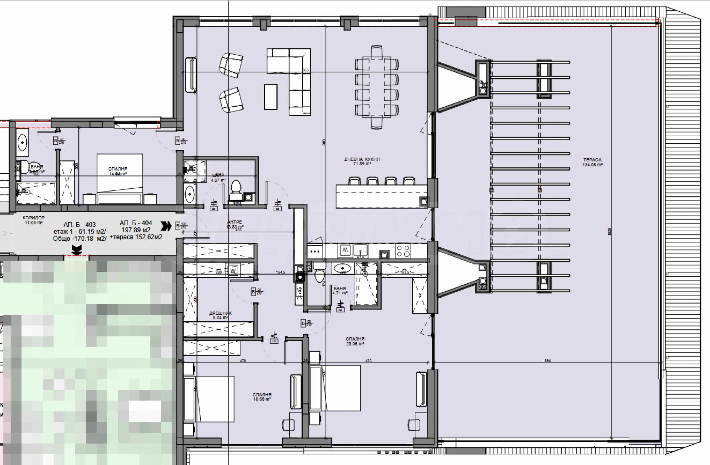 The property is situated on the 4th floor and offers 429.67 sq m of total area (net area 349.77 sq m + common areas 79.90 sq m). It consists of an entrance hall, a living room with a kitchen and a dining room, a master bedroom with an en-suite bathroom and a walk-in closet, two bedrooms with en-suite bathrooms and a terrace with access to the living room and one of the bedrooms.
