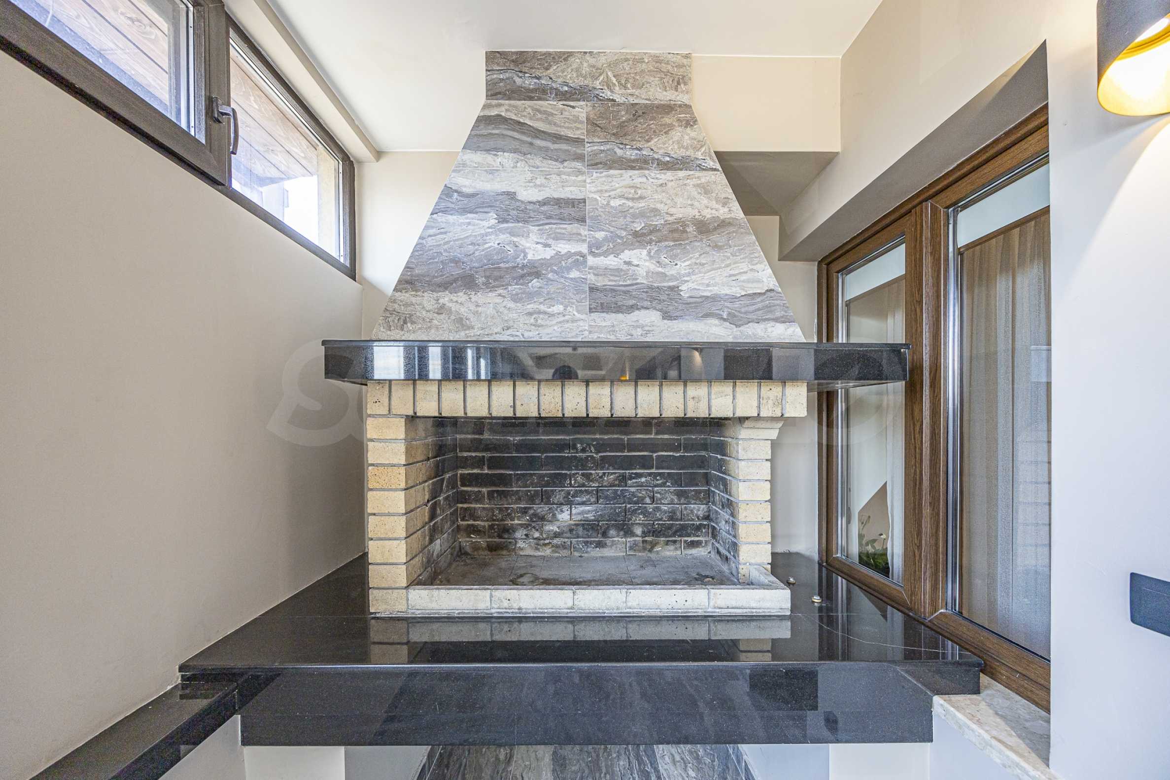 • spacious and bright living area with a modern fireplace;