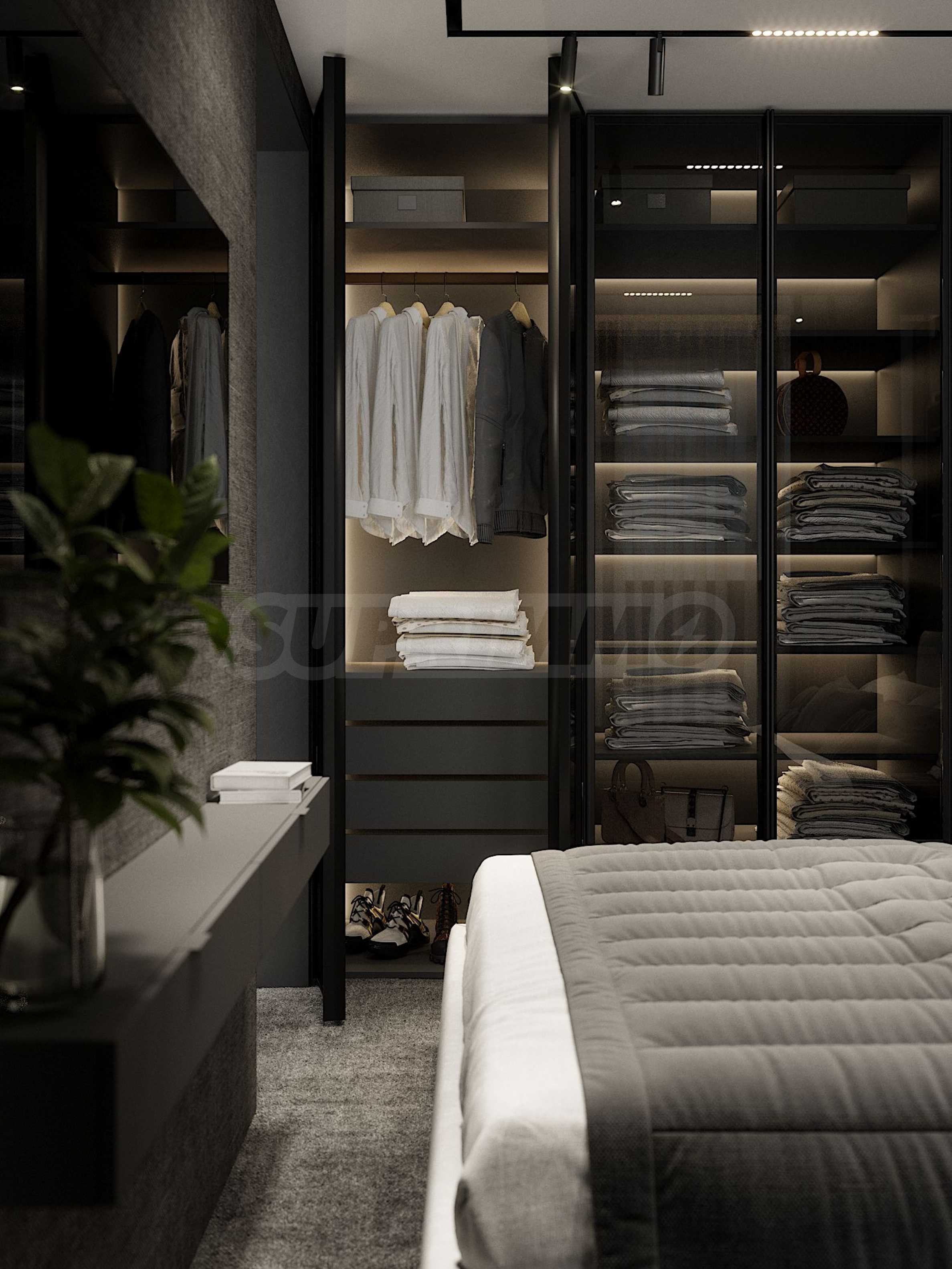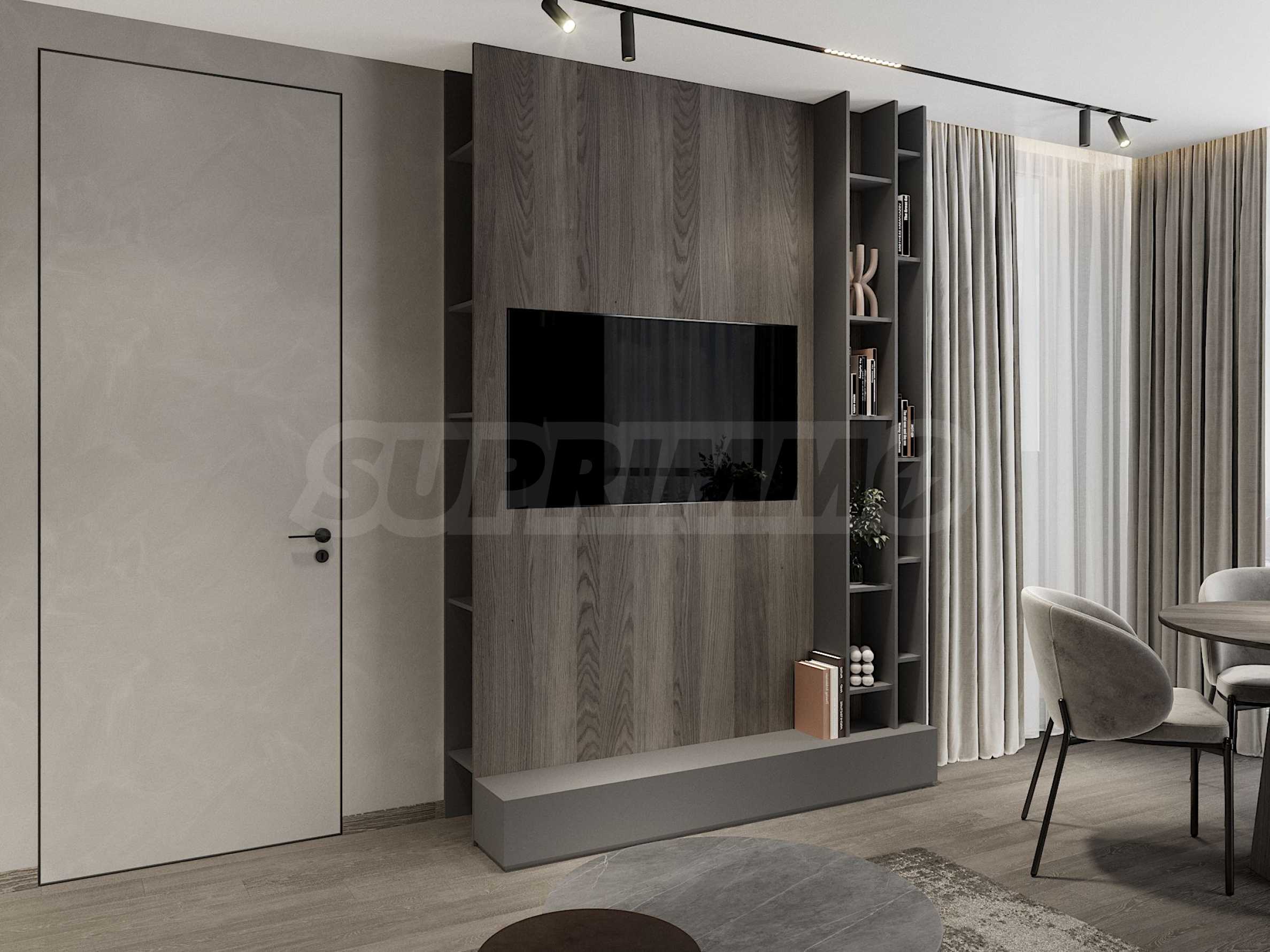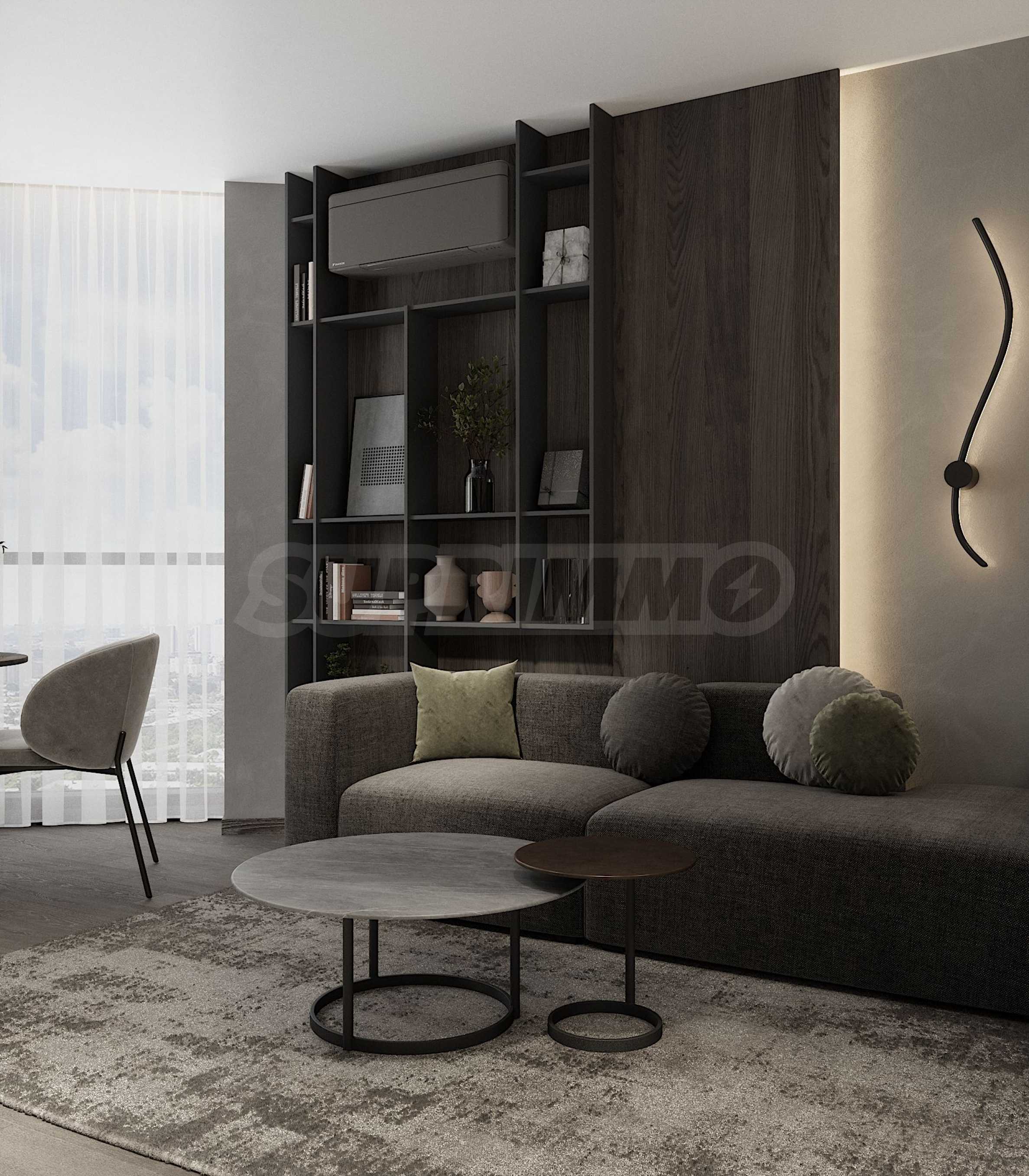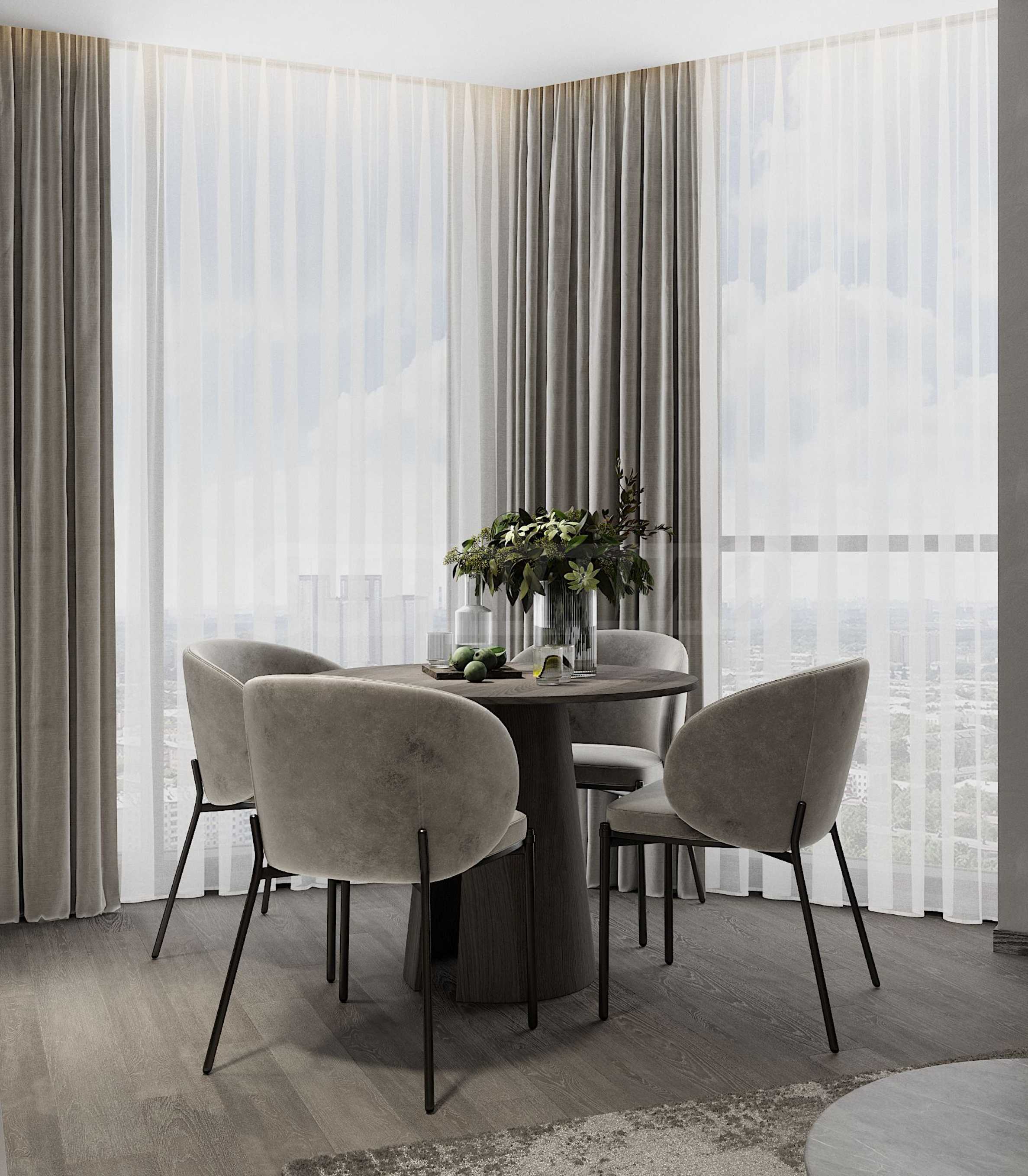 The apartment is not yet furnished, but will be fully finished in the style and details shown in the visualizations: modern minimalism with a luxurious Scandinavian feel, neutral tones, high-end materials and precise LED lighting.