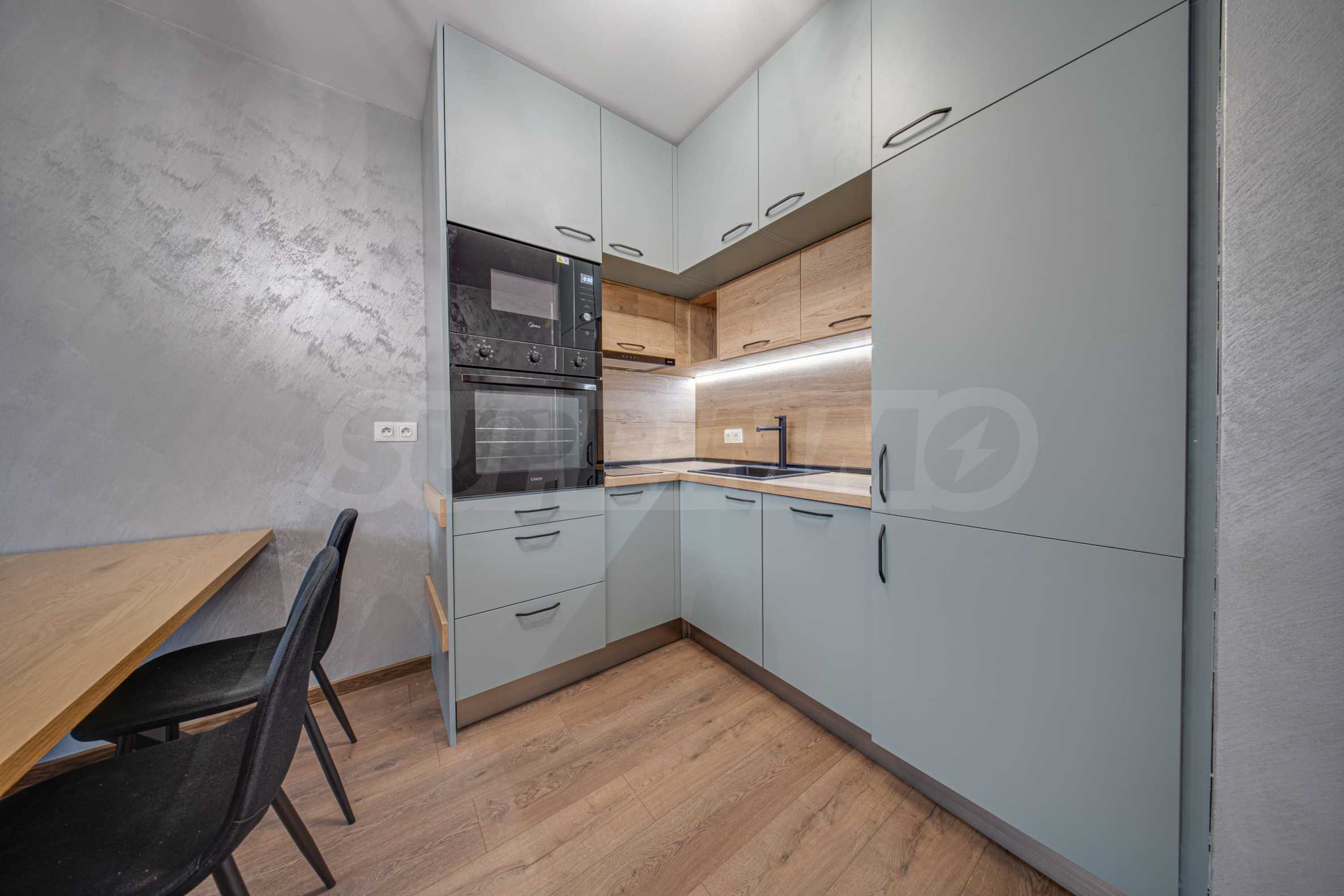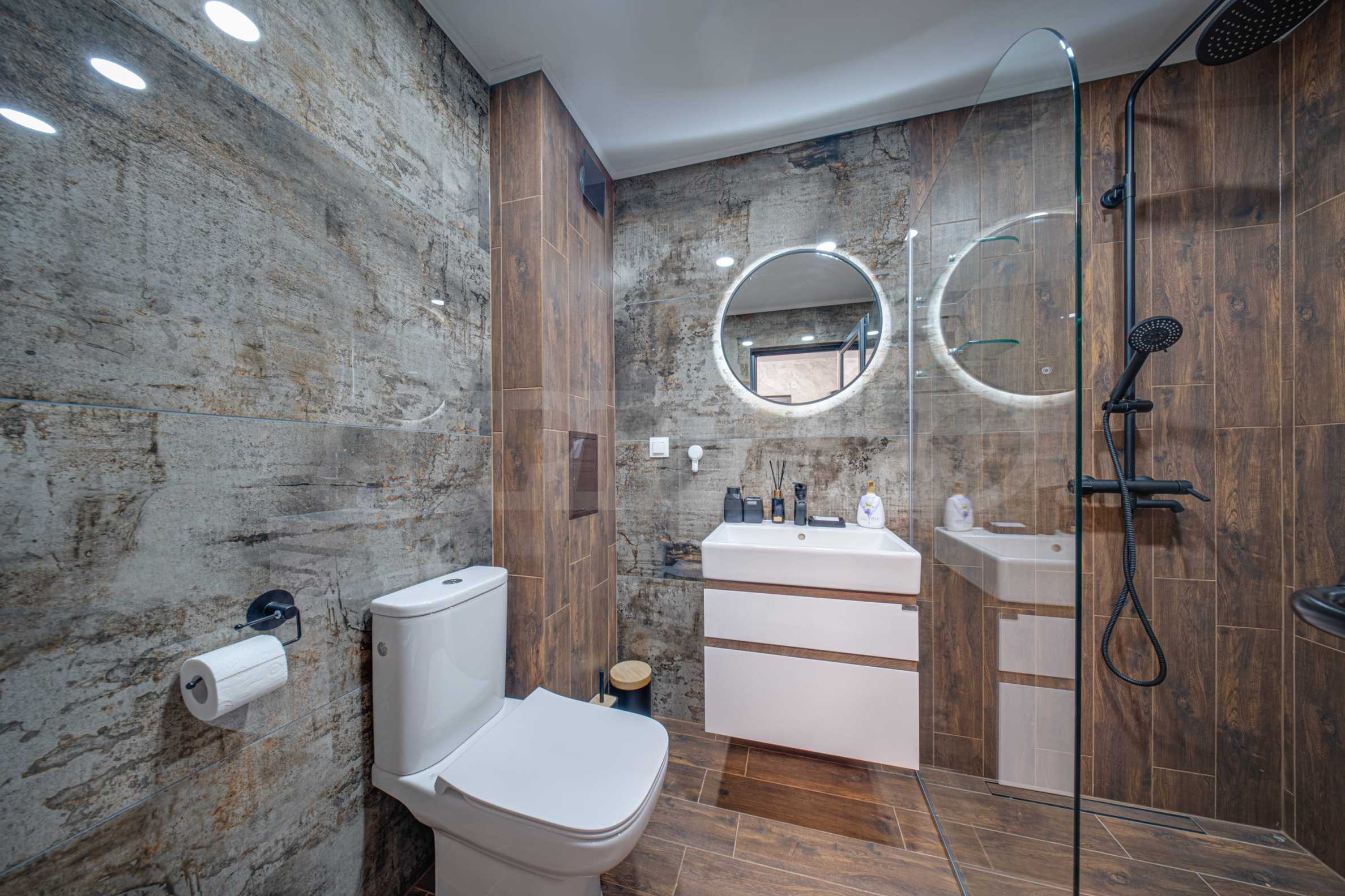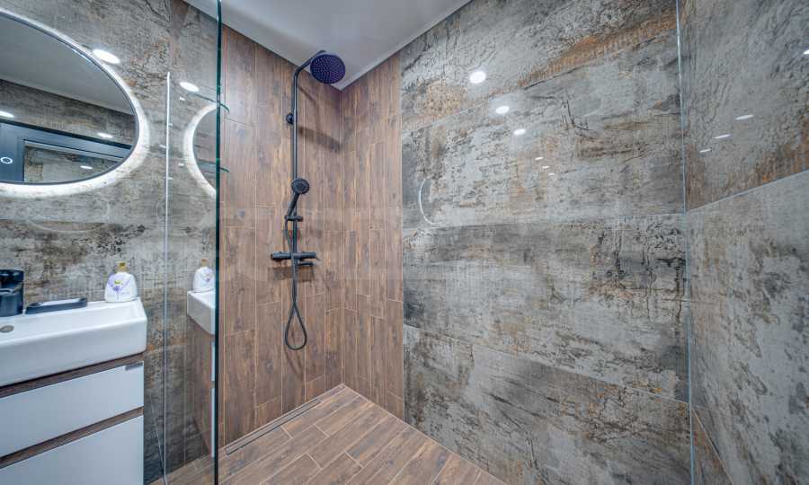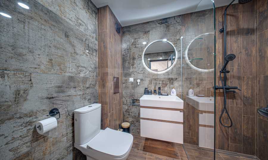 The apartment is fully furnished and equipped: washing machine, dishwasher, oven, refrigerator with freezer, hob, extractor hood, dining table, chairs, upholstered furniture, bed, wardrobes, cabinets, accessories, etc. Finishing works - flooring: high-class laminated parquet and granite tiles; walls - sand plaster, travertine and latex; bathrooms - granite tiles.