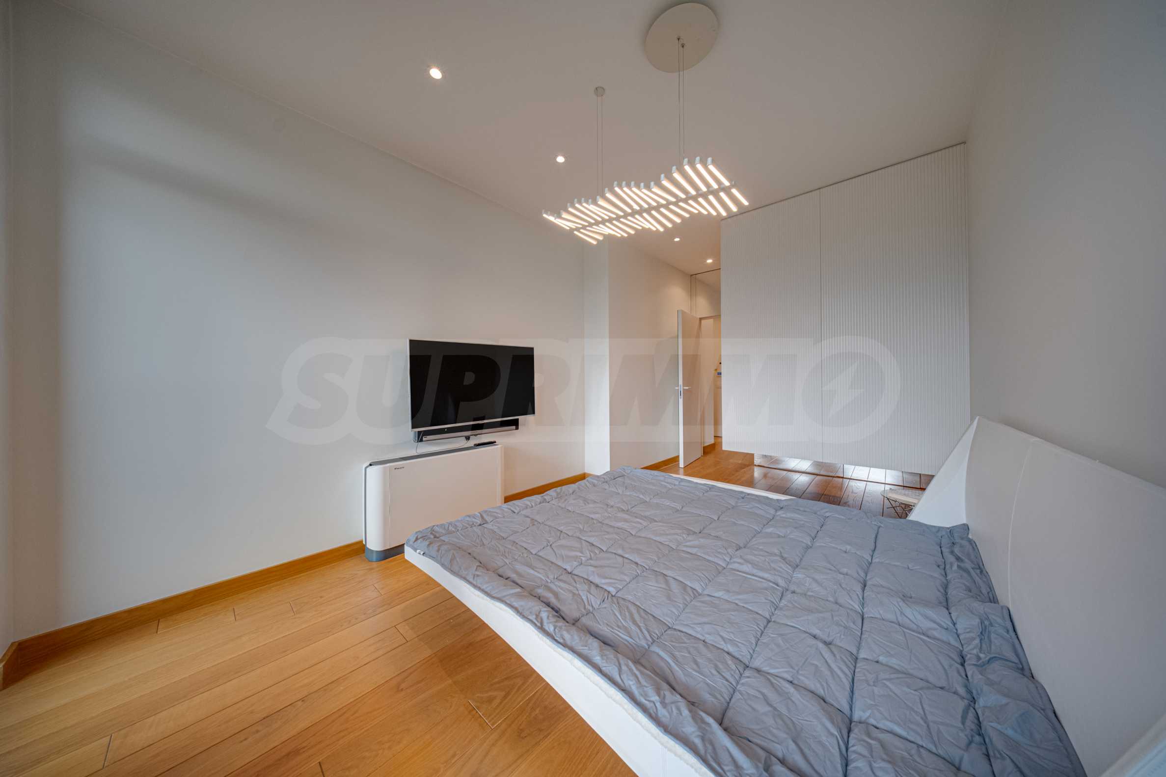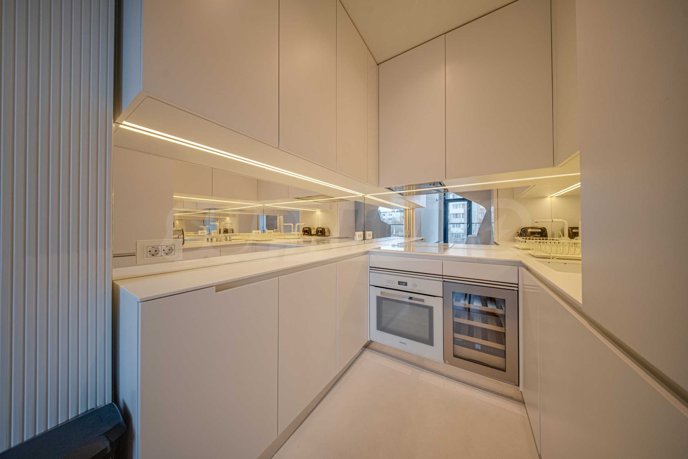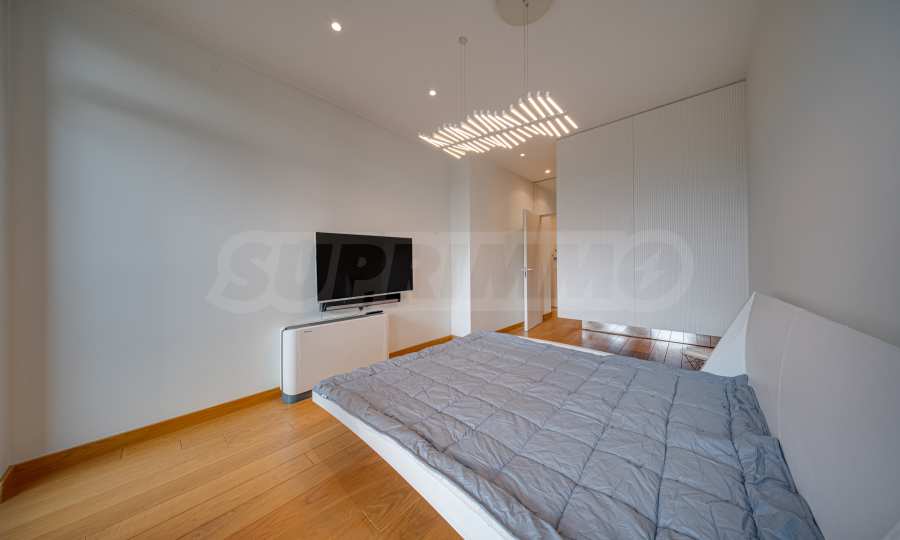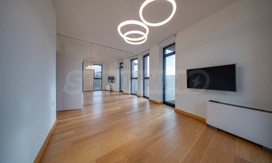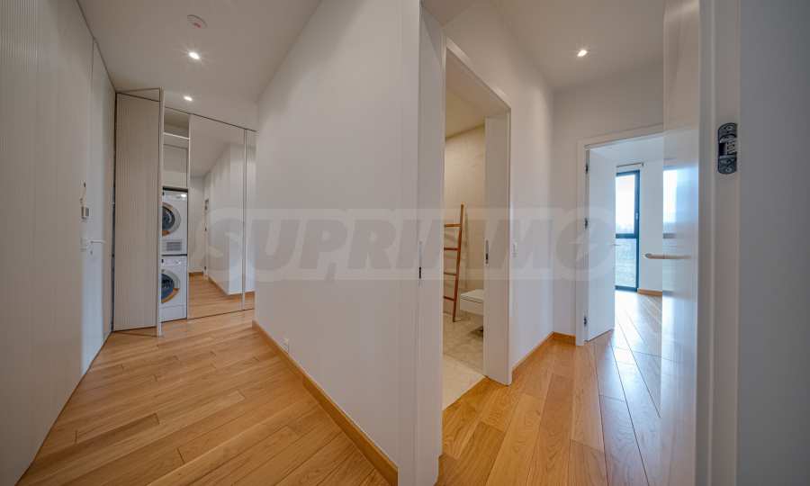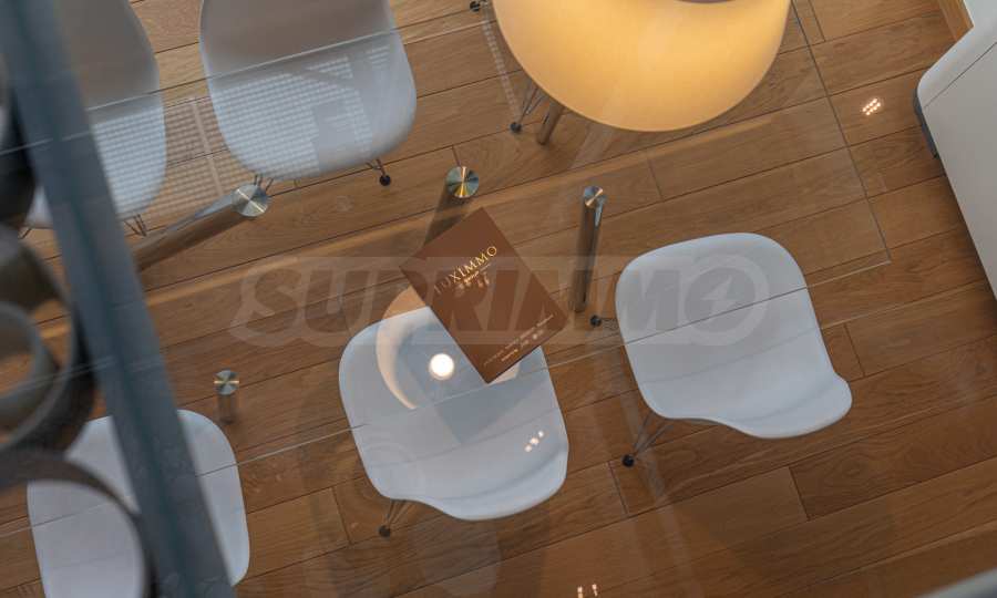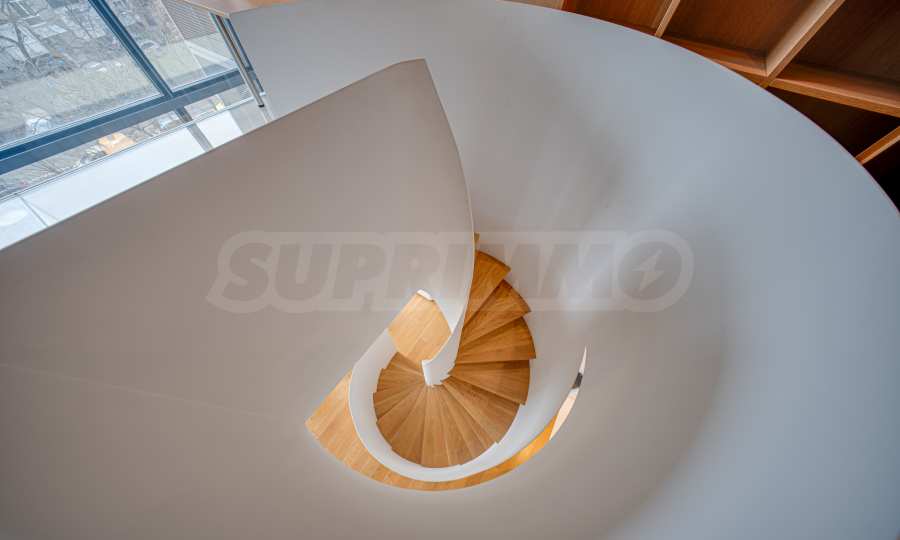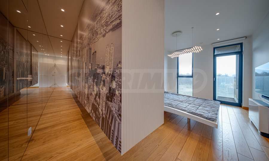 The interior space is organized with elegant and comfortable living in mind. The living area is impressively spacious, with high ceilings and an emporium – a beautiful and functional space that can be transformed into a home office, art corner or cozy library. The furnitures are of high class: furniture from Roche Bobois and Valian, designer Vibra lighting, premium MIELE appliances – every detail has been selected to complement the atmosphere of sophistication.