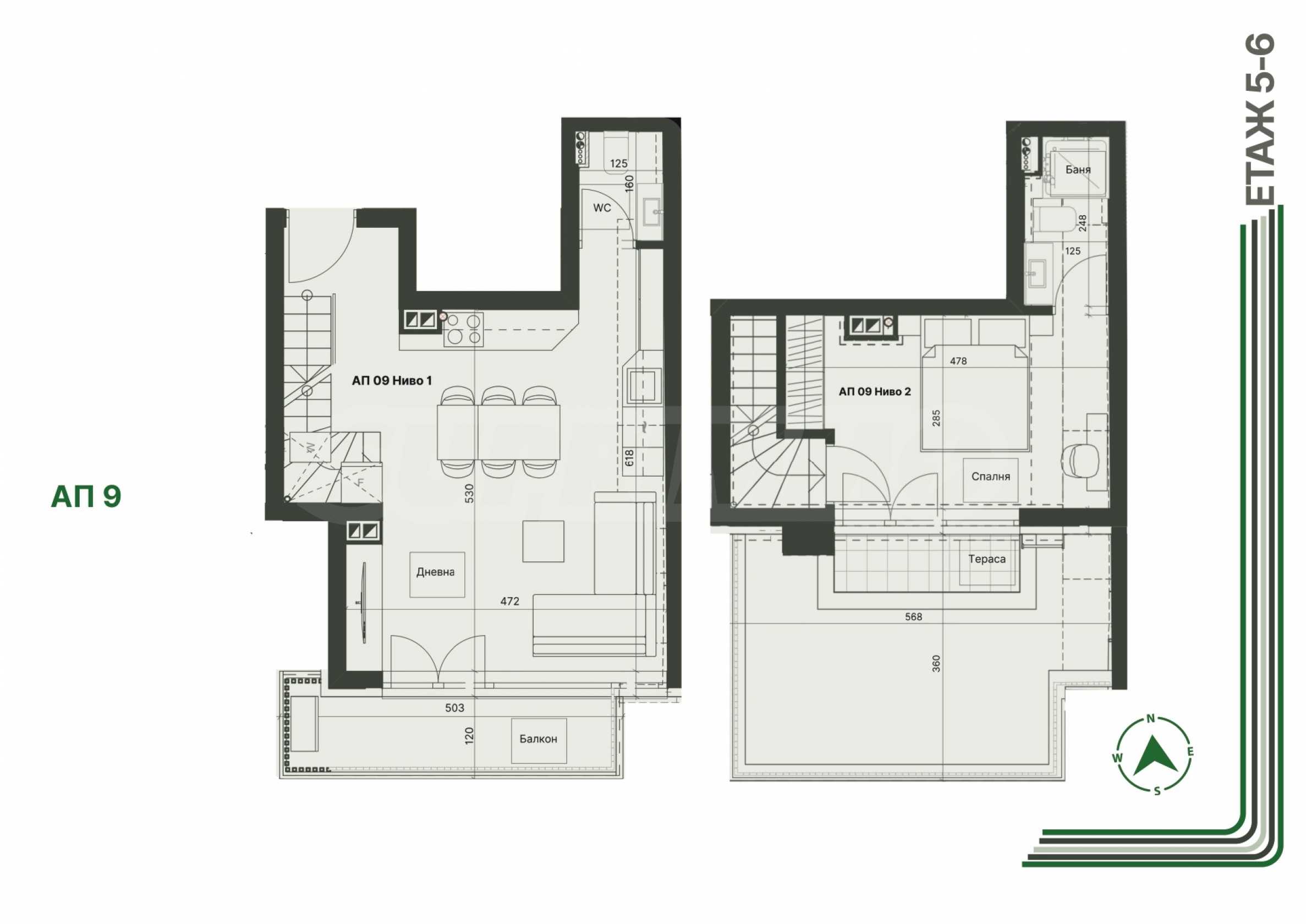 The property is located on the 5th and 6th floor and has a total area of 90.09 m2., net area - 70.46 m2. It is being sold in a state of completion according to Bulgarian Standards, with high-class PVC REHAU joinery, with triple glazing and an armored entrance door. The layout of the first level includes: entrance hall, toilet, living room with kitchen and dining room and with a terrace, internal staircase; on the second level - one bedroom with bathroom and terrace. The apartment has a basement of 4.32 m2.