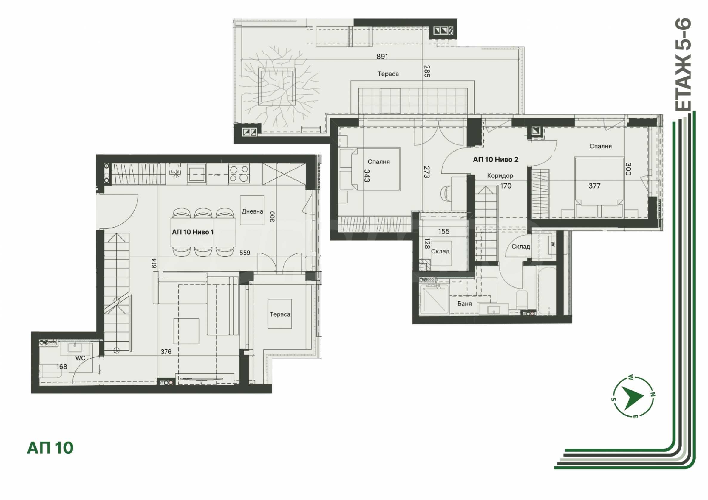 The property is located on the 5th and 6th floor and has a total area of 128.10 m2., net area - 101.40 m2. It is being sold in a state of completion according to Bulgarian Standards, with high-class PVC REHAU joinery, with triple glazing and an armored entrance door. The layout of the first level includes: entrance hall, toilet, living room with kitchen and dining room and with a terrace, internal staircase; on the second level - two bedrooms, one with a closet, bathroom and utility room, terrace. The apartment has a basement of 6.05 m2.