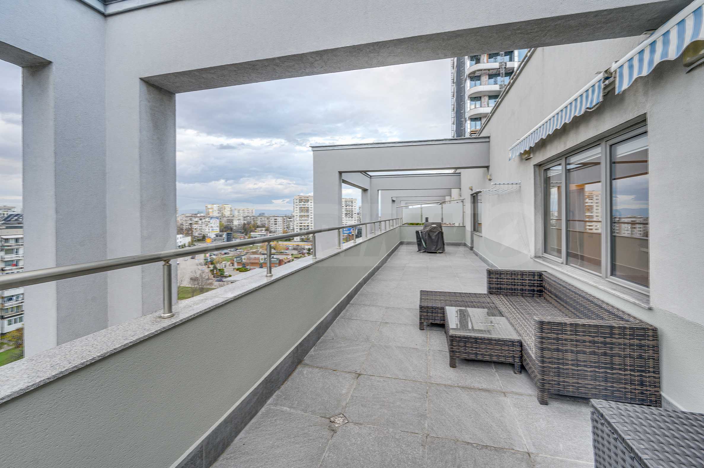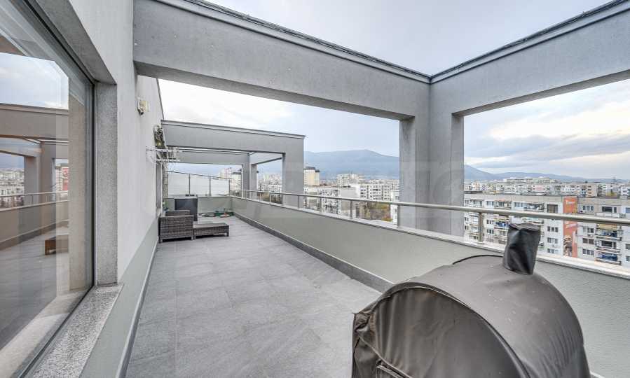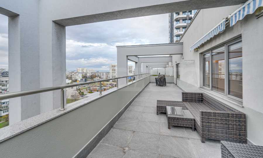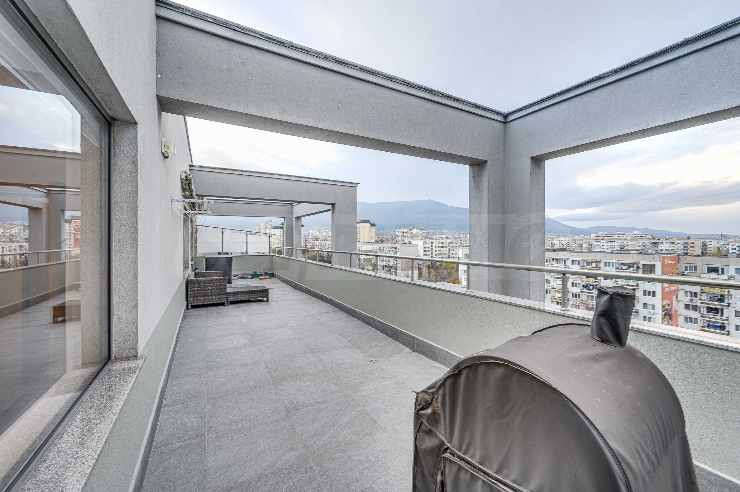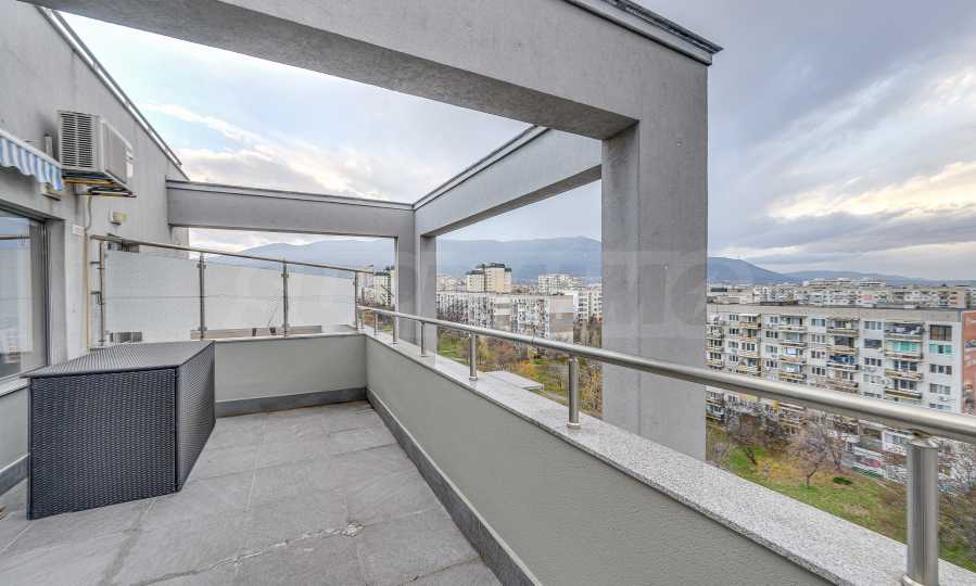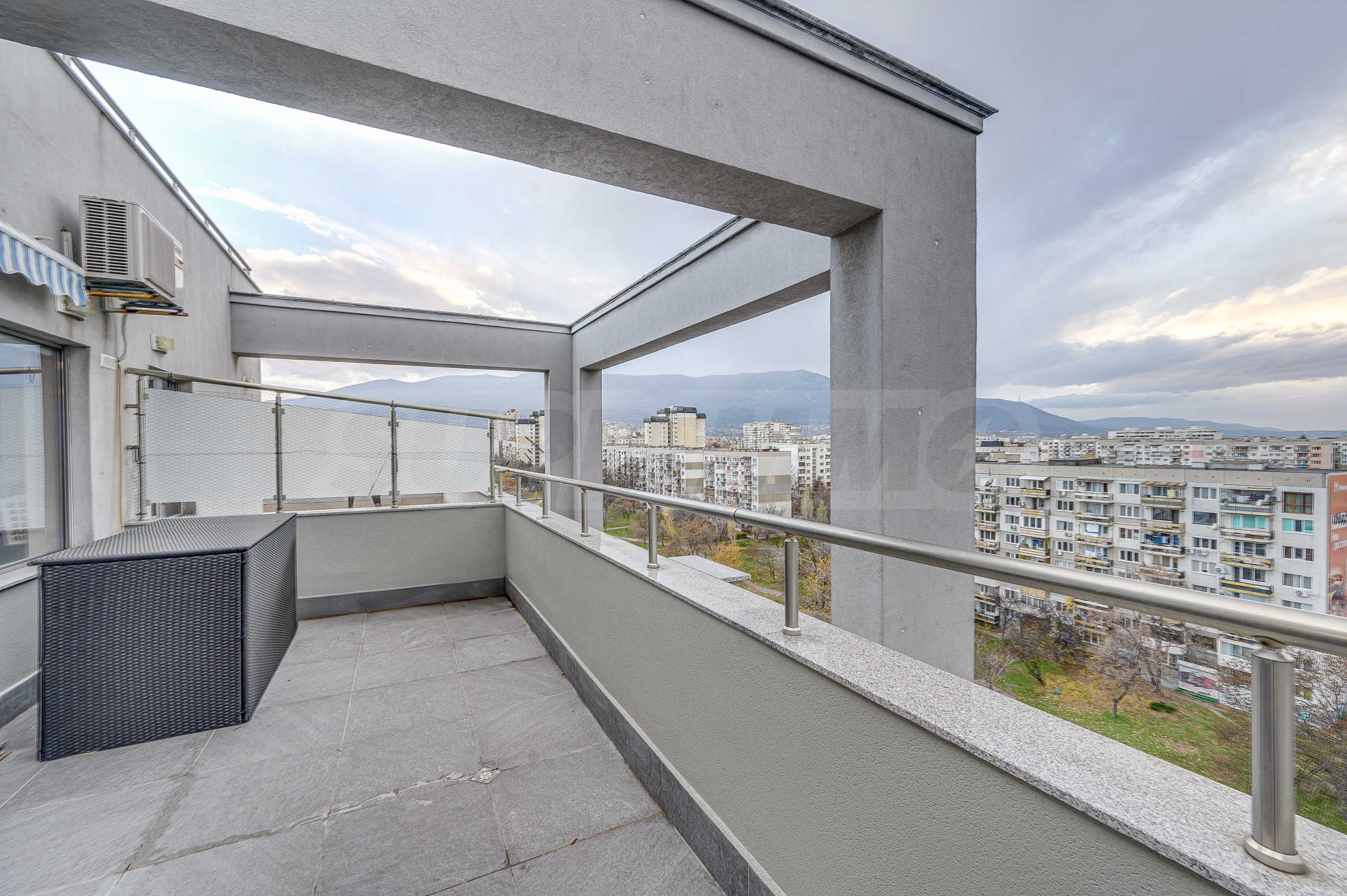 Metro station "Alexander Malinov" is right next to the building. The apartment is located on a high floor (sixth residential floor above offices) with a large panoramic terrace and an unobstructed view of Vitosha Mountain. The terrace has replaced granite tiles. The heating is by central heating with smart thermal heads on the radiators and a high-class inverter air conditioner. The apartment has a basement of 5 m2.