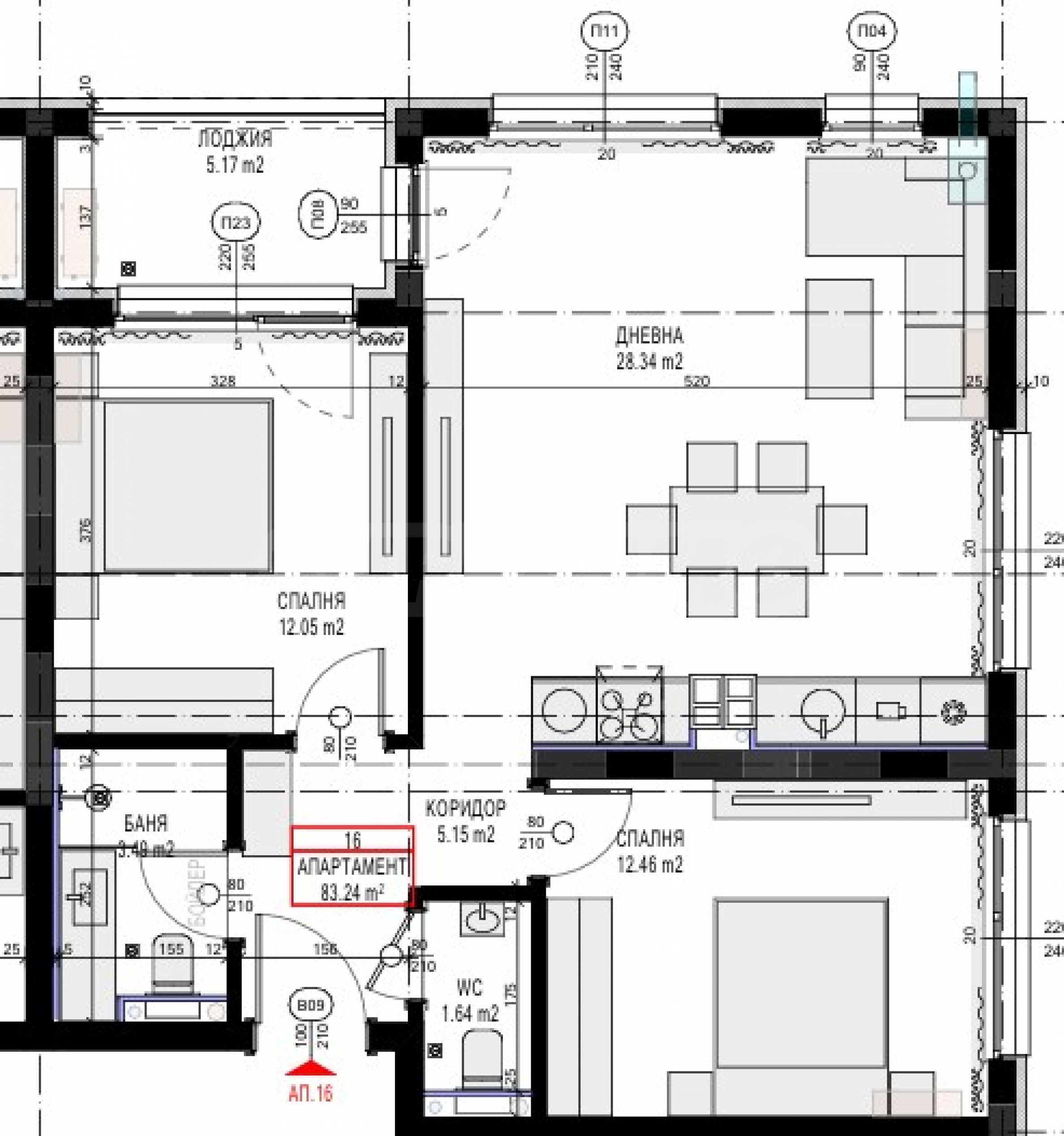 Apartment No. 16 is located on the 2nd floor of the building and has a built-up area of 83.24 m2., with distribution: entrance hall/corridor, bathroom/toilet, separate toilet, living room with kitchen and dining room, first bedroom, loggia with access from both rooms, second bedroom. The apartment has a storage room included in the price - 3.07 m2.