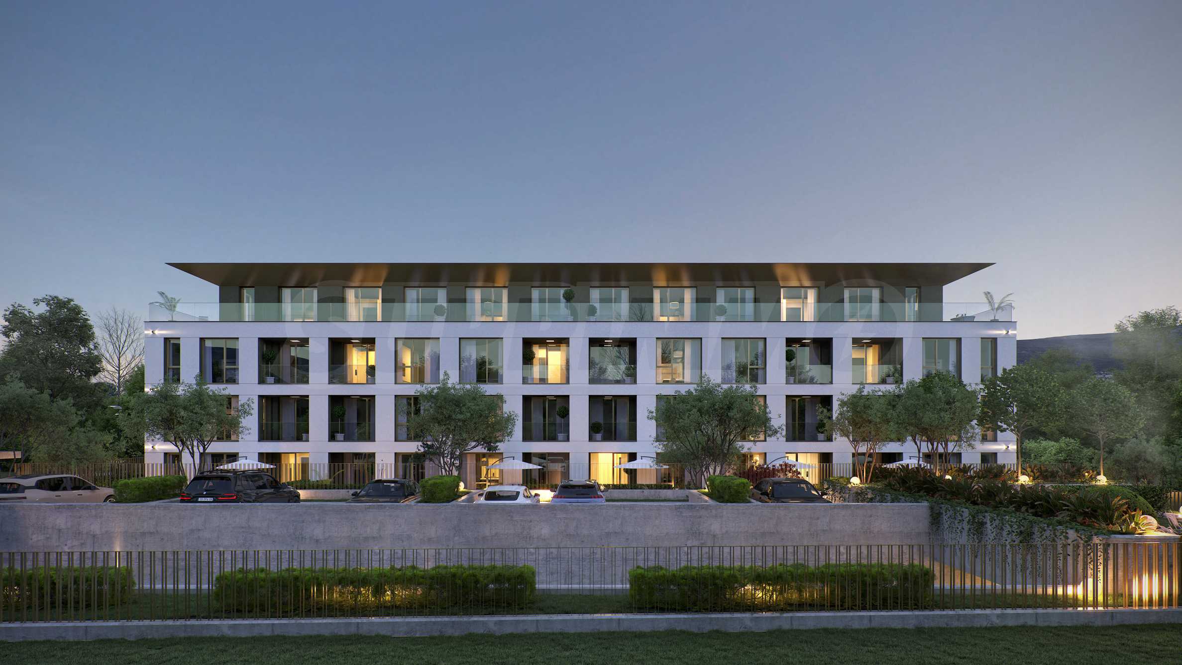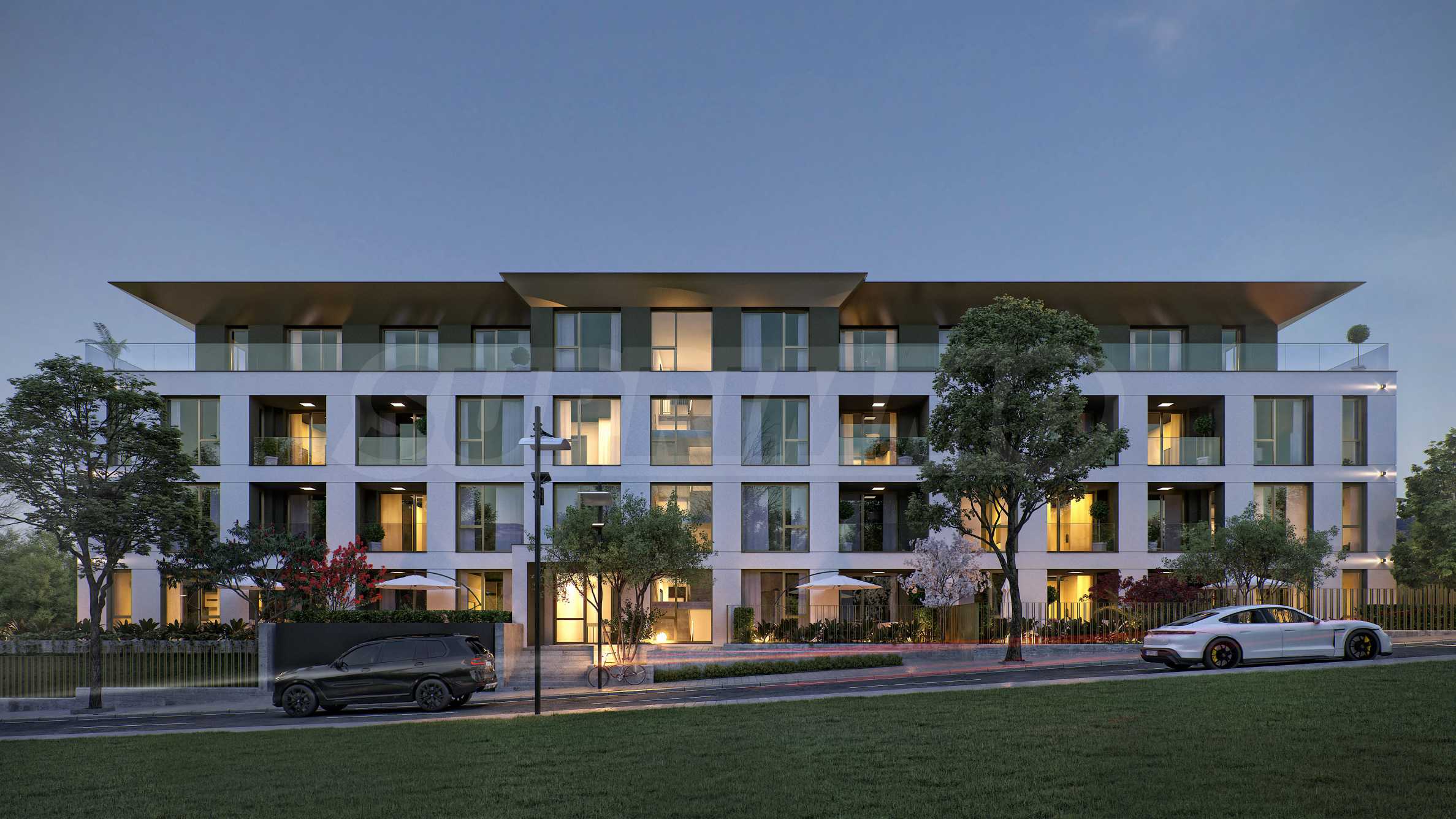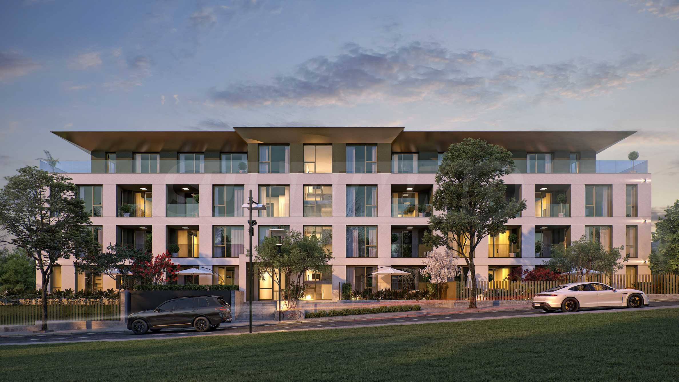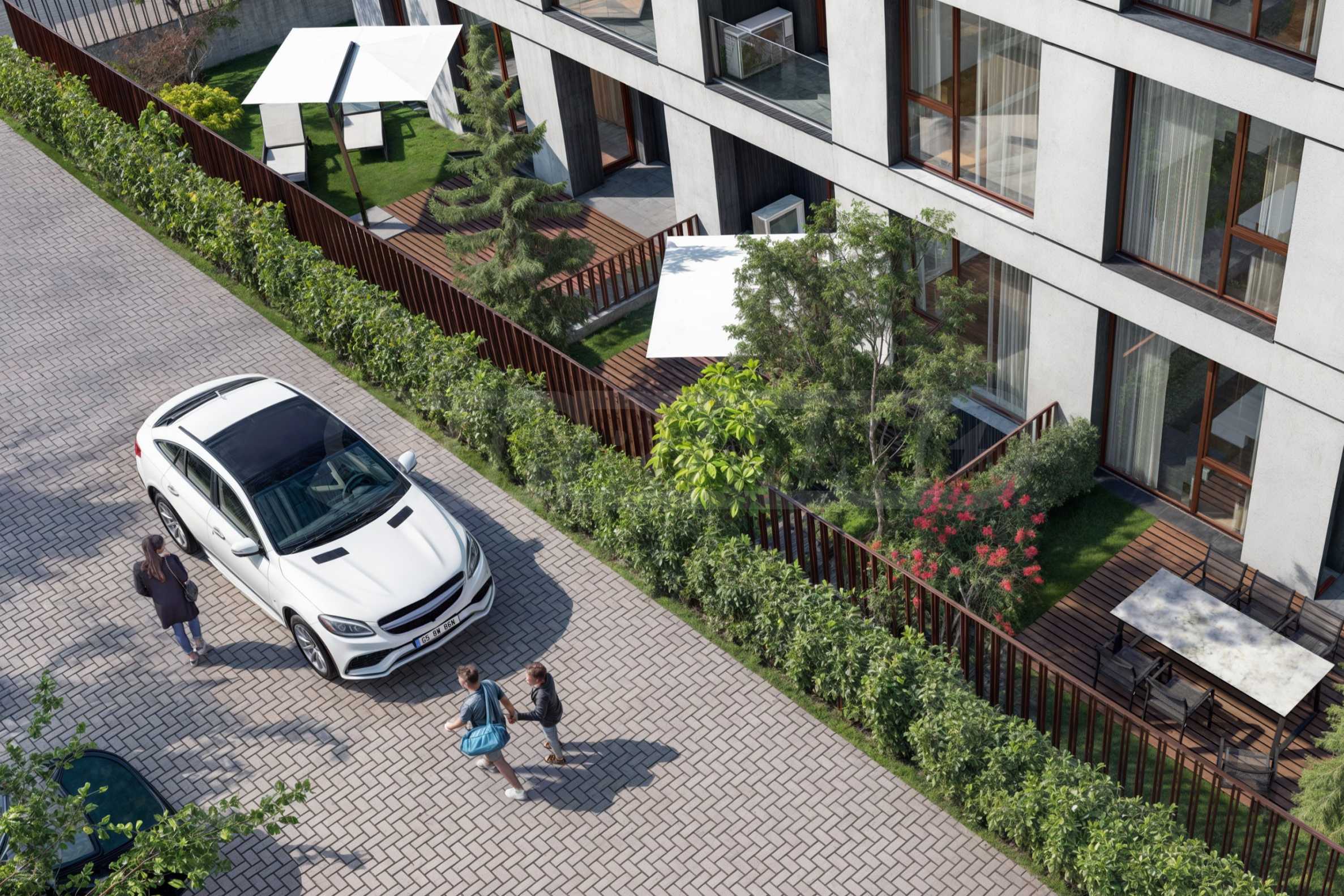 The landscaping is a key element in the overall design of the complex. The spaces around the building include rich vegetation, ornamental trees, shrubs and lawns, which create a sense of harmony and natural environment. Special attention is paid to the green areas with integrated recreation areas, pedestrian alleys, lined with decorative paving and outdoor LED lighting, which highlights the architectural details at night.