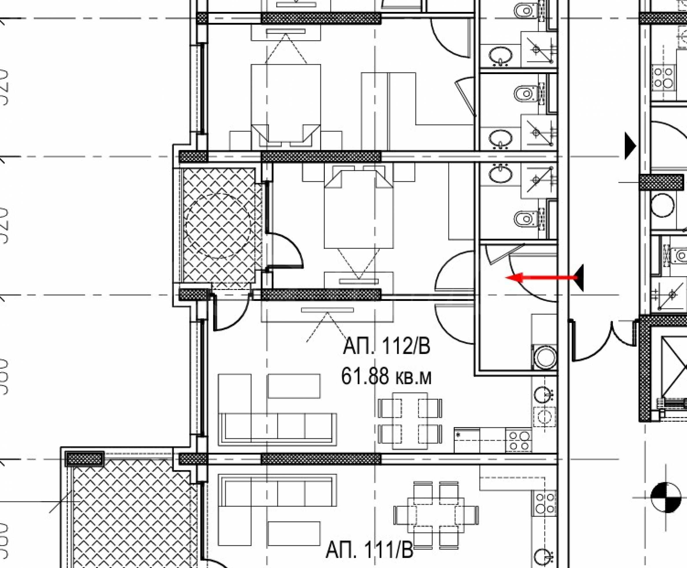 The property is located on the 4th floor and has a total area of 71.50 m2., net area - 61.88 m2., on which are distributed: entrance hall, living room with kitchen, bathroom/toilet, bedroom, terrace with access from both rooms. It is being let in a degree of completion according to Bulgarian Standards, with five-chamber PVC joinery Rehau, with triple glazing and an armored entrance door.
