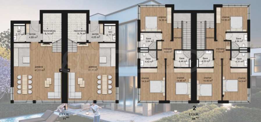 The complex is designed with 39 two-story houses with a total area of 165 m2. to 204 m2., a private yard with an area of 175 m2. to 211 m2. Fully developed infrastructure on the territory, asphalted streets, sidewalks and street lighting, video surveillance of common areas, internet module for remote access control through individual access with a code for each owner.