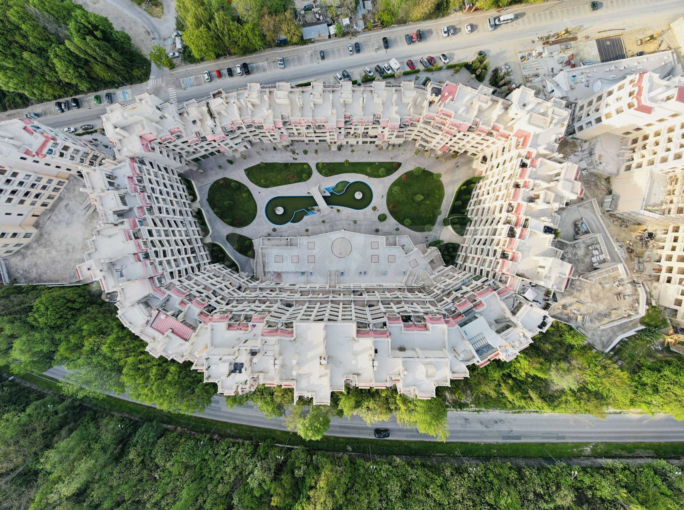 The complex is located on the first line from the sea, being situated on the slope of a hill, with wonderful views of the bay of Varna and the city itself, which are especially enchanting in the evening, when the thousands of lights of the city shine. In the immediate vicinity is the new fishing port with a capacity of 116 vessels and a pedestrian promenade with a length of about 100 meters.