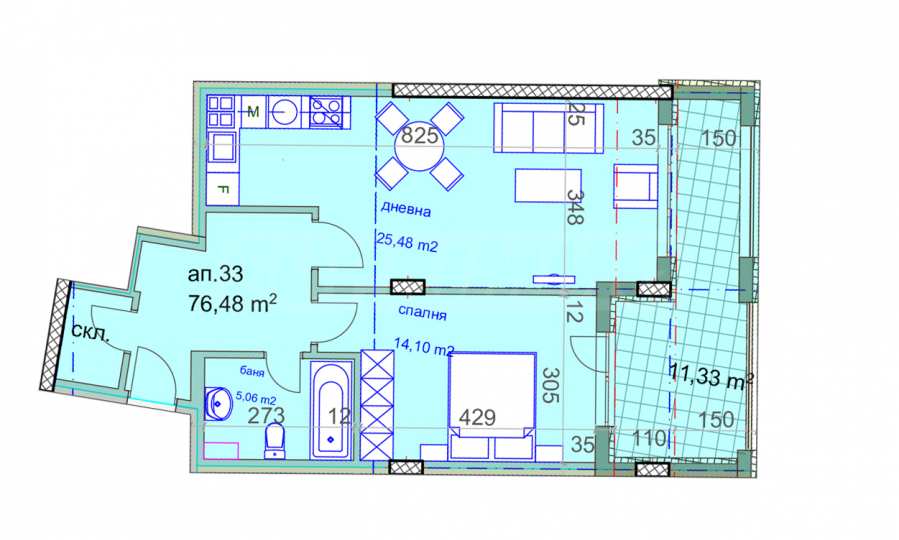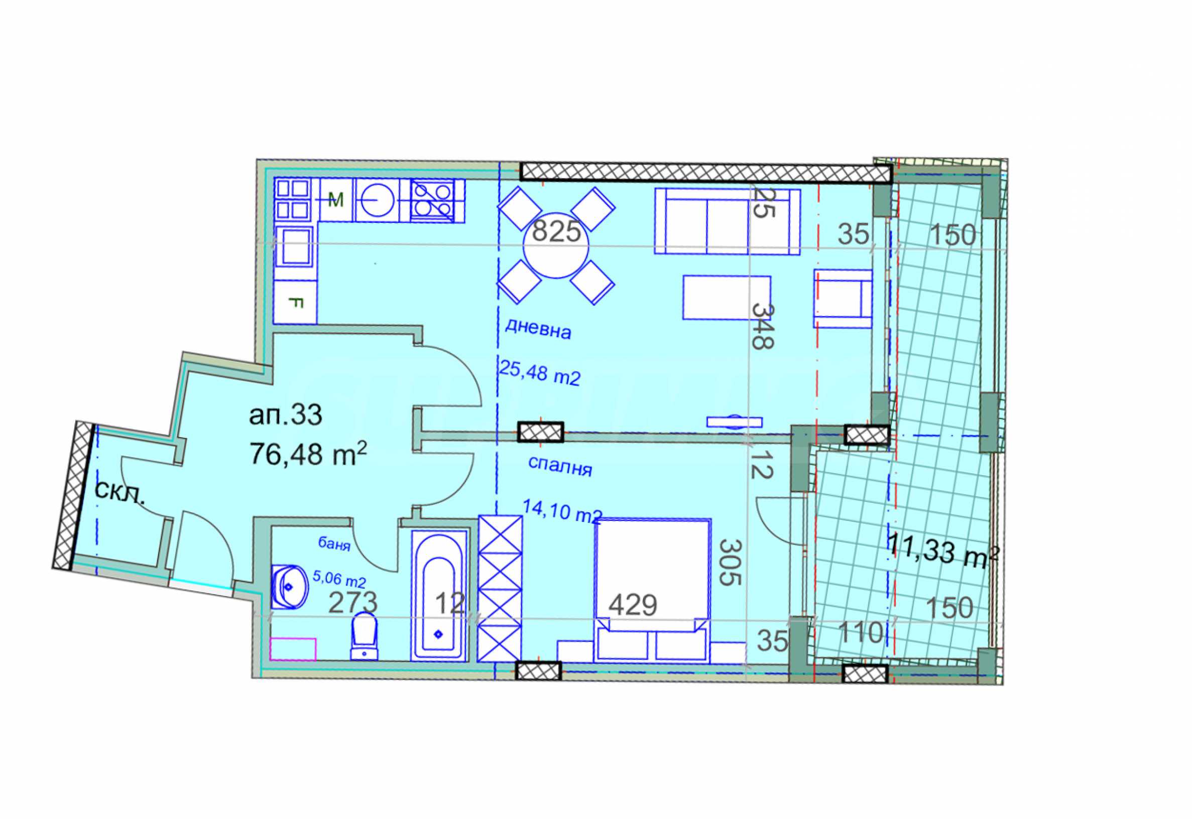 - 11.33 m2 (south) – Terrace that looks straight at Vitosha Mountain — the place where snowy peaks in winter and green slopes in summer create a picture that seems to be painted just for you.