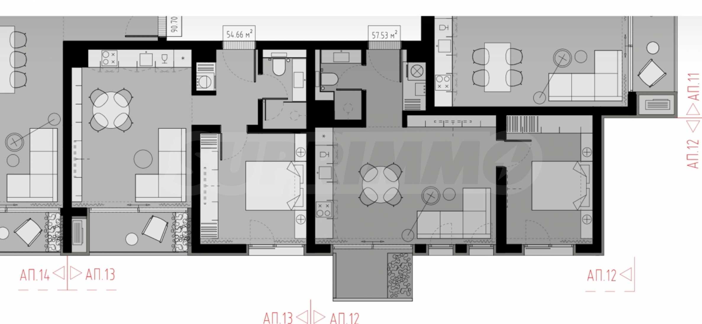 • apt.12: Area 66.32 m2./ net area 57.53 m2. Distribution: Entrance hall, bathroom with shower, utility room with storage, living room with kitchenette and terrace, bedroom;
