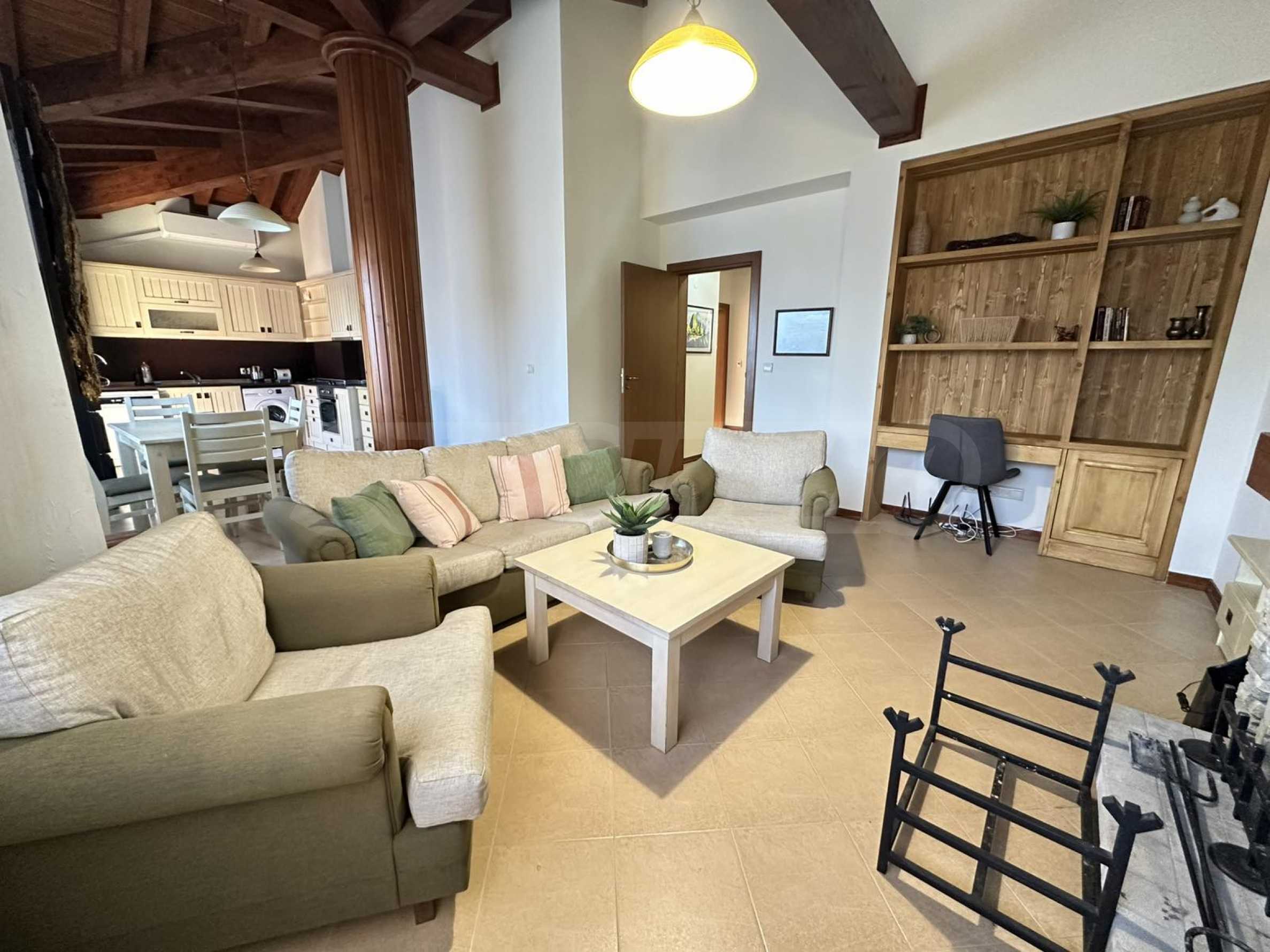 • Living room with two sofas, coffee table, TV, dining table, 4 dining chairs, fireplace and balcony with beautiful panoramic views;