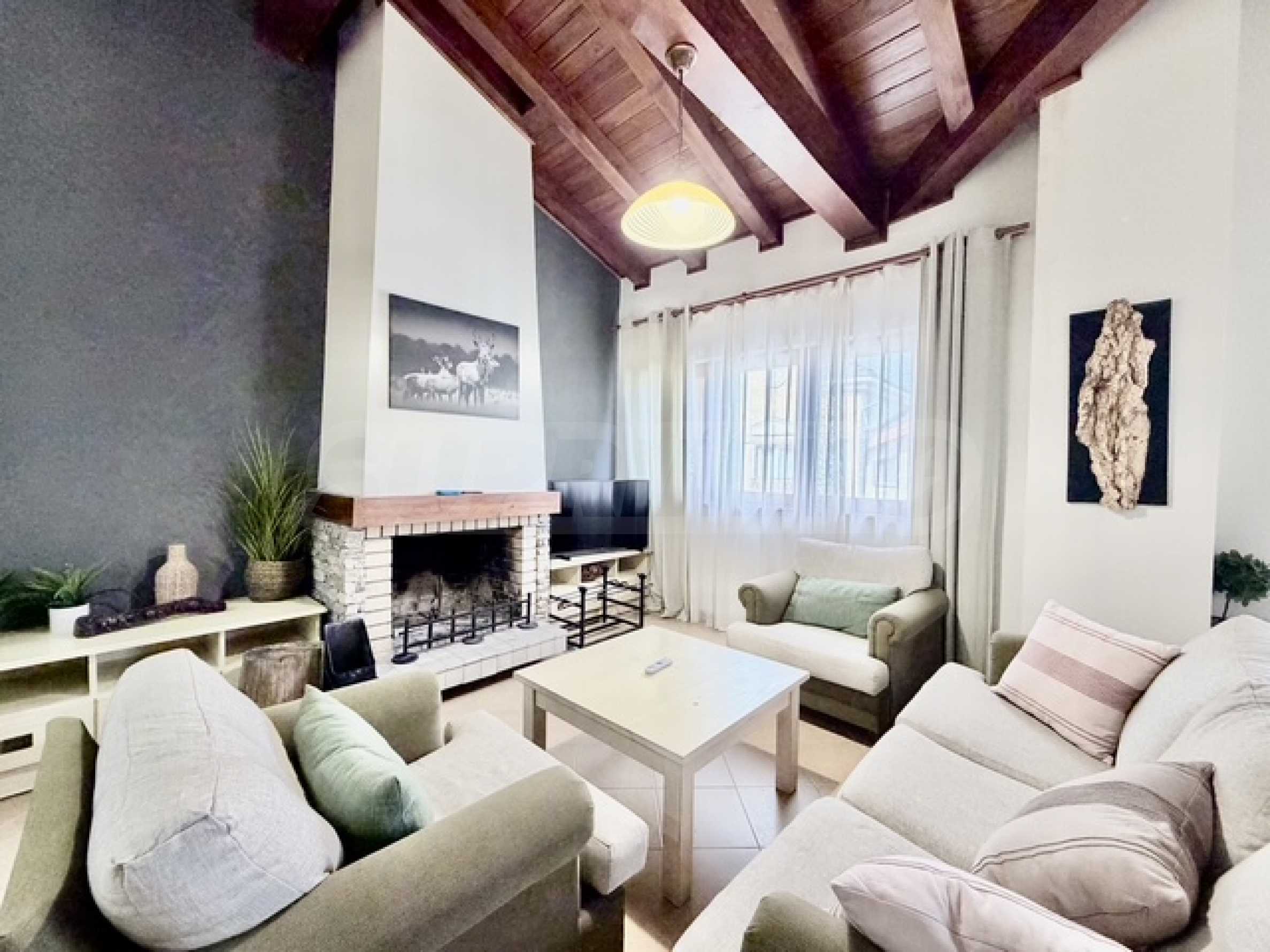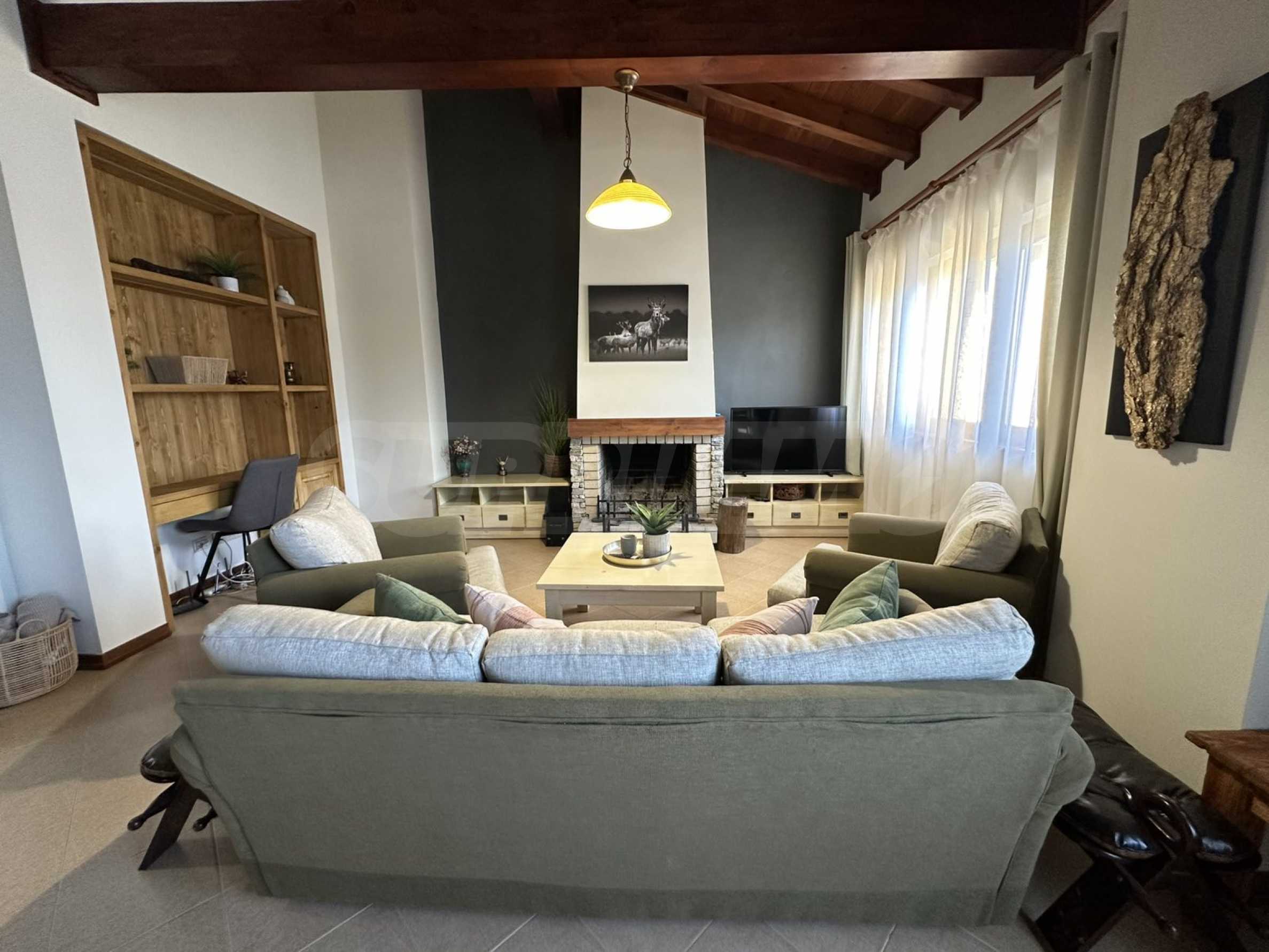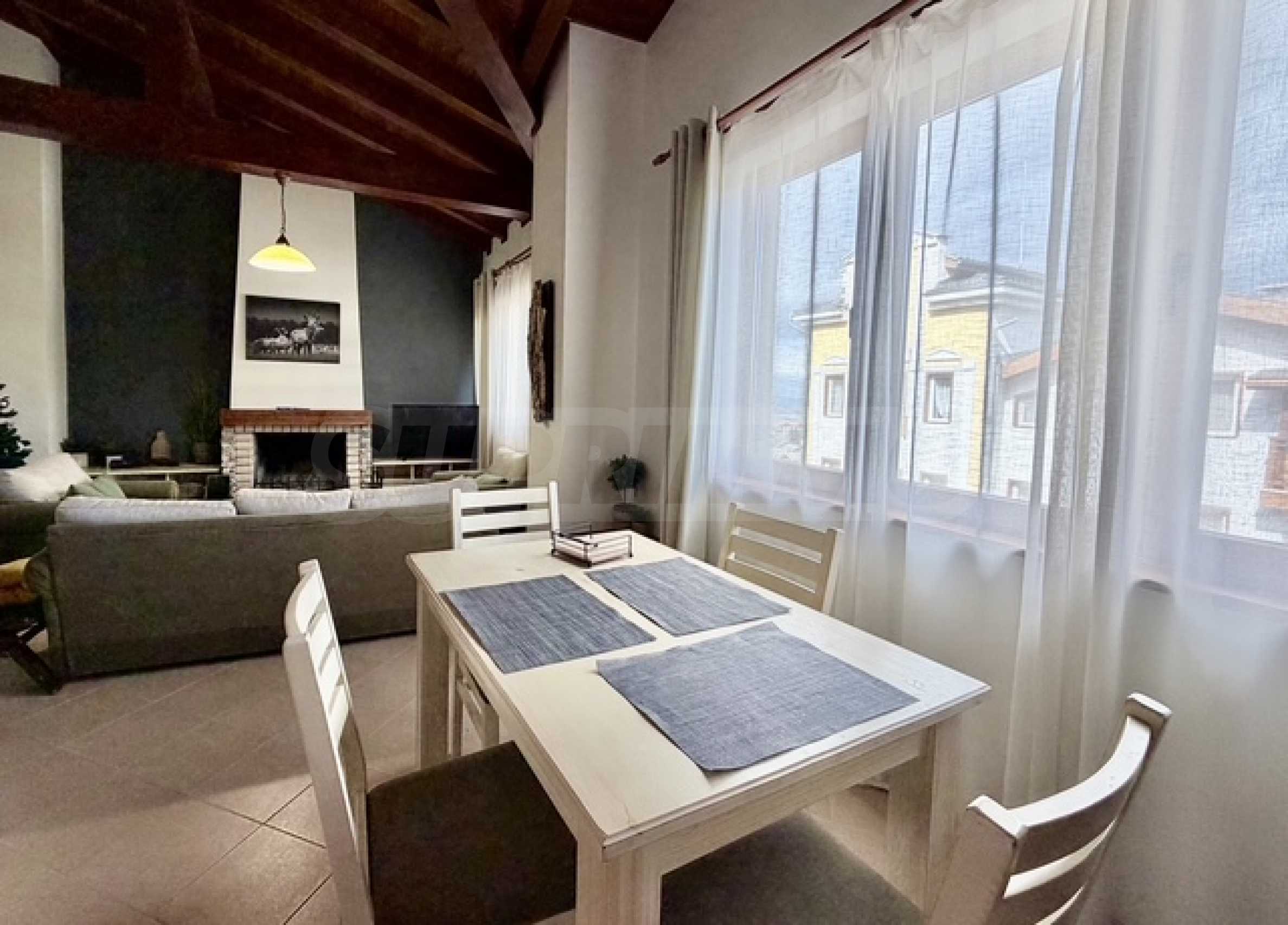 • Living room with two sofas, coffee table, TV, dining table, 4 dining chairs, fireplace and balcony with beautiful panoramic views;