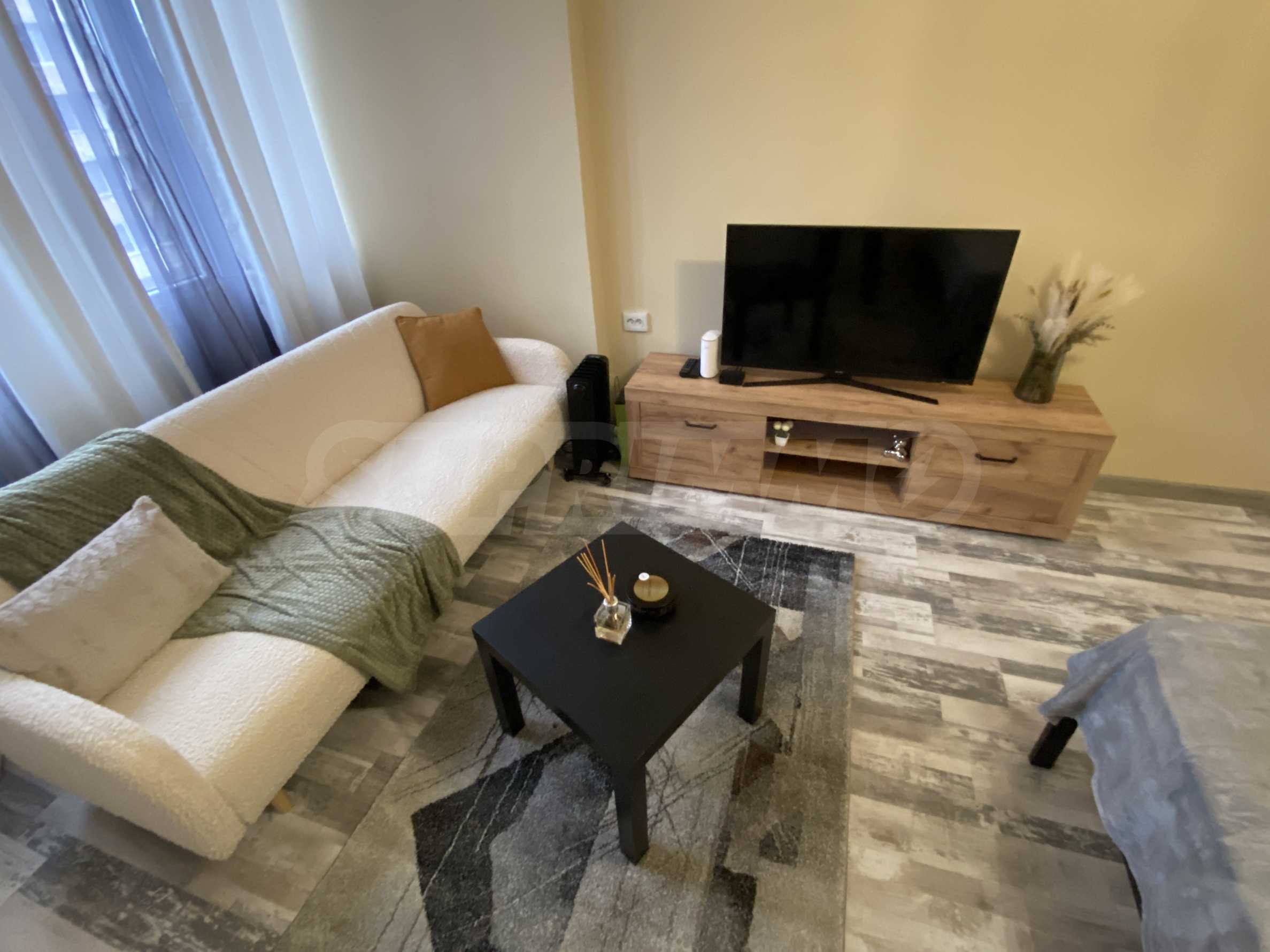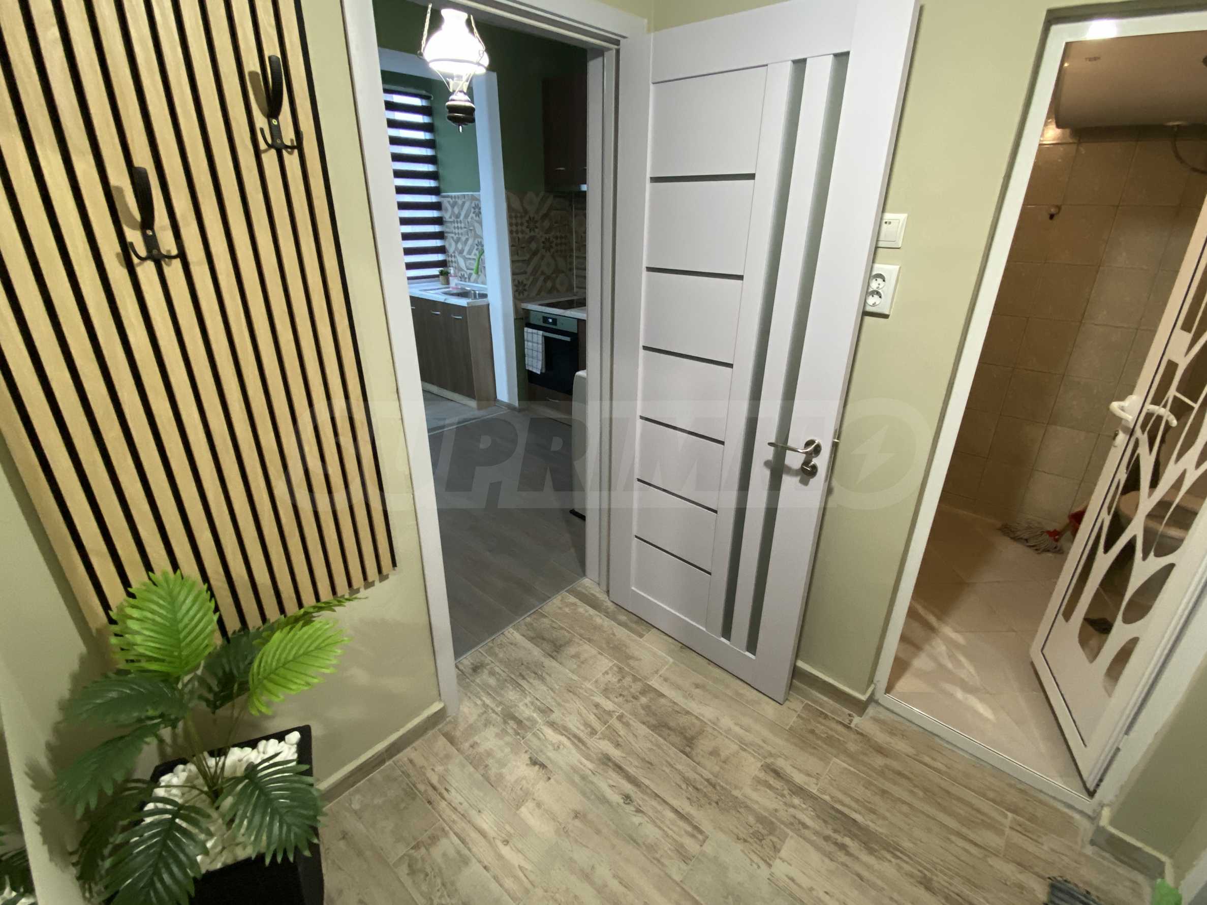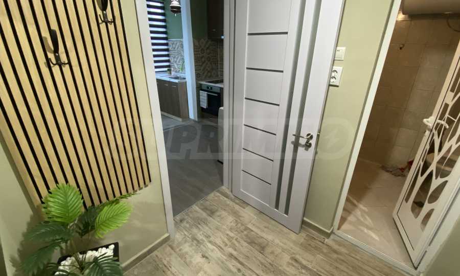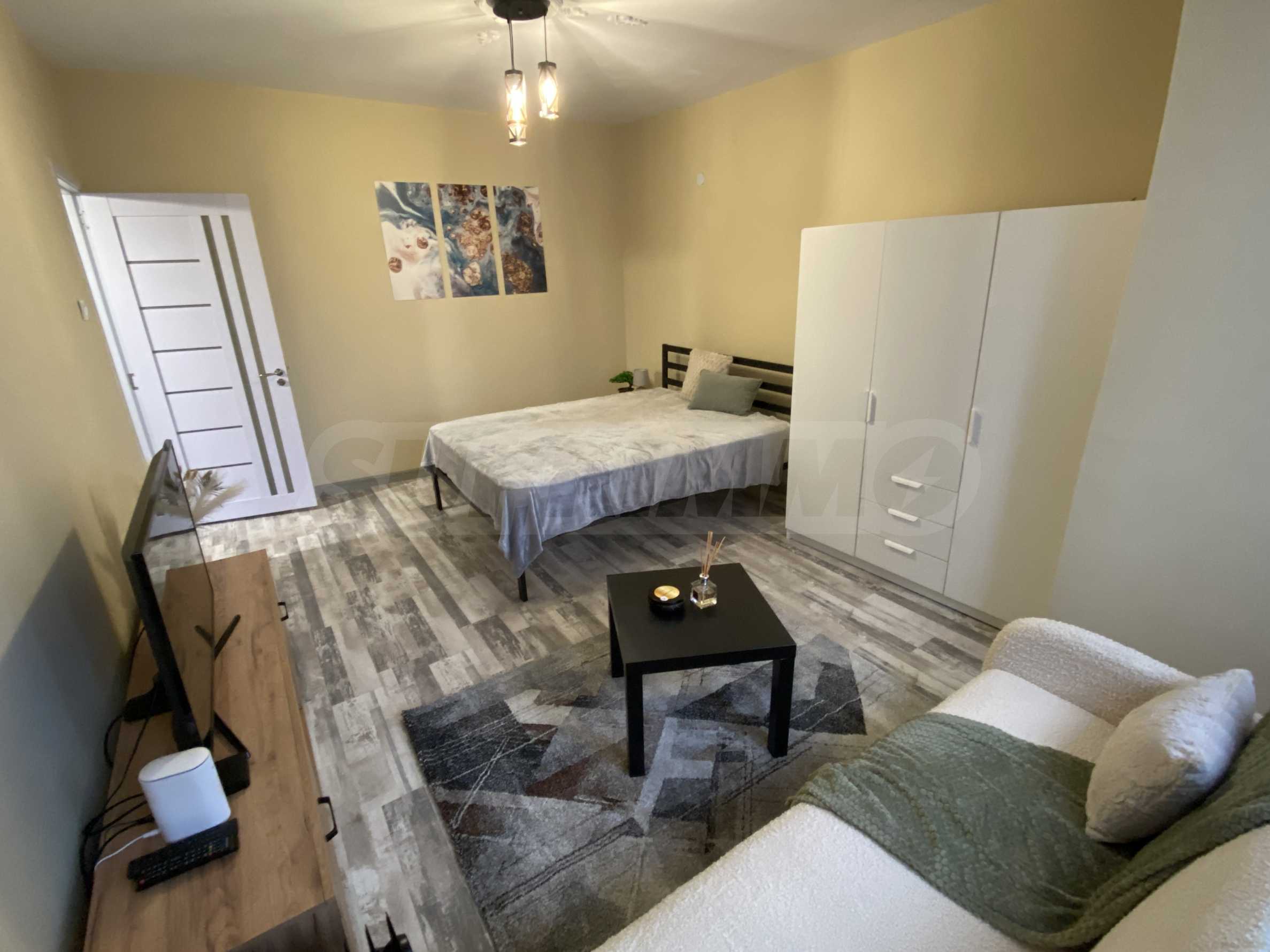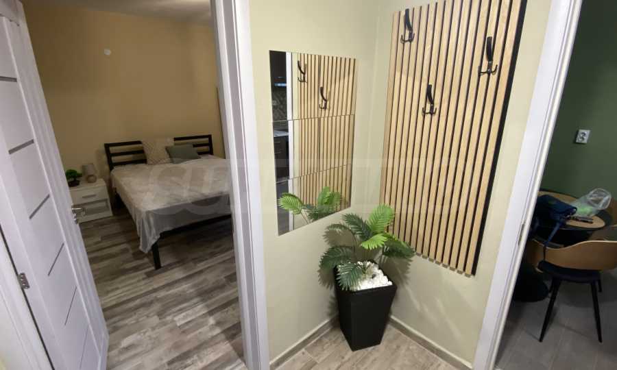 It has a functional layout and includes an entrance hall, a kitchen with a terrace, a living area with soft furnishings, and a double bed. The apartment has been fully renovated and furnished with new, modern furniture and appliances to ensure the comfort of its residents.
