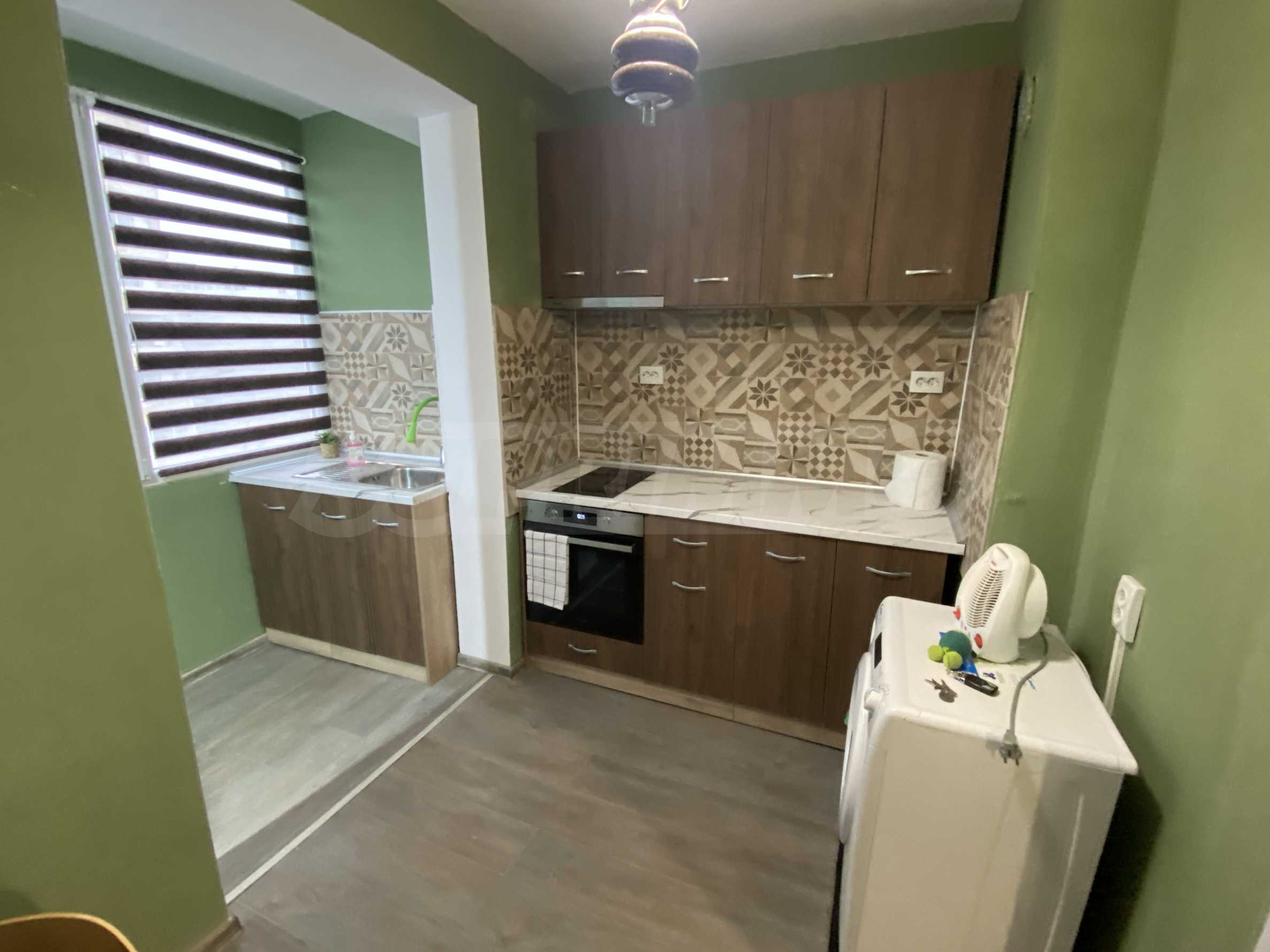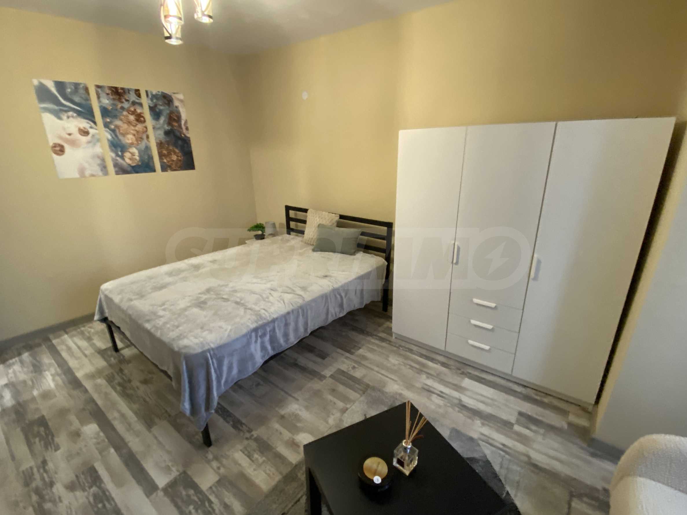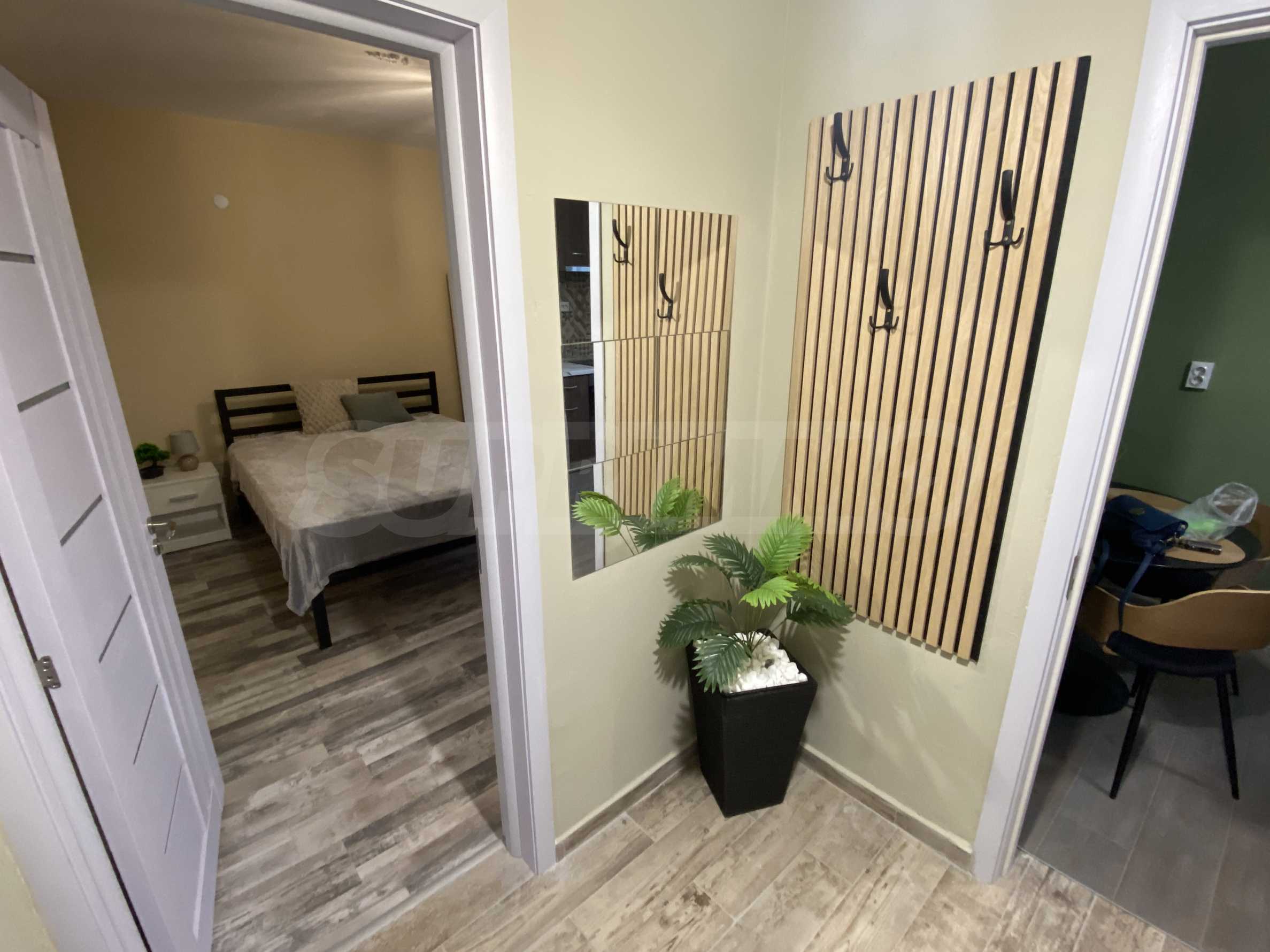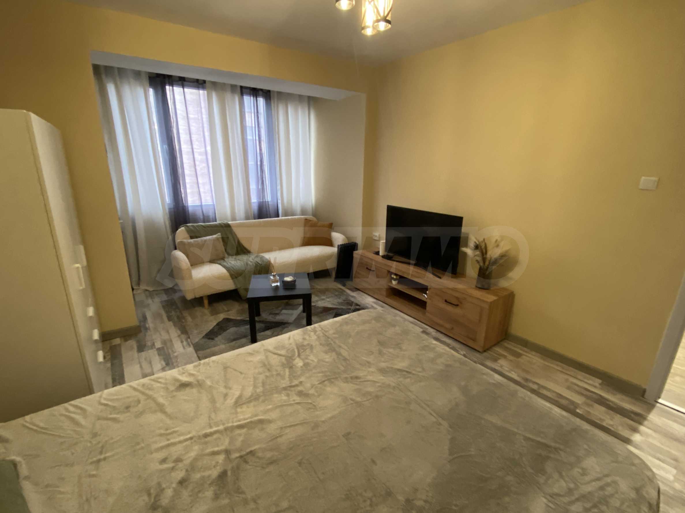It has a functional layout and includes an entrance hall, a kitchen with a terrace, a living area with soft furnishings, and a double bed. The apartment has been fully renovated and furnished with new, modern furniture and appliances to ensure the comfort of its residents.