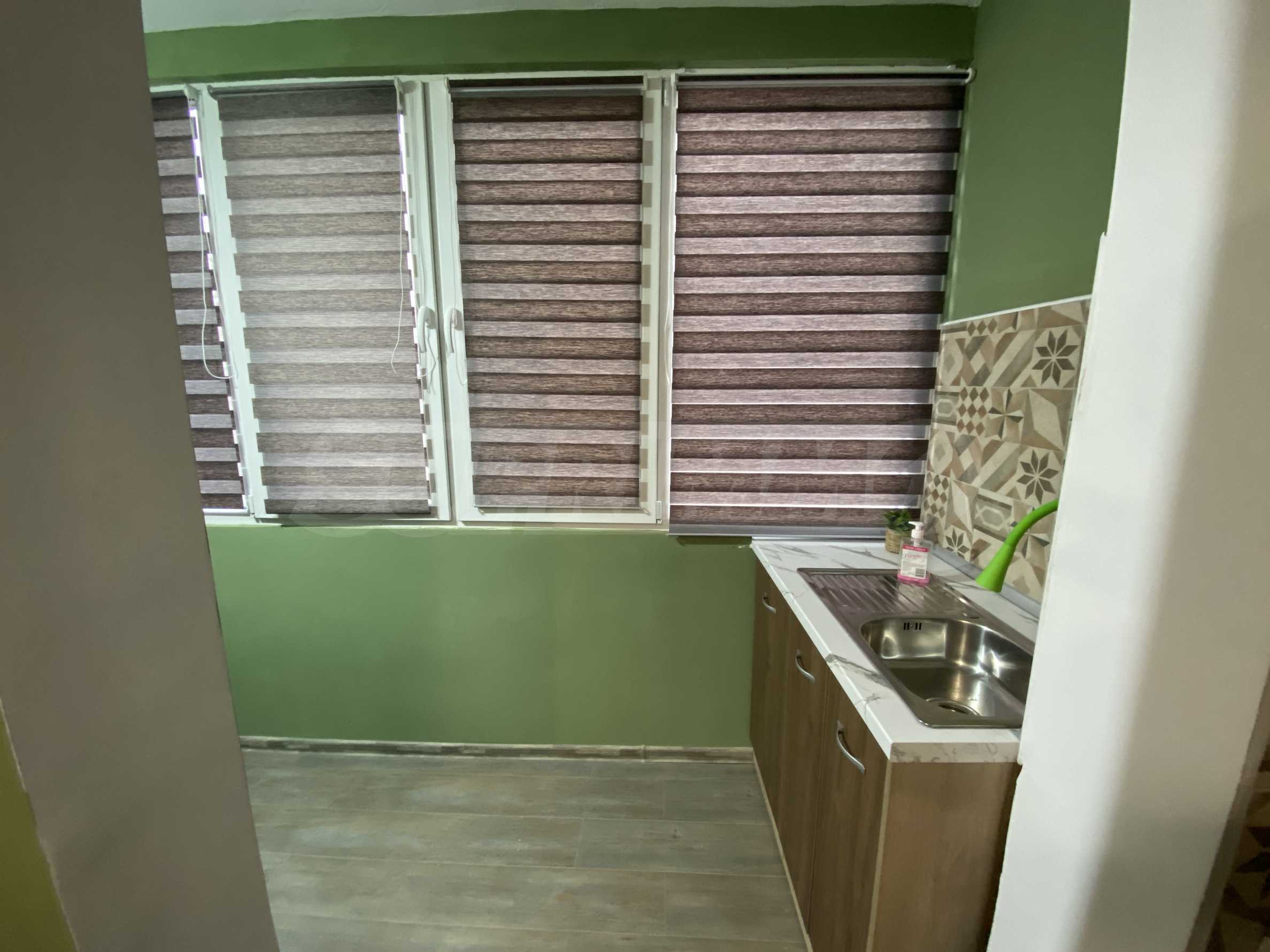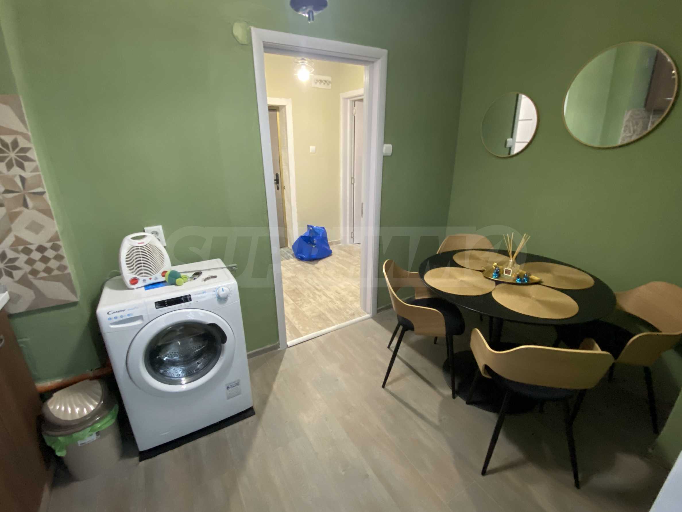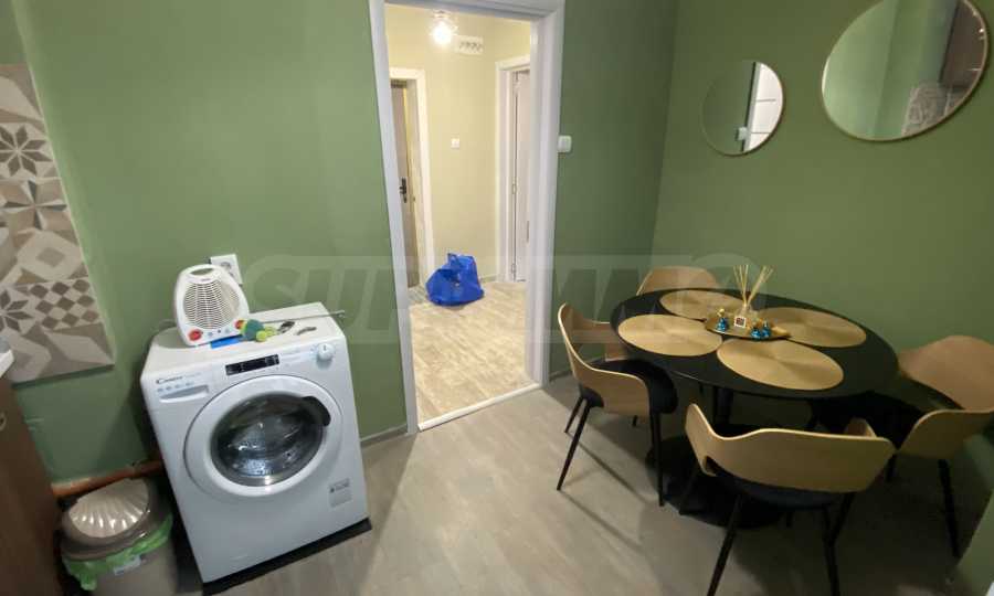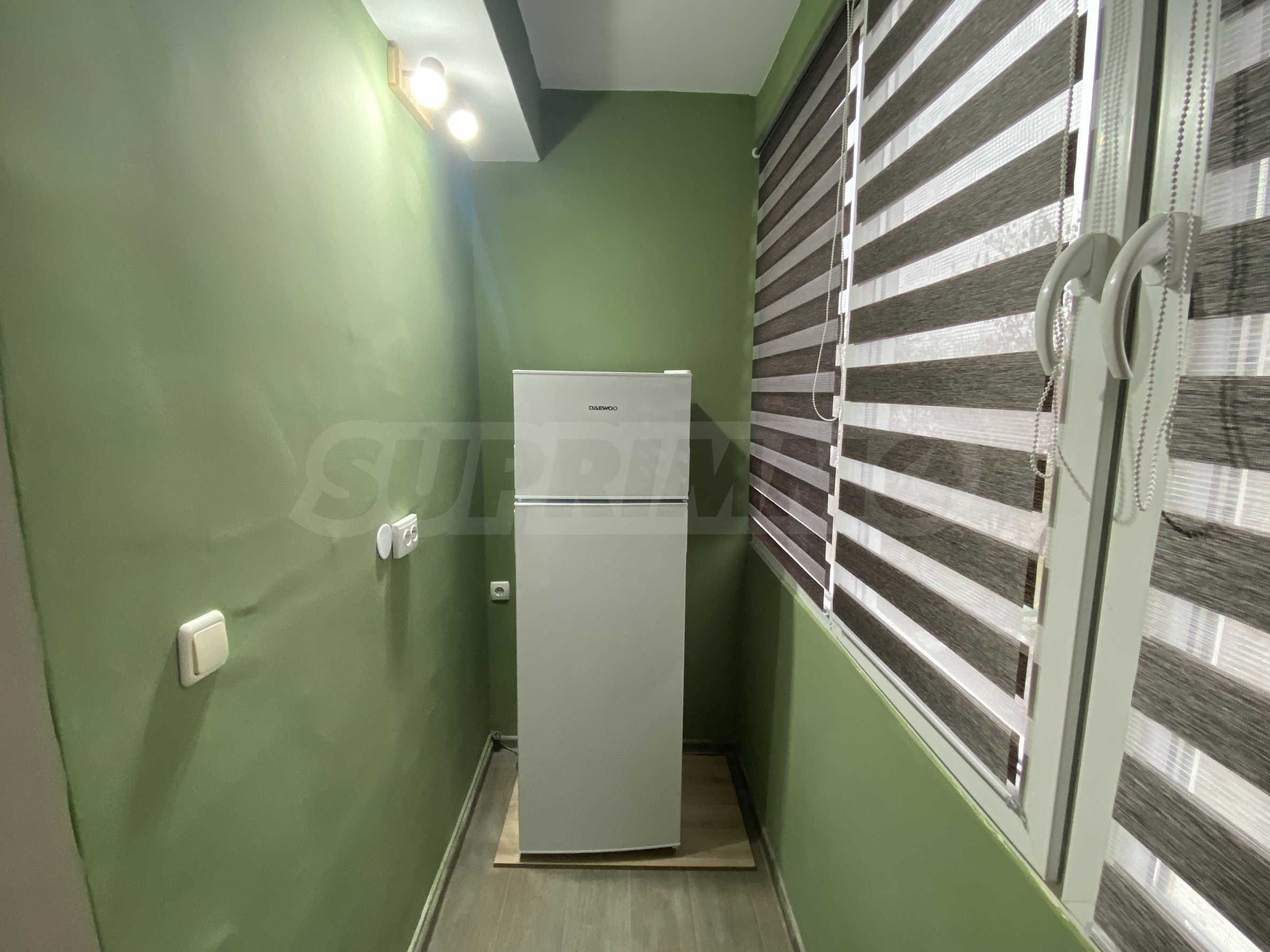 It has a functional layout and includes an entrance hall, a kitchen with a terrace, a living area with soft furnishings, and a double bed. The apartment has been fully renovated and furnished with new, modern furniture and appliances to ensure the comfort of its residents.