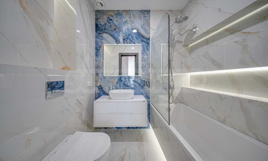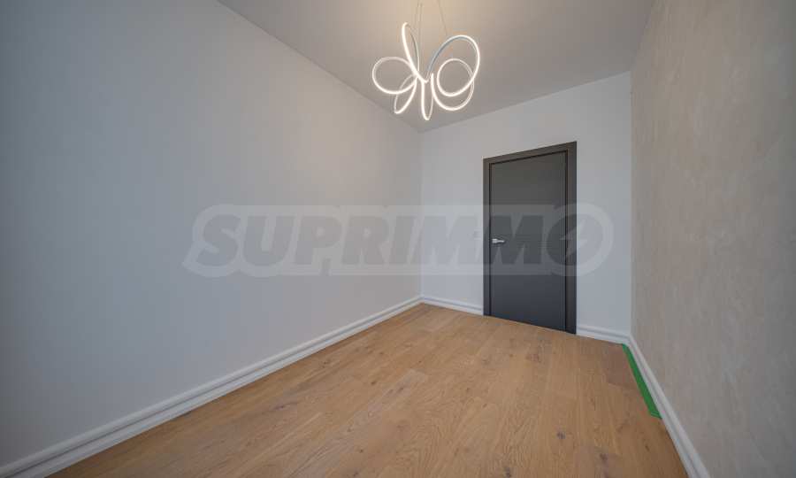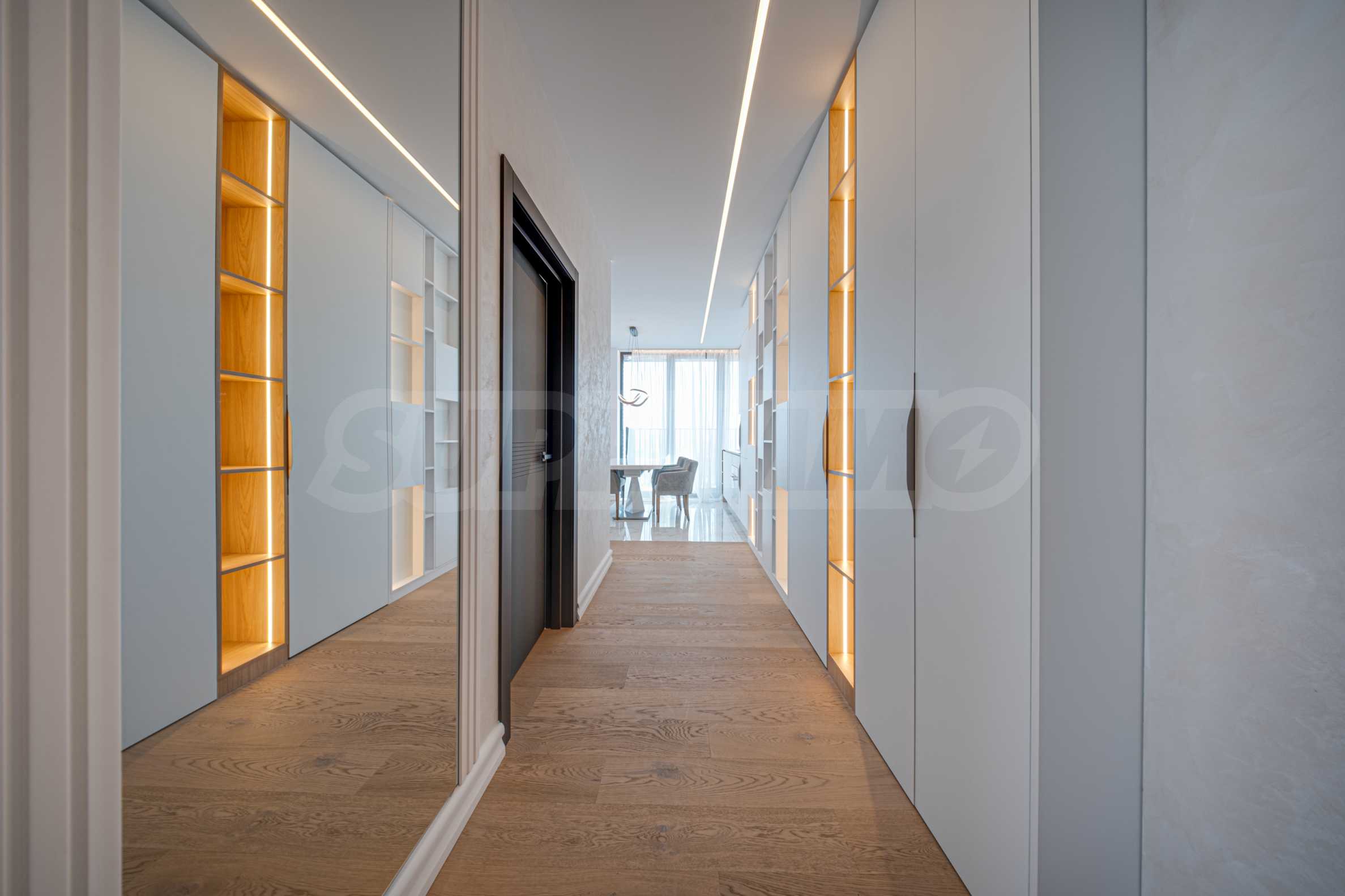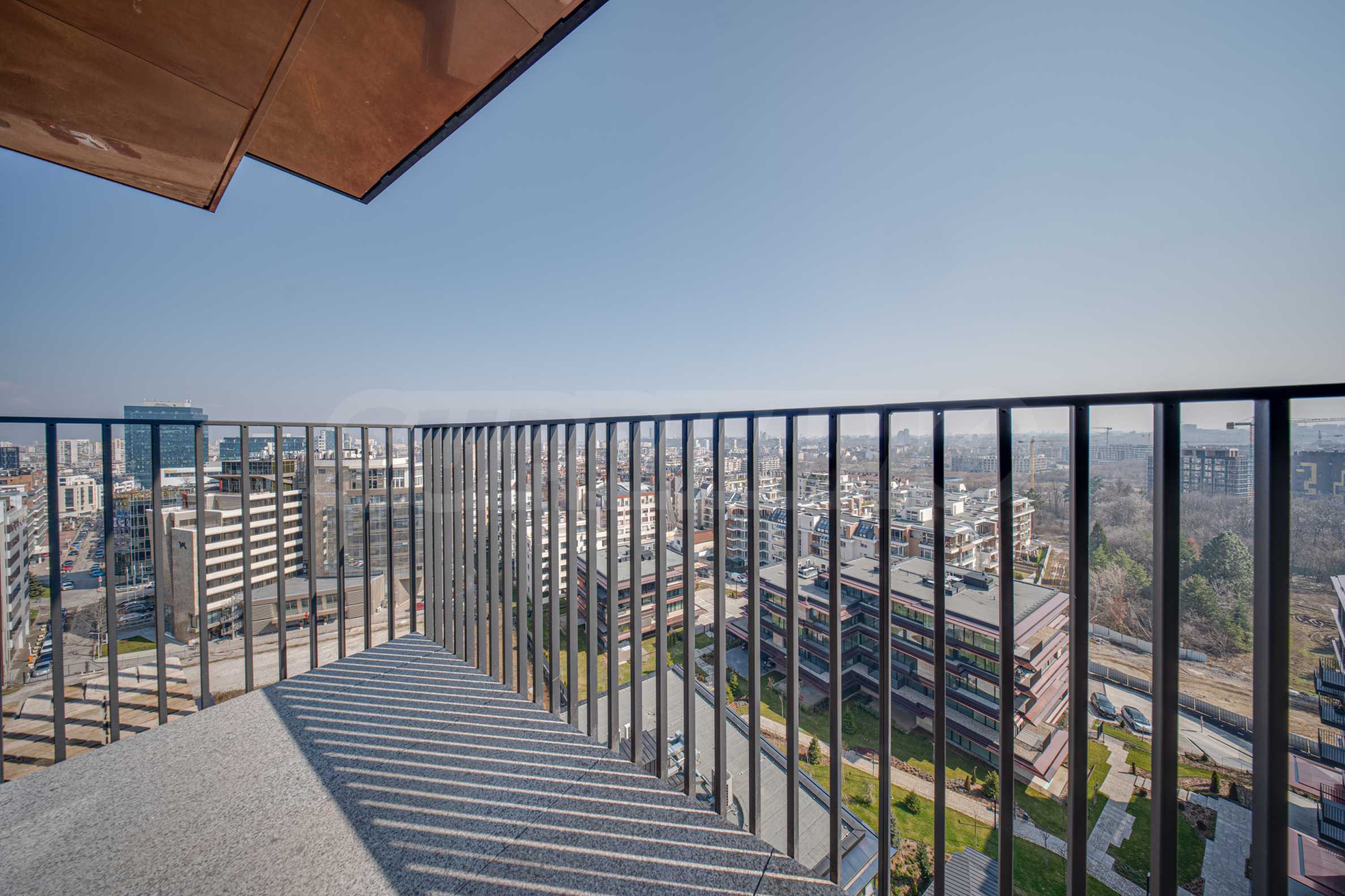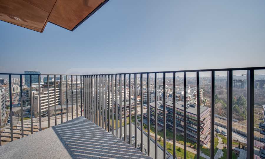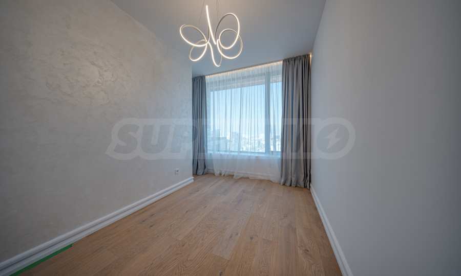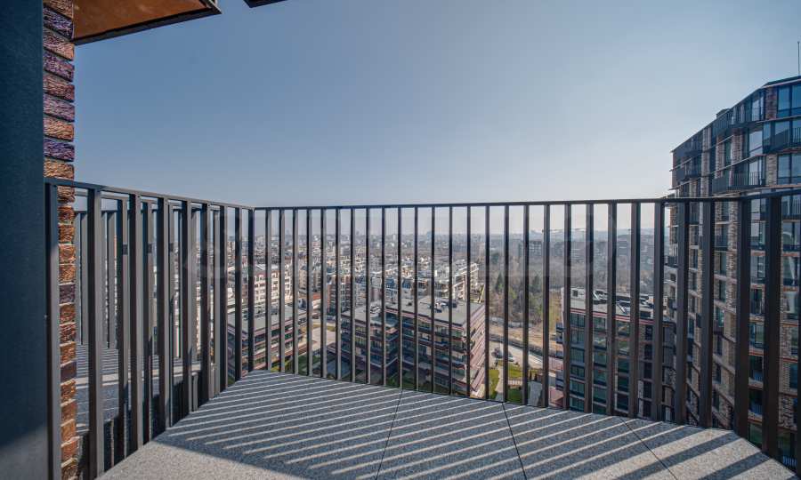The 99 sq m apartment is located on the 12th floor, with panoramic views of the city. The property is bright, offers a modern design vision and an interior with clean lines. The large windows contribute to spaciousness and abundance of light, and the quality materials and refined furniture - to coziness and elegance.
