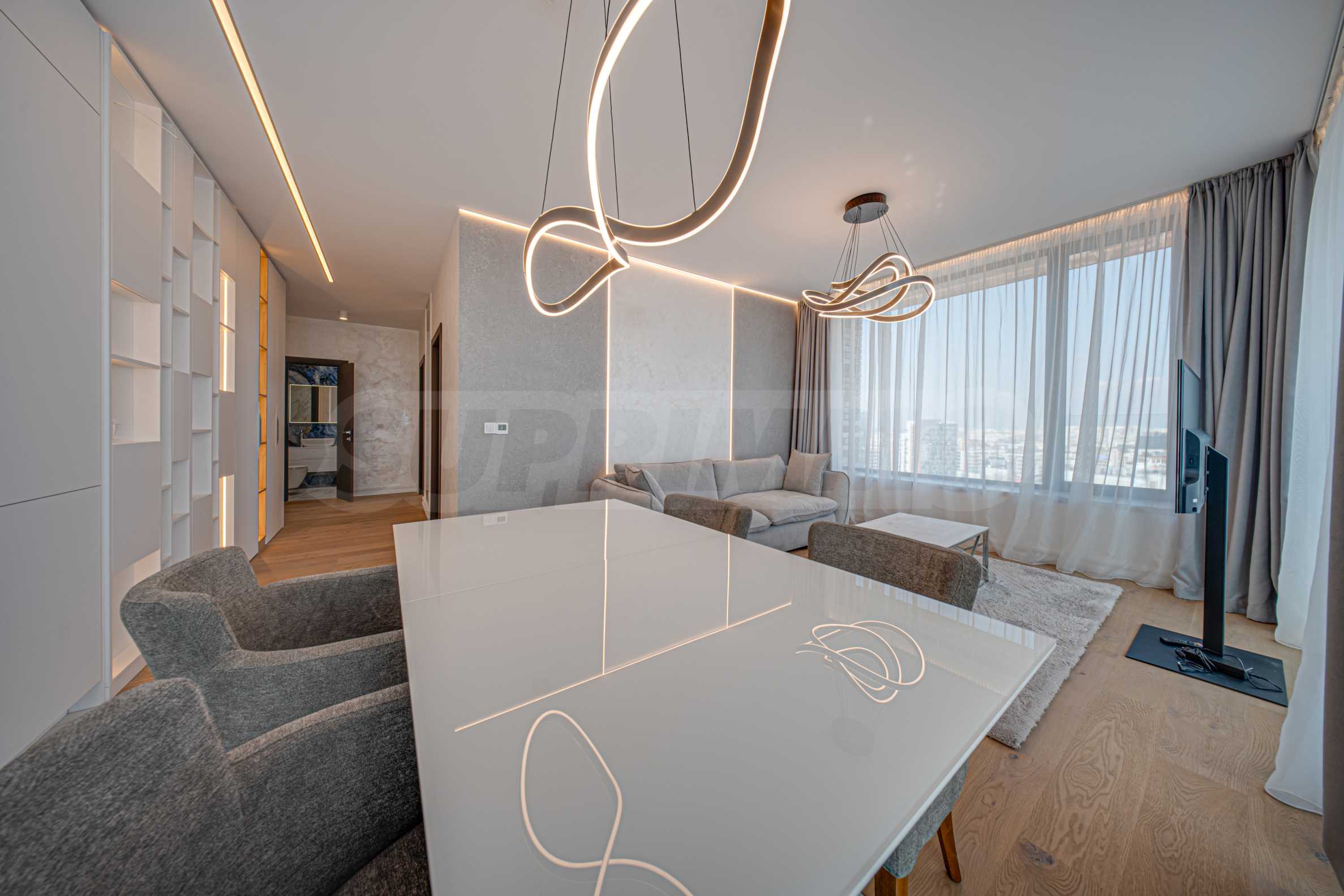 We present a luxurious two-bedroom apartment for rent in an emblematic, innovative complex on Bulgaria Blvd. in the Manastirski Livadi - East district. Next to the key boulevard and with quick access to the Ring Road, the building has an excellent location close to everything you need: public transport, hospital, Bulgaria Mall, chain stores and restaurants, parks and schools.