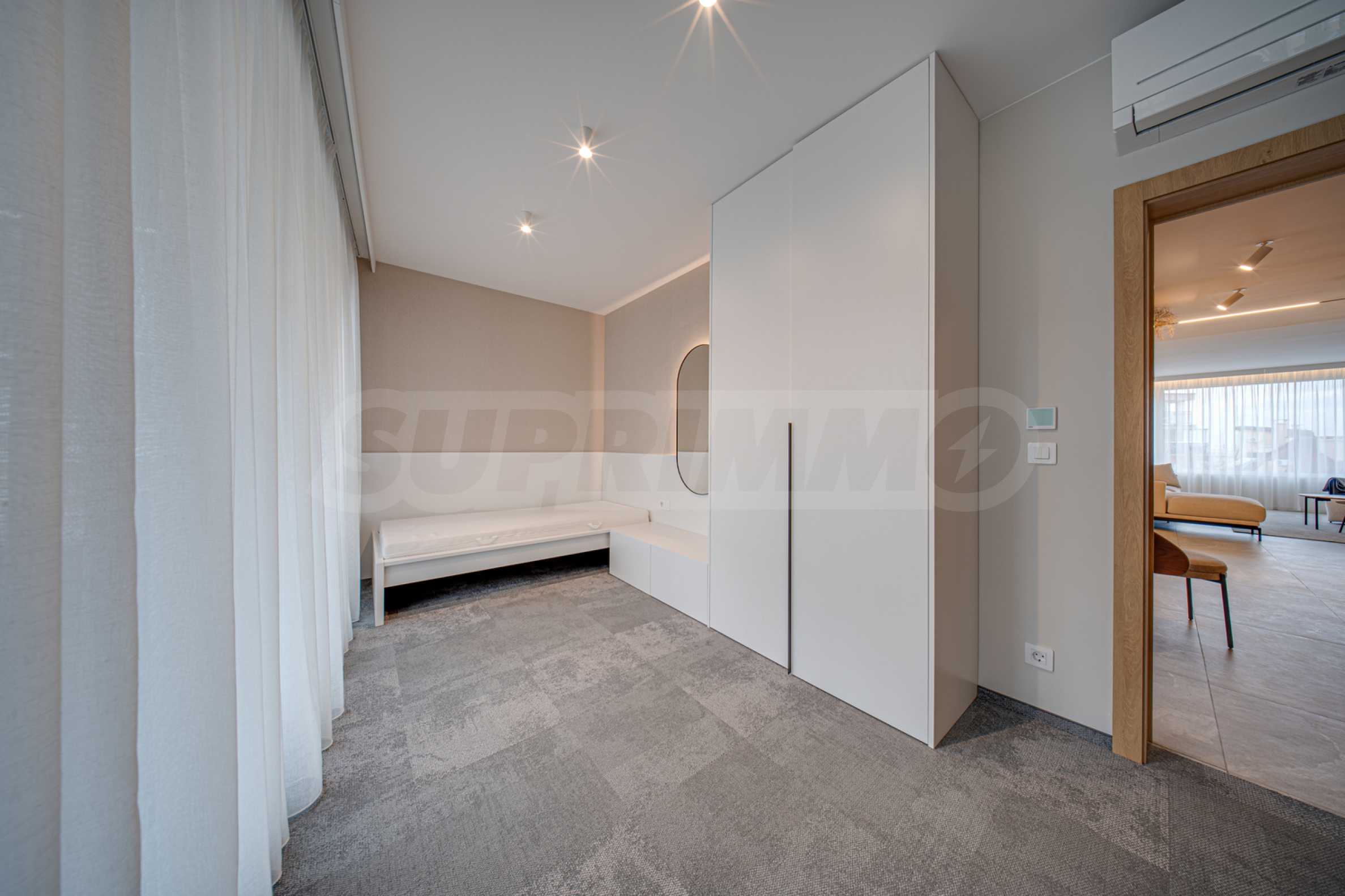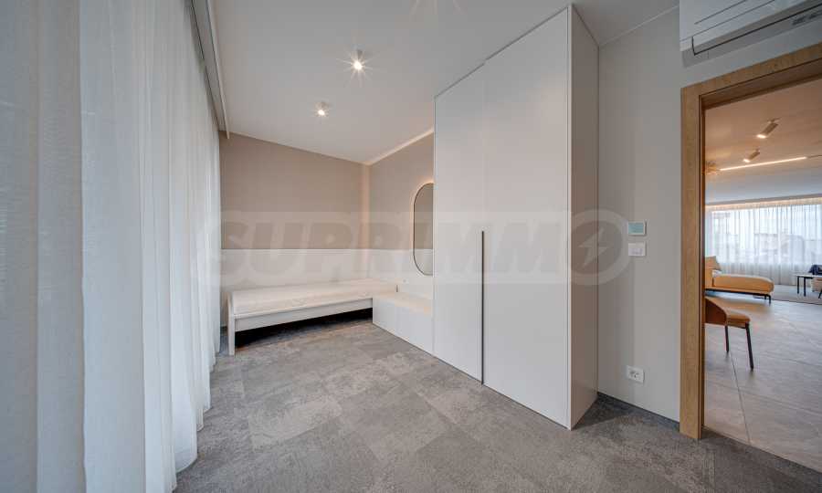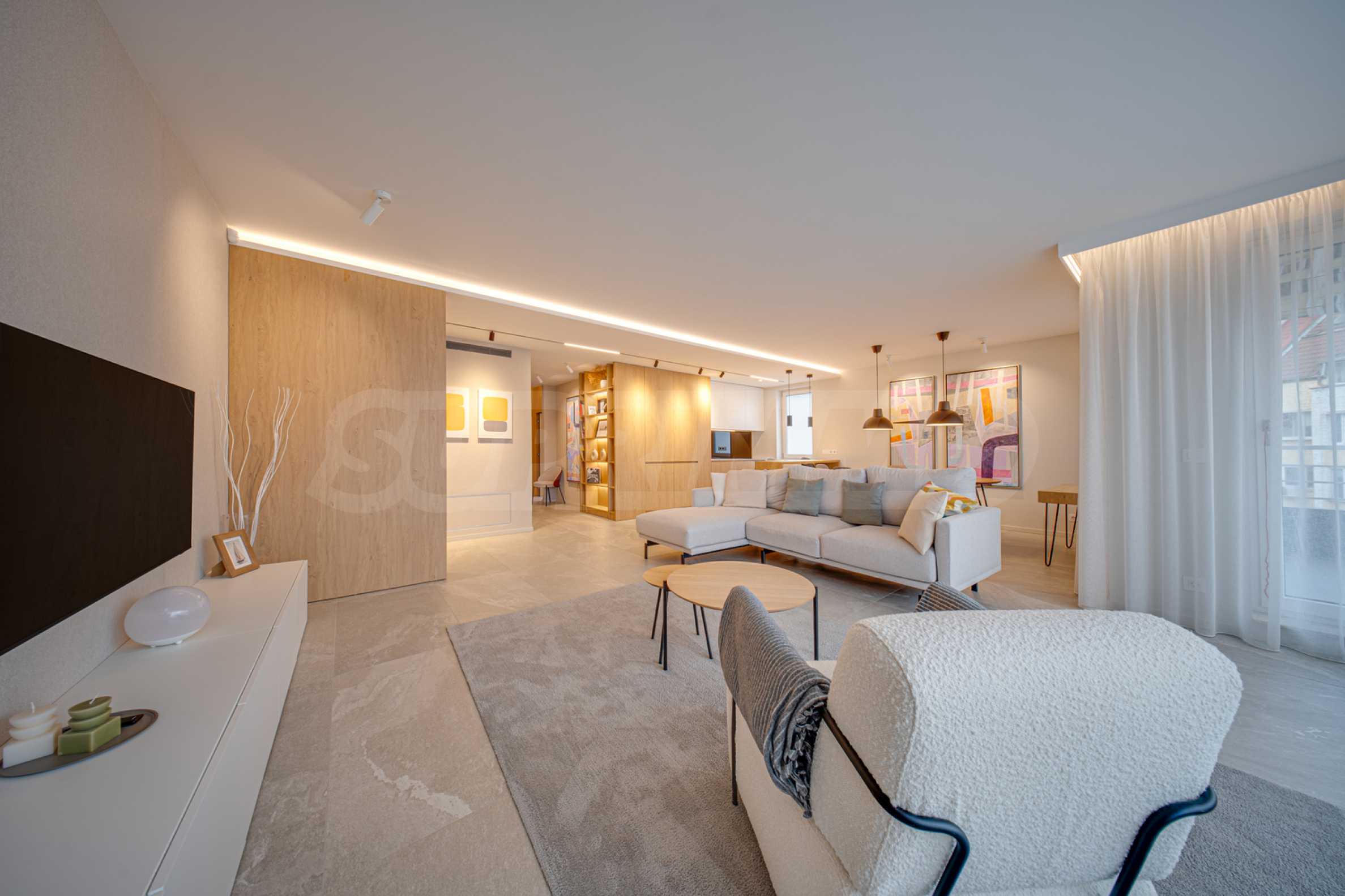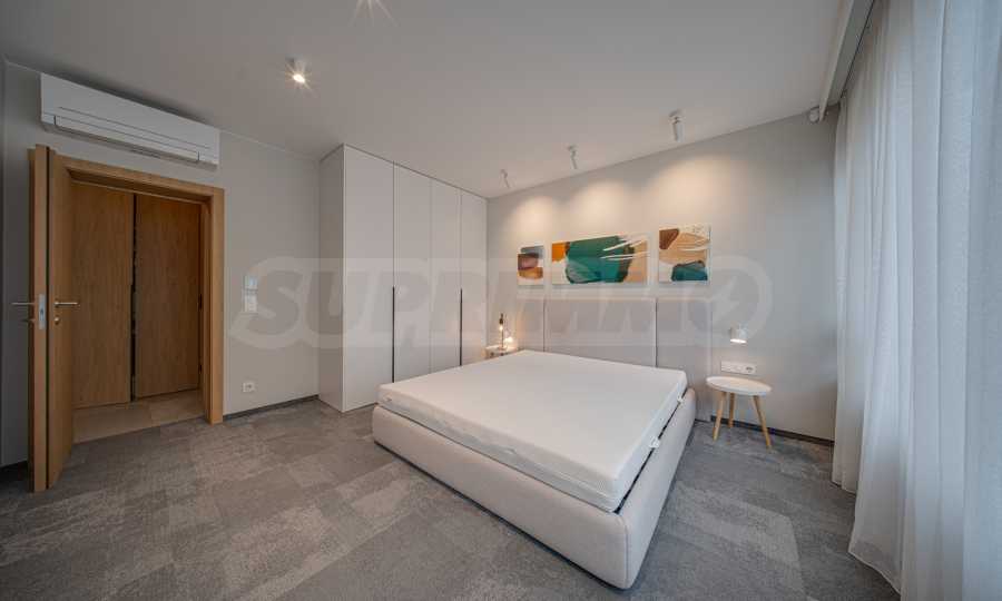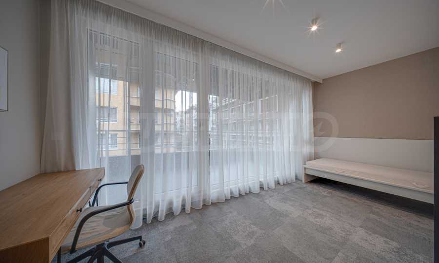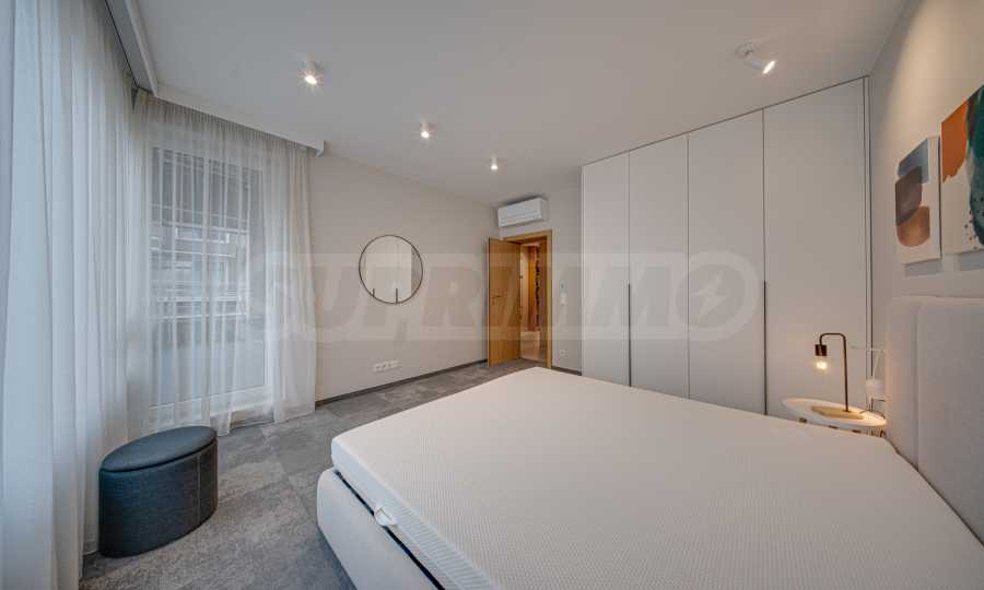The 143.30 sq m apartment is located on the 4th floor, with a view of the city. The property is bright, offers a modern look and an interior with clean lines. The large windows contribute to an abundance of space and light, and the quality materials and refined furniture - to coziness and elegance. The heating is via a gas boiler, with additional air conditioners installed for comfort during the summer months.