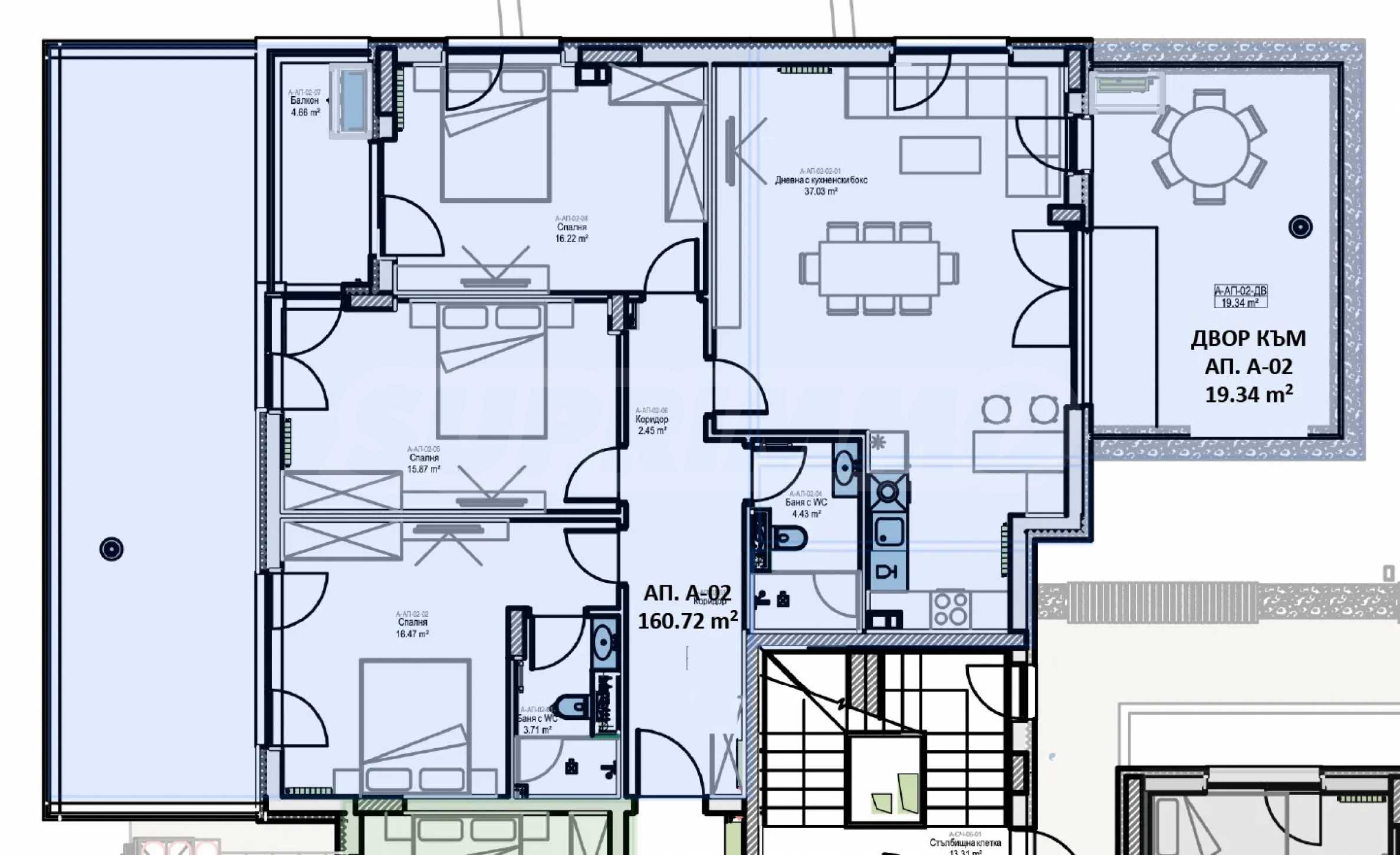 The apartment is located on the 1st floor and has a built-up area of 131.56 m2, on which are distributed: entrance hall, bathroom/toilet, living room with kitchen and dining room, exit to a yard of 19.34 m2, three bedrooms, one with its own bathroom/toilet, balcony. The apartment is handed over in a state of completion according to BDS, with quality German PVC joinery - six-chamber profile, with triple glazing for high energy efficiency and noise insulation. The heating is with central heating, and copper lines for air conditioners (split and multi-split systems) will be built.