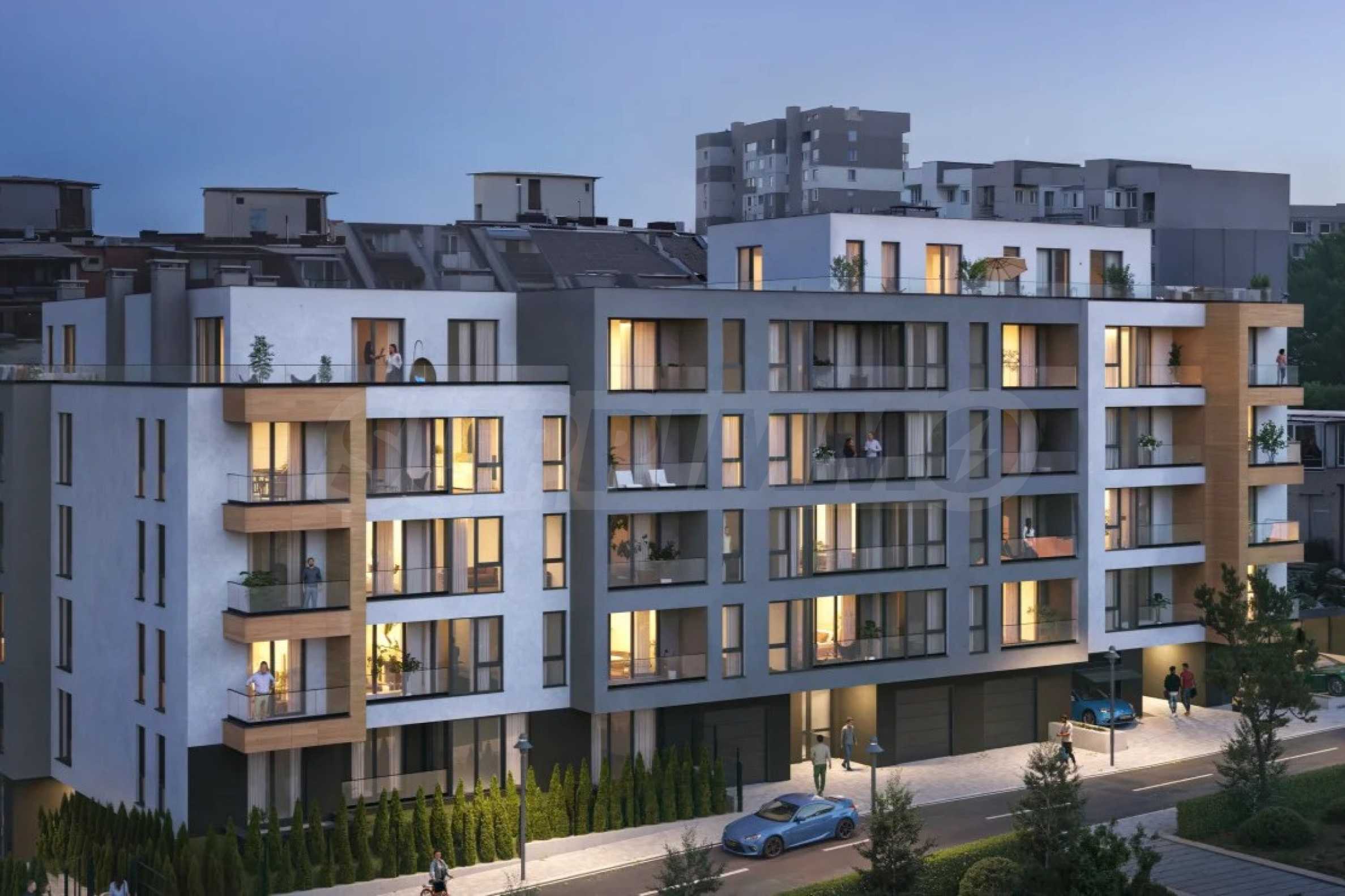 The architectural concept of the building is in line with the dynamics of the area and relies on harmony between modern vision, functionality and comfort. The project is implemented on a terrain with elevation differences, which provides private courtyards for some of the apartments and spacious terraces with open views for the apartments on the higher floors. Despite the active urban development, special attention has been paid to landscaping and interior spaces, for tranquility, connection with nature and privacy. The apartments are suitable for both personal use and investment, with a high level of energy efficiency, security and modern technological solutions.