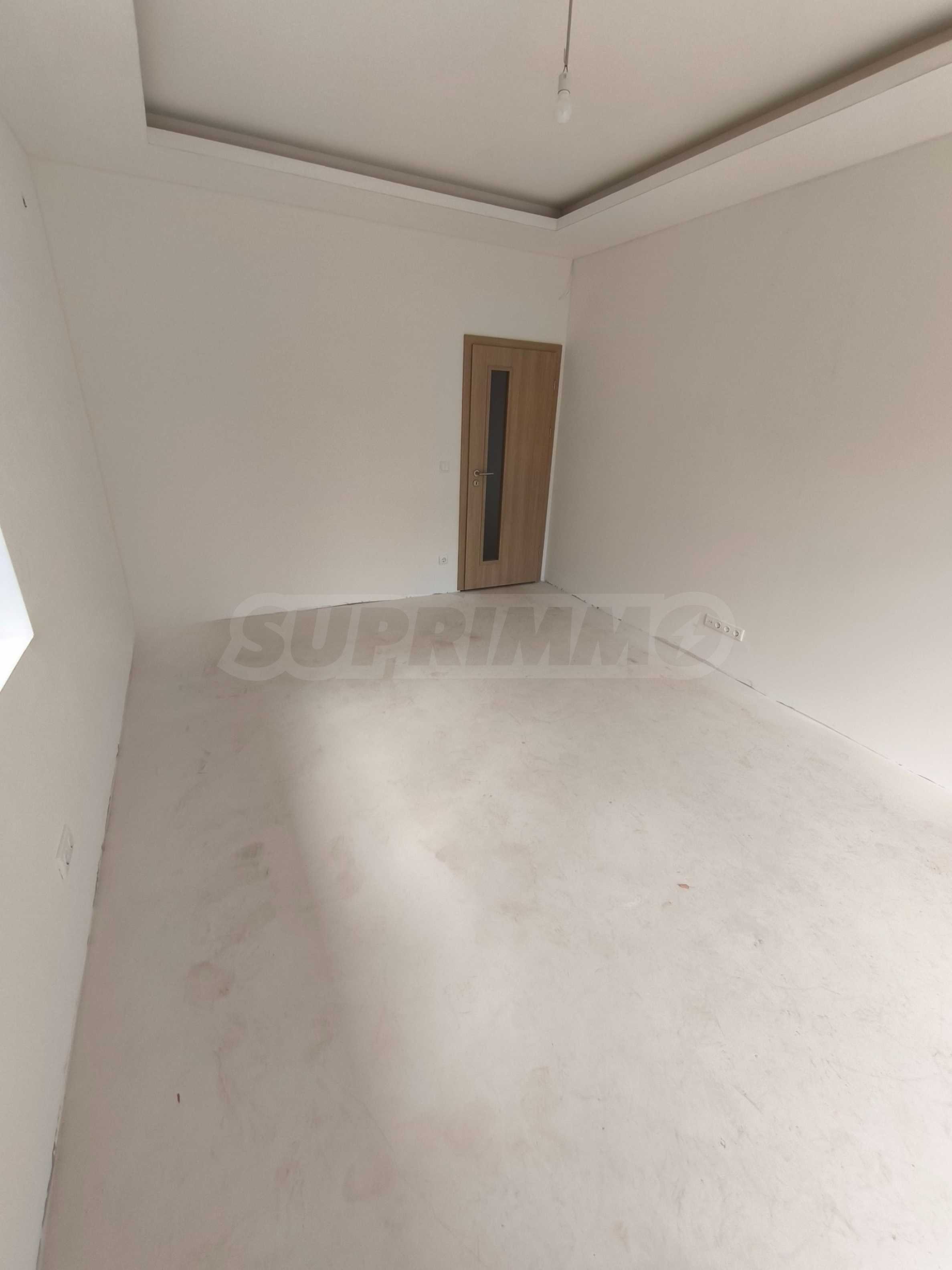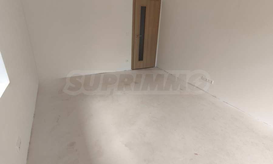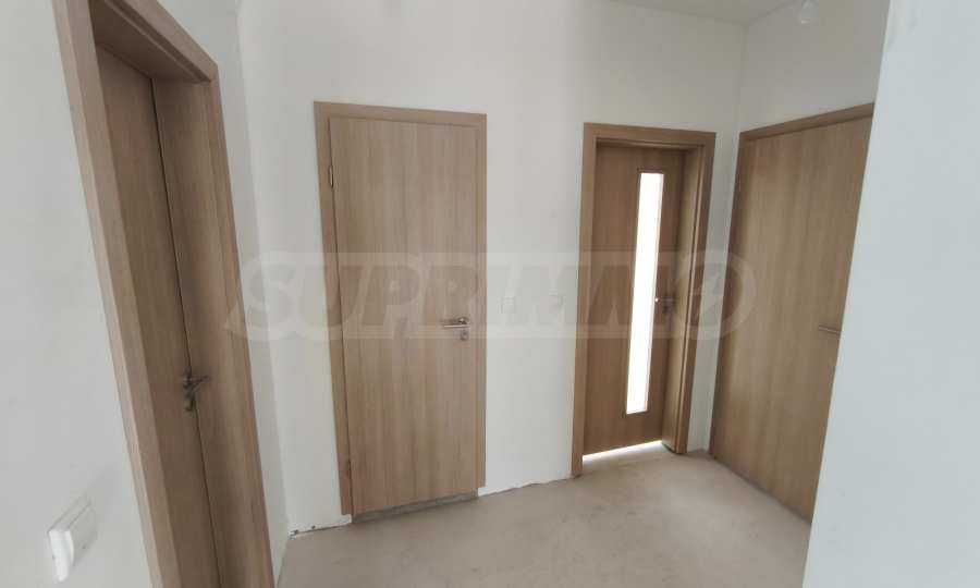 The interior space is prepared for final finishing - under screed and self-leveling screed in all rooms, walls with plasterboard and fine putty, ready for painting. Decorative trunks with hidden lighting have been built and wool has been laid on the ceilings. Interior doors have been installed.