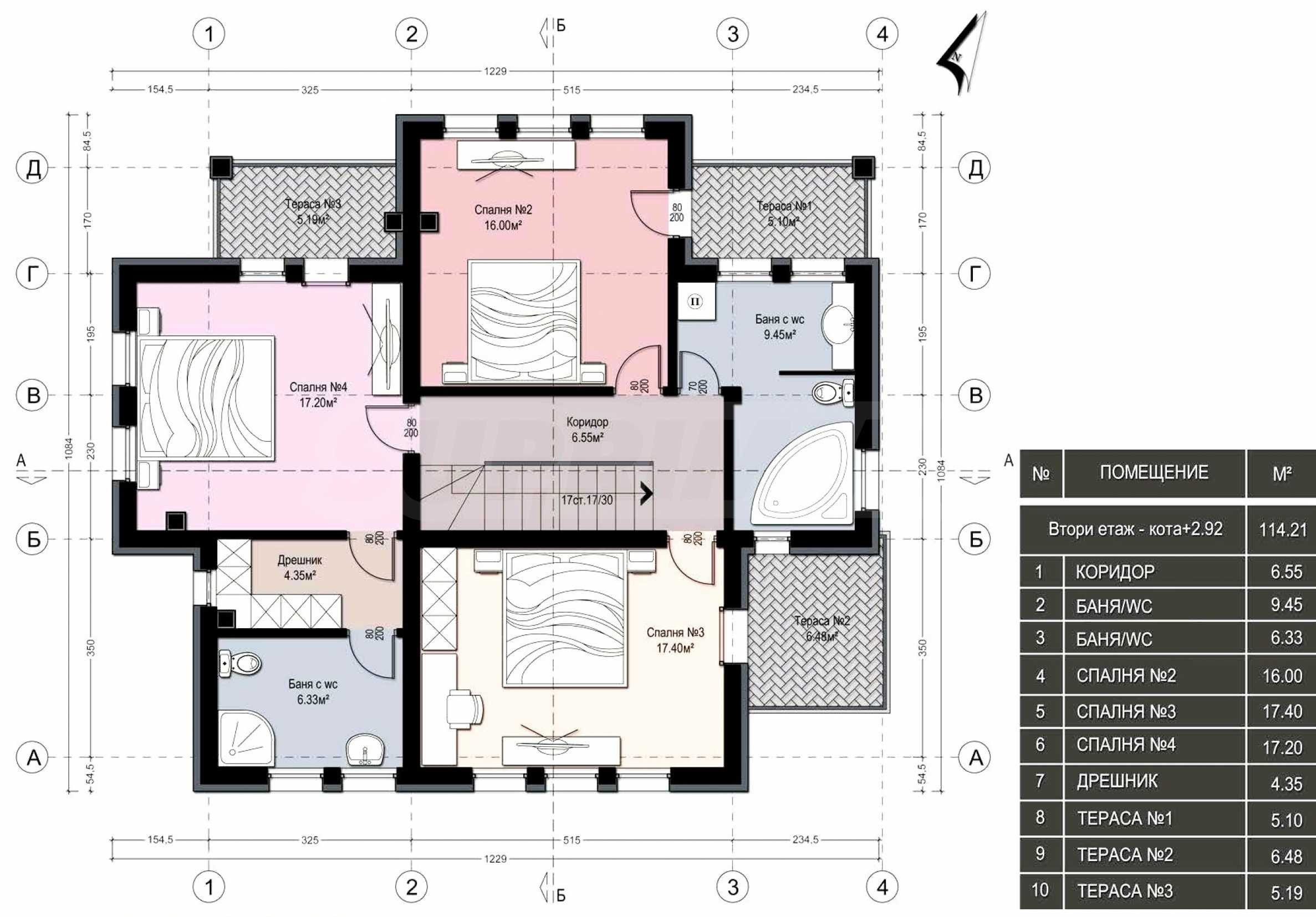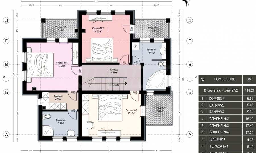 • second floor: three bedrooms, three terraces, two bathrooms, with the master bedroom having a private bathroom and a dressing room.