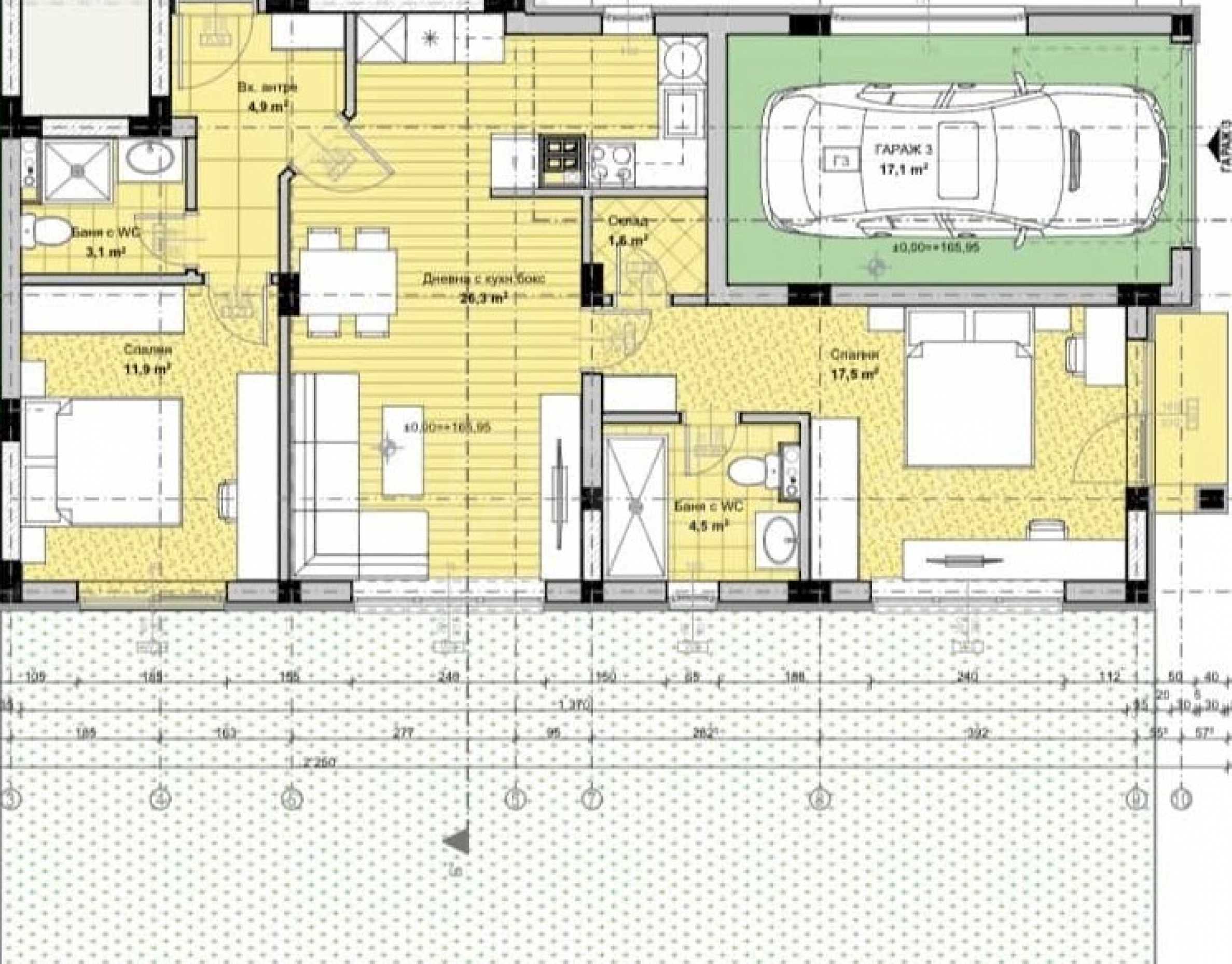 The apartment with a total area of 95.28 sq m is located on the 1st floor of 3, facing south-west and has a veranda of 71.70 sq m.