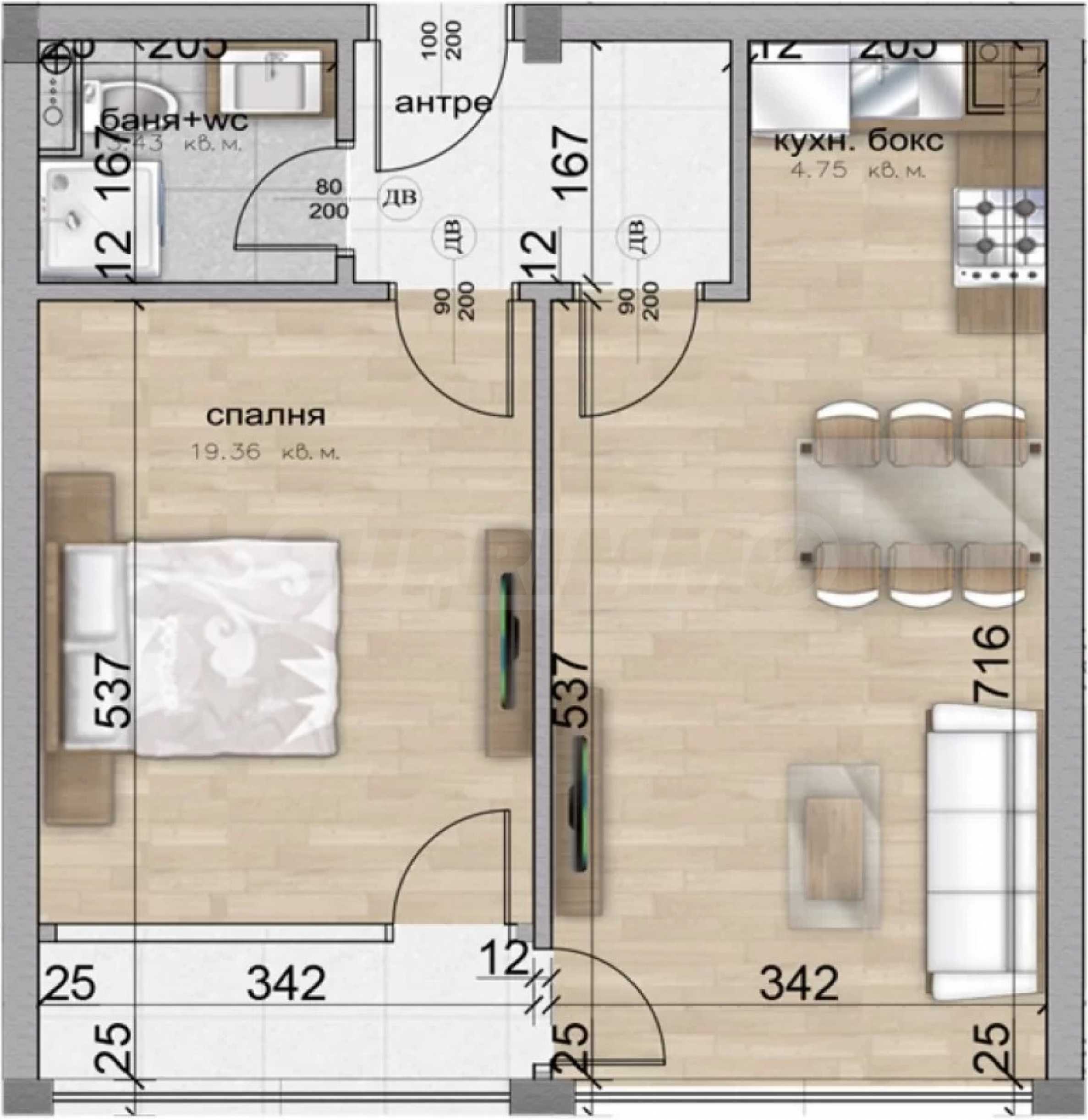 The building has a monolithic reinforced concrete structure and consists of three entrances - A, B and C. There are 79 apartments in it - 4 studios and 75 apartments. The two-room apartments are about 70 m2., and the three-room apartments are from 110 to 130 m2. All apartments are south-facing and have direct views of the mountain. They are sold both with plaster and screed, and there are also ready-made apartments with "turnkey" finishing works - (flooring, equipped bathrooms, switches and sockets, flooring in the corridor, laminate flooring in the bedroom and living room, painted walls).