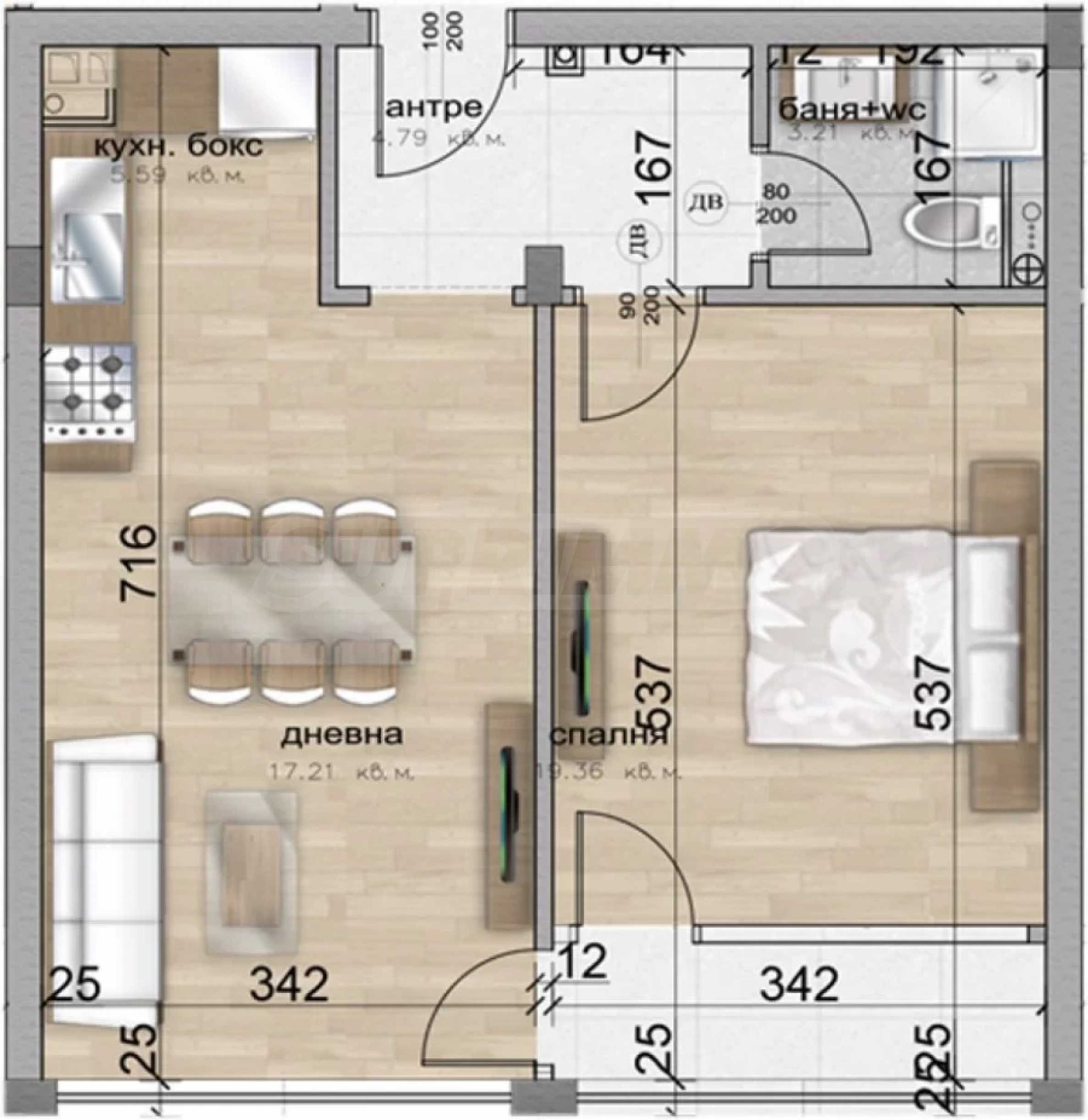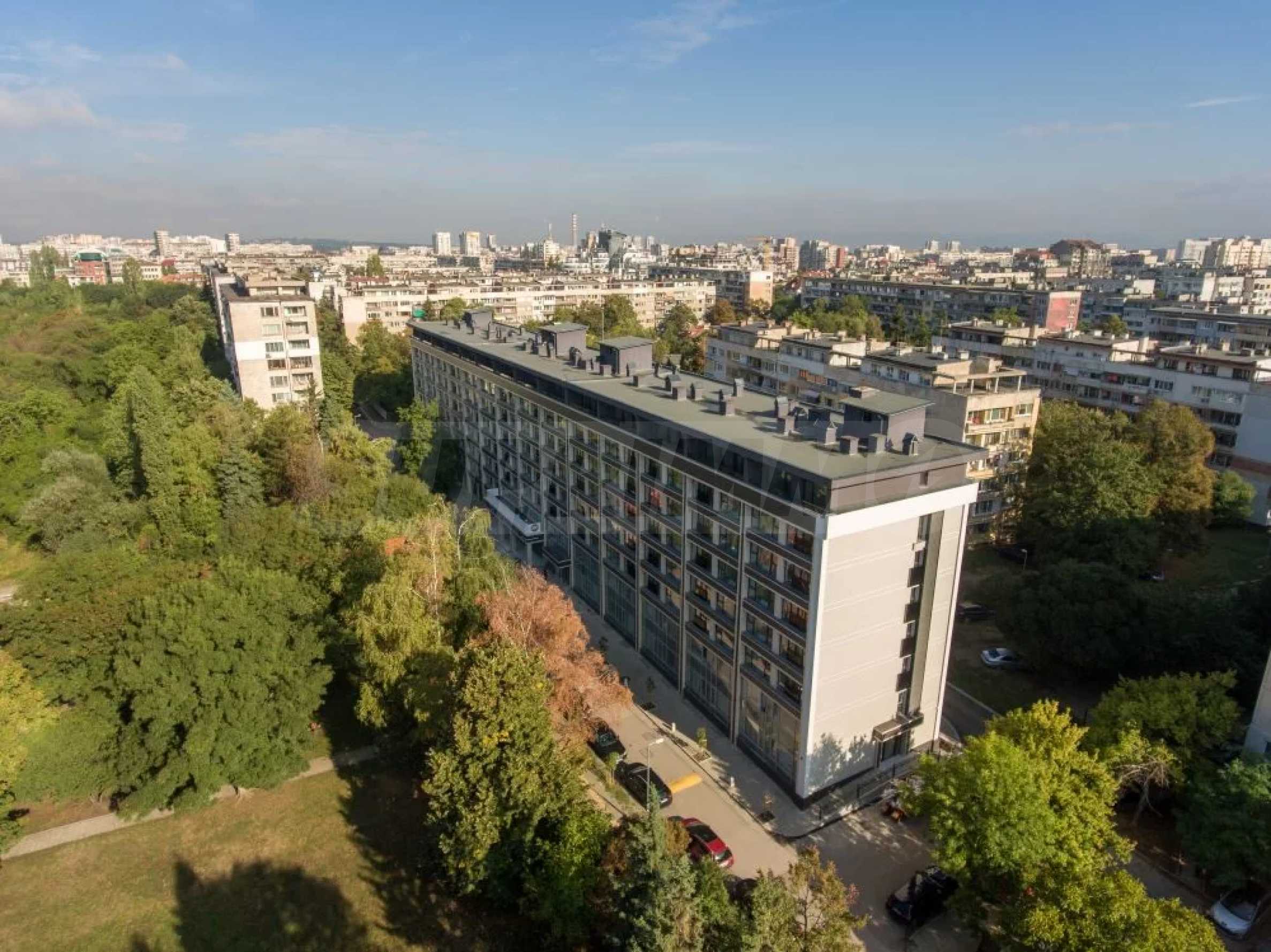 The building has a monolithic reinforced concrete structure and consists of three entrances - A, B and C. There are 79 apartments in it - 4 studios and 75 apartments. The two-room apartments are about 70 m2., and the three-room apartments are from 110 to 130 m2. All apartments are south-facing and have direct views of the mountain. They are sold both with plaster and screed, and there are also ready-made apartments with "turnkey" finishing works - (flooring, equipped bathrooms, switches and sockets, flooring in the corridor, laminate flooring in the bedroom and living room, painted walls).