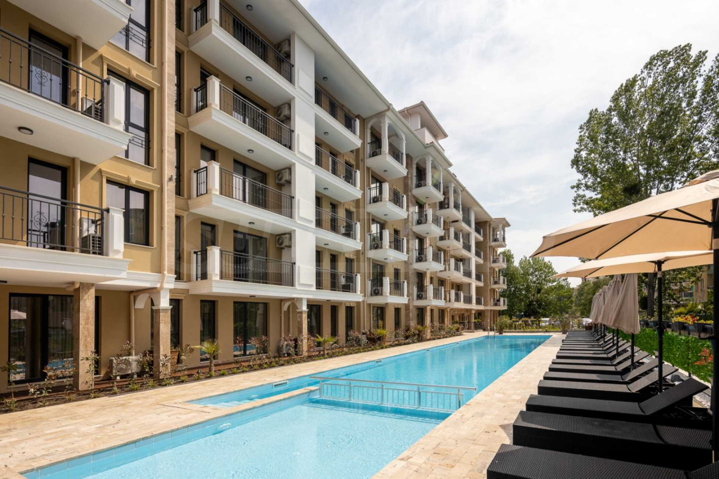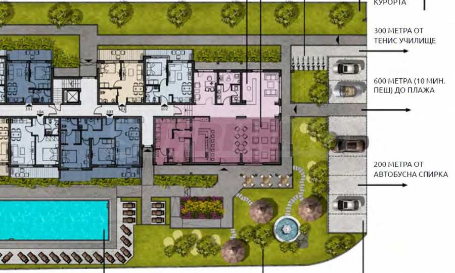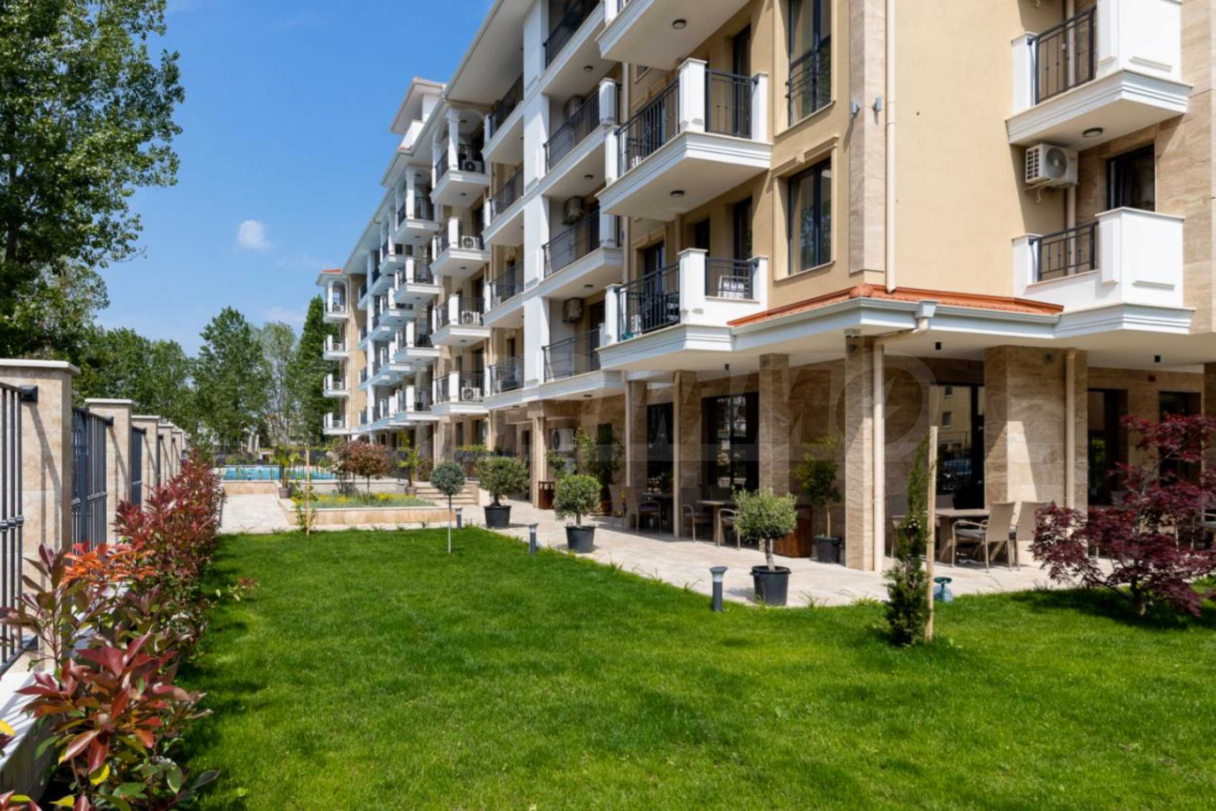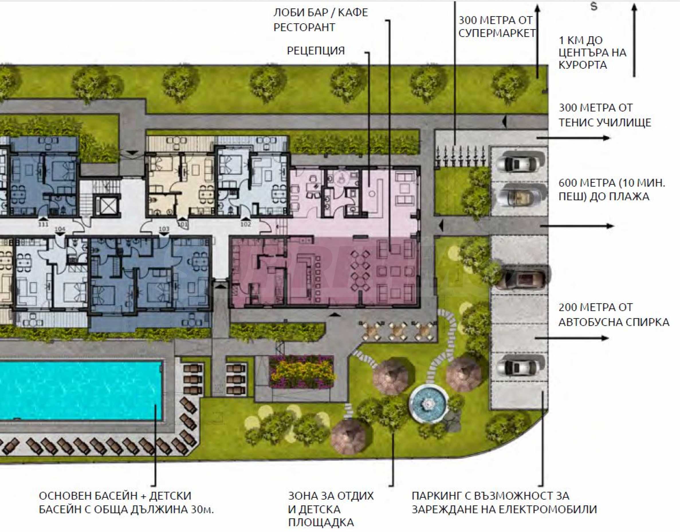 The complex is located in the very center of the resort, 600 meters from the beach, in a quiet green area with developed infrastructure. The site borders a 7000 square meter plot of land designated as a municipal park. And within a radius of 400 meters from the complex there are 4 park areas with numerous attractions for children.