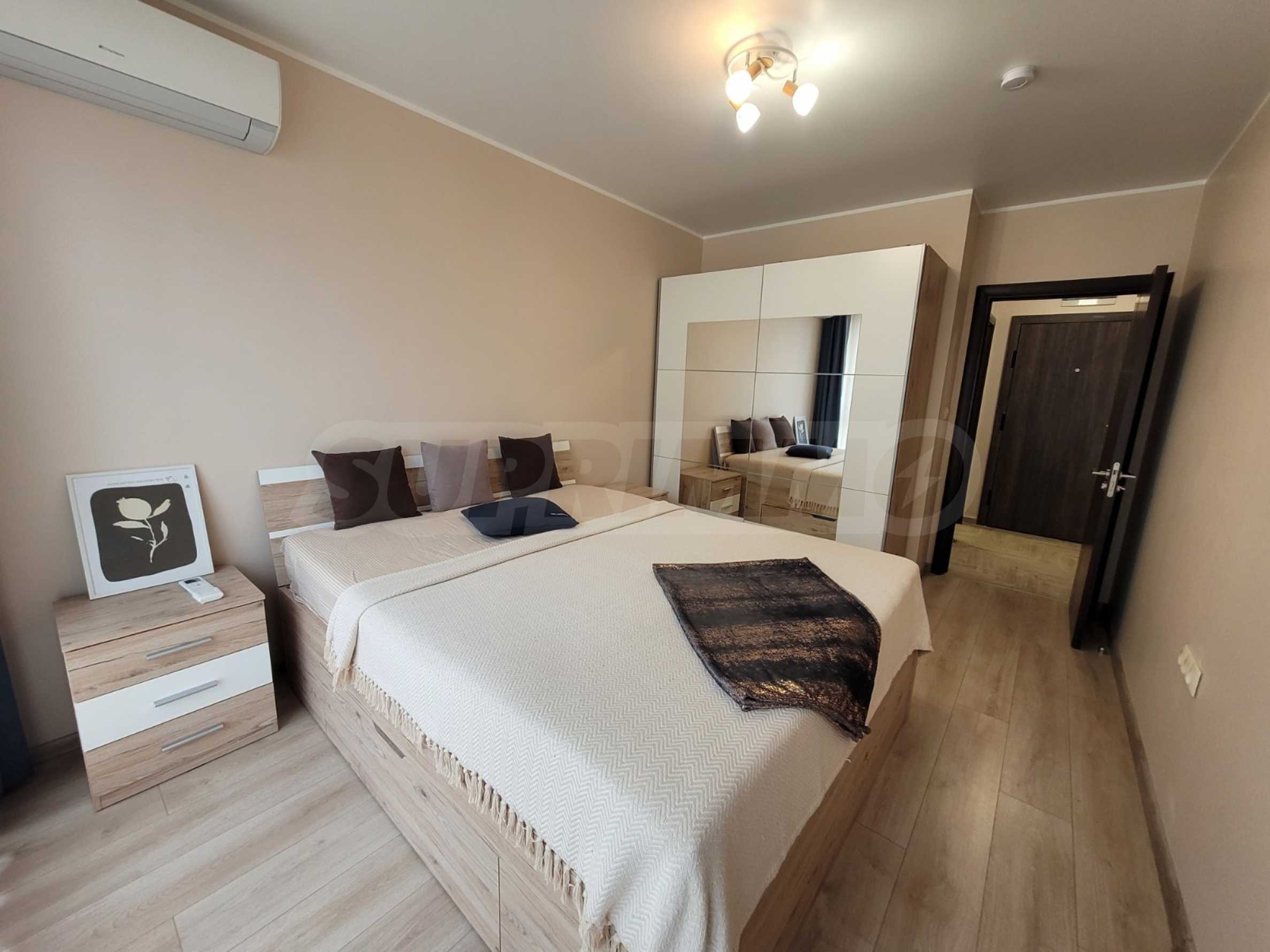 The bedroom has a double bed, bedside tables, a spacious wardrobe with mirrored doors and air conditioning. An additional advantage is the presence of a separate utility/laundry room with a washing machine, boiler and storage space - a practical solution rarely found in two-bedroom properties.