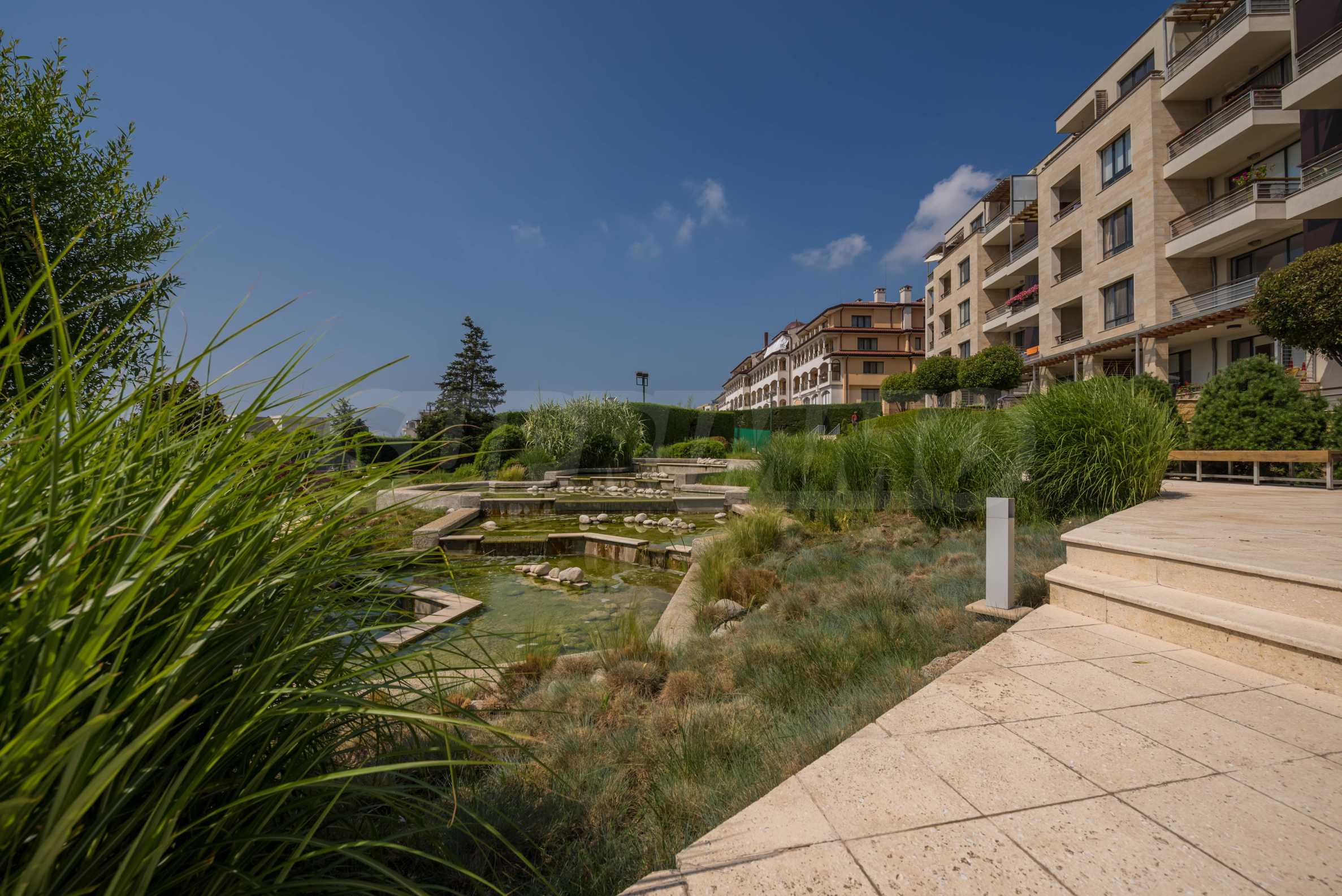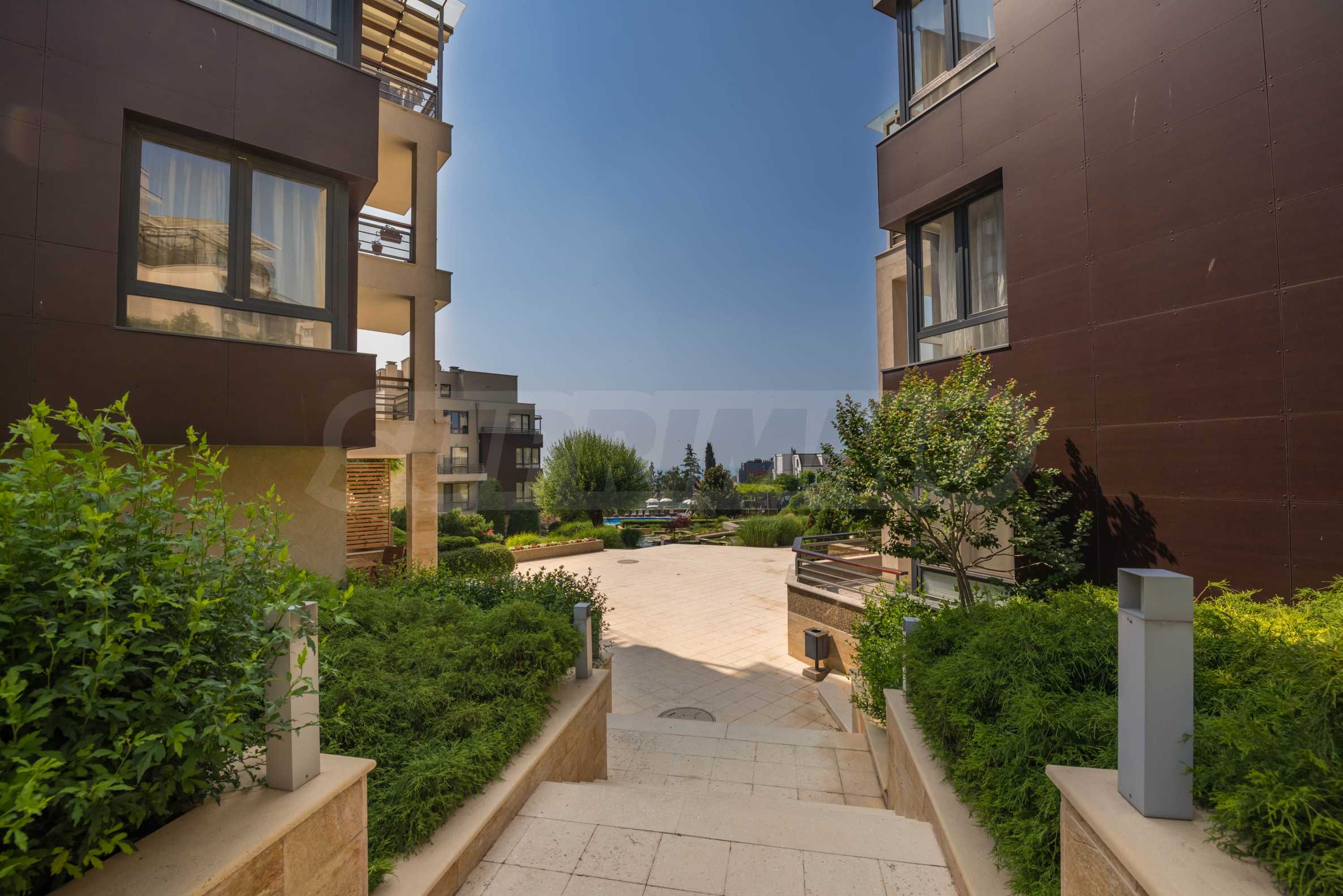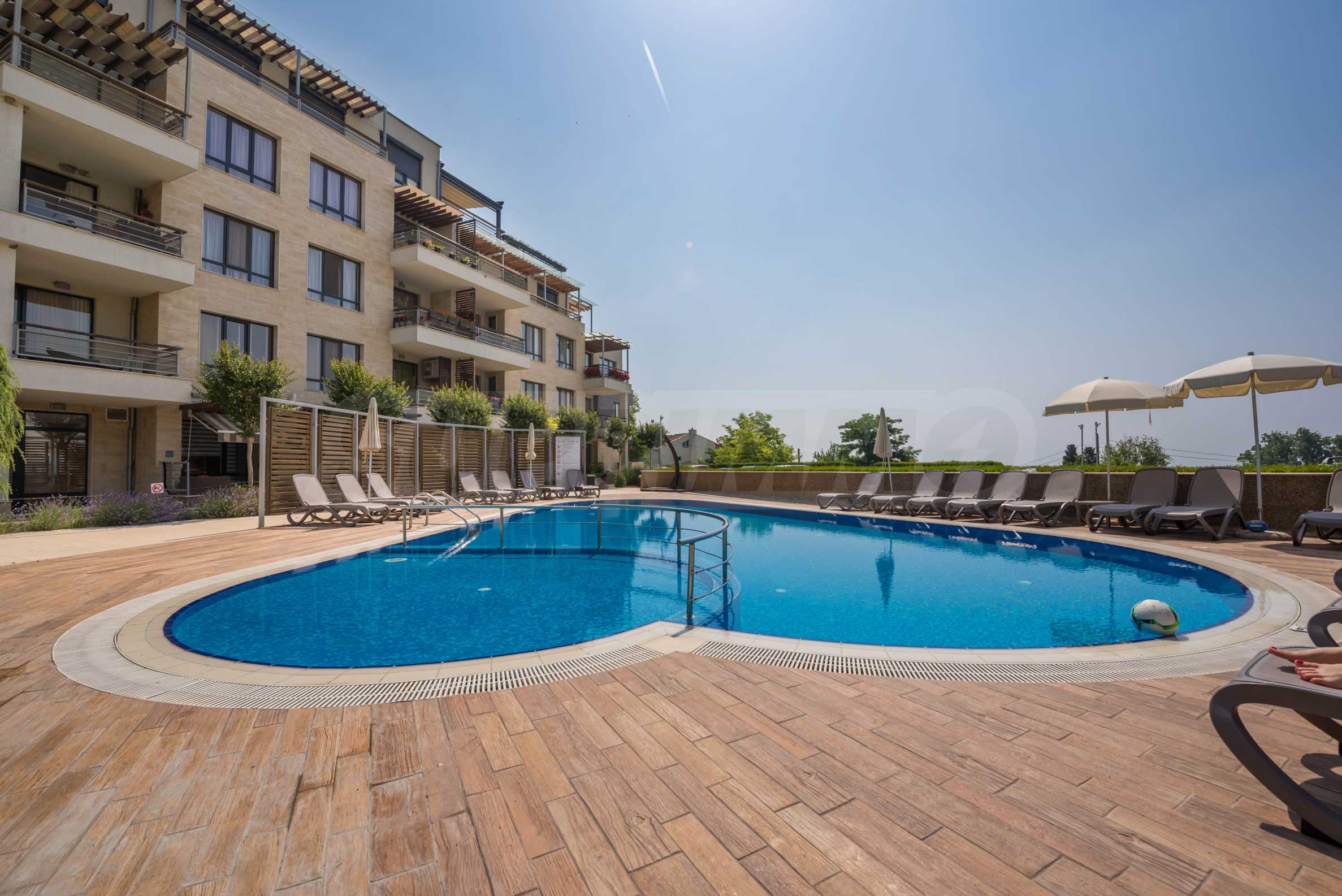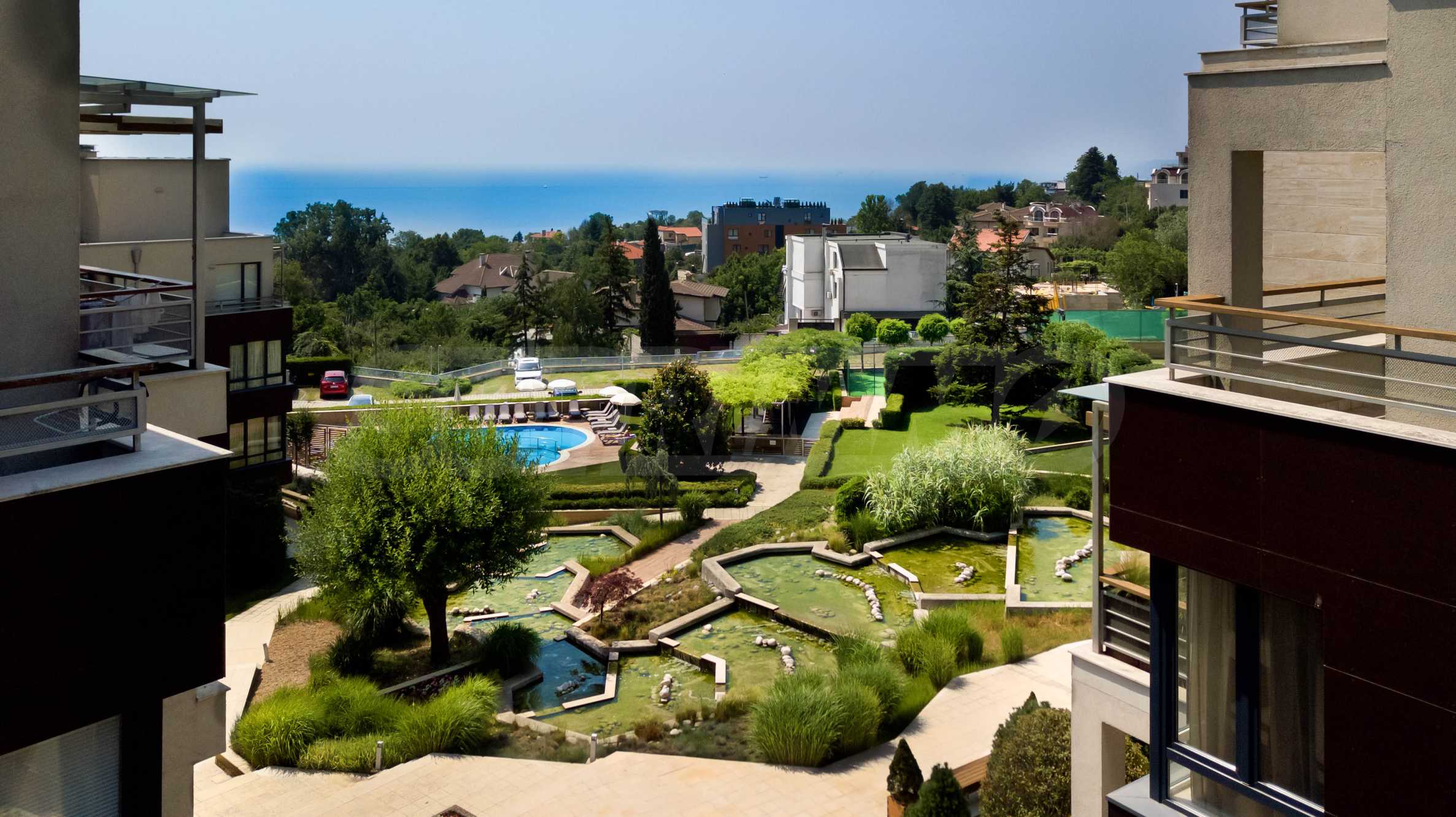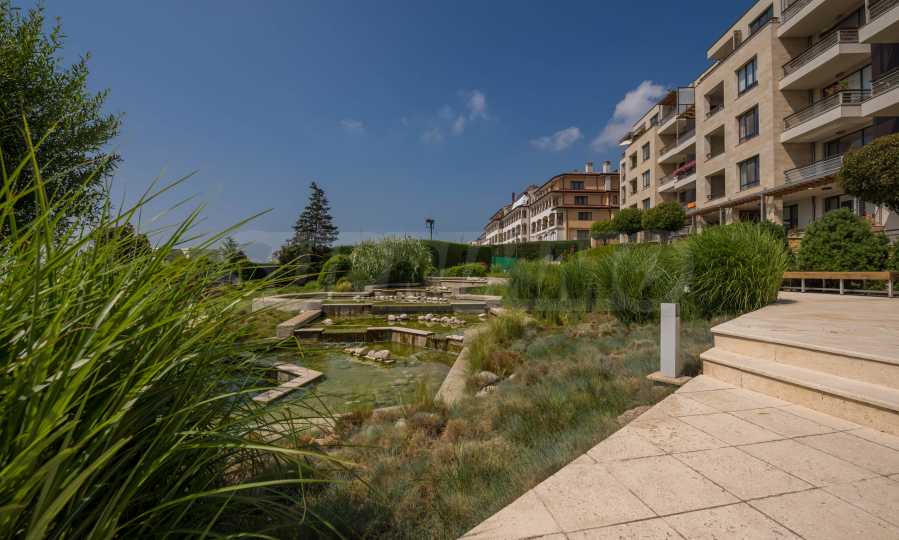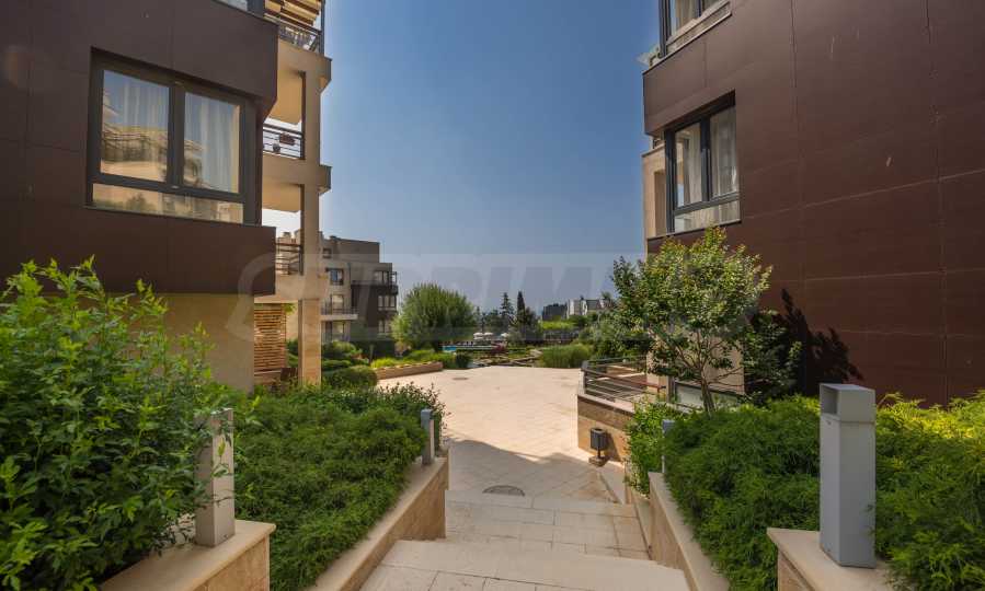 The location of the complex is strategic, with frontal sea views, it is suitable for both permanent living and active recreation. The distance to the resort of St. St. Constantine and Elena is 3 km and takes 3 minutes by car. The resort complex offers modern amenities for the whole family - an exceptional 3.5 km beach with water sports and entertainment, park areas and alleys for walks and active recreation, tennis courts and golf courses nearby, a mild climate, 7 thermal springs with healing properties in the area, popular SPA centers in the area, and at the same time there is everything necessary for permanent living, such as year-round public transport, schools, kindergarten, pharmacies, banks, shops, restaurants, etc.