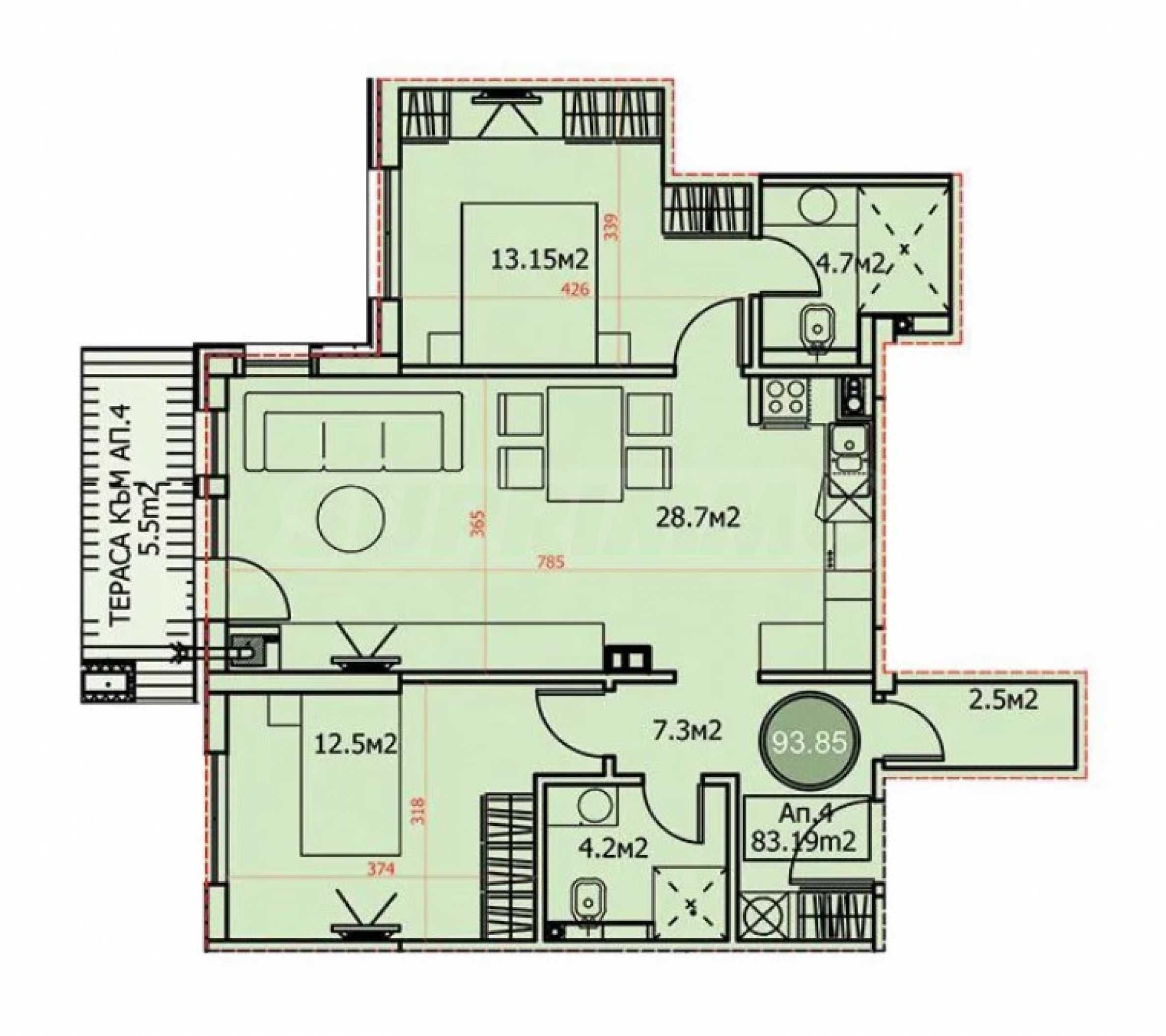 The apartment is being let in a state of completion according to Bulgarian Construction Standards, with plaster and screed.