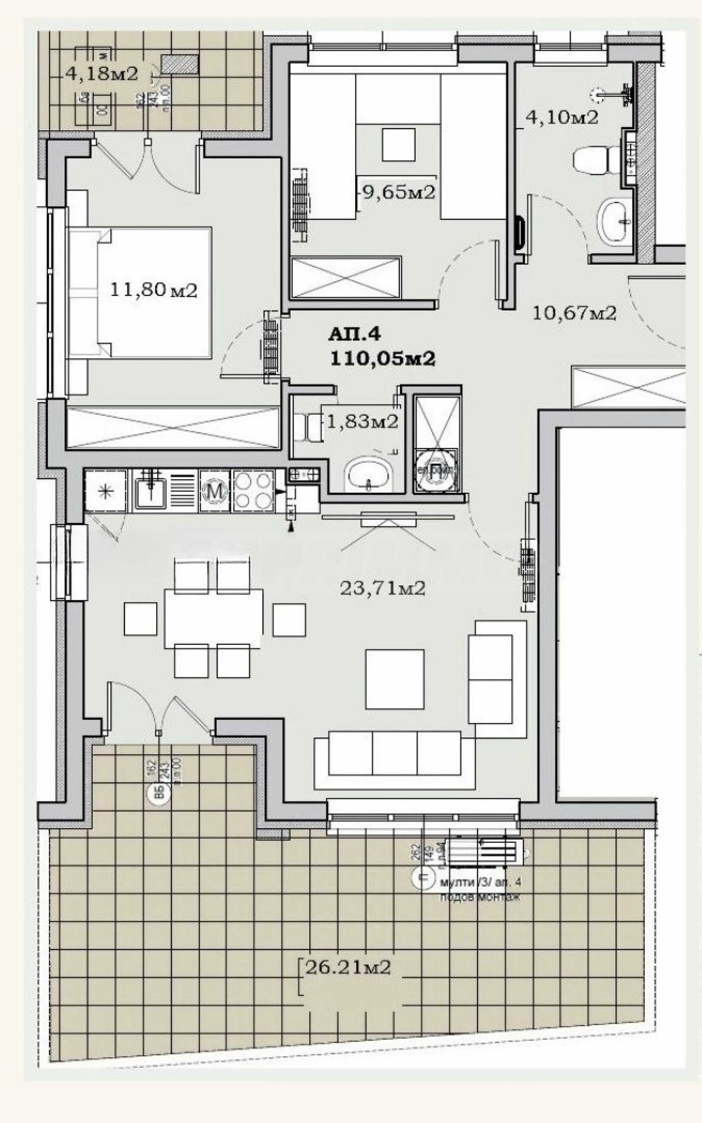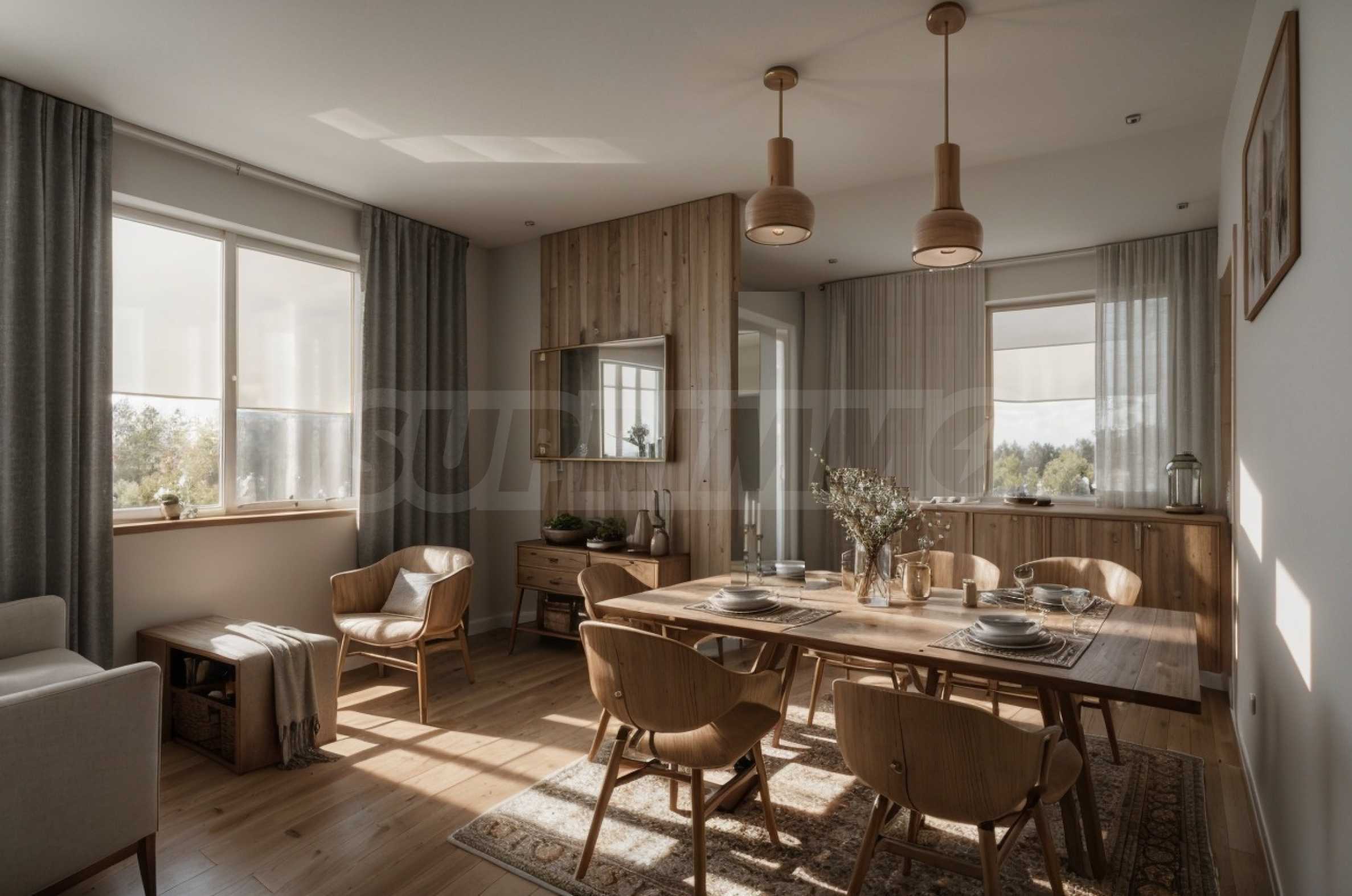 The apartment is located on the 2nd floor and has a total area of 134 sq m. It is offered in a state of completion according to Bulgarian Standards, with quality PVC windows with double glazing with argon. The photos of the offer with the furniture are exemplary.