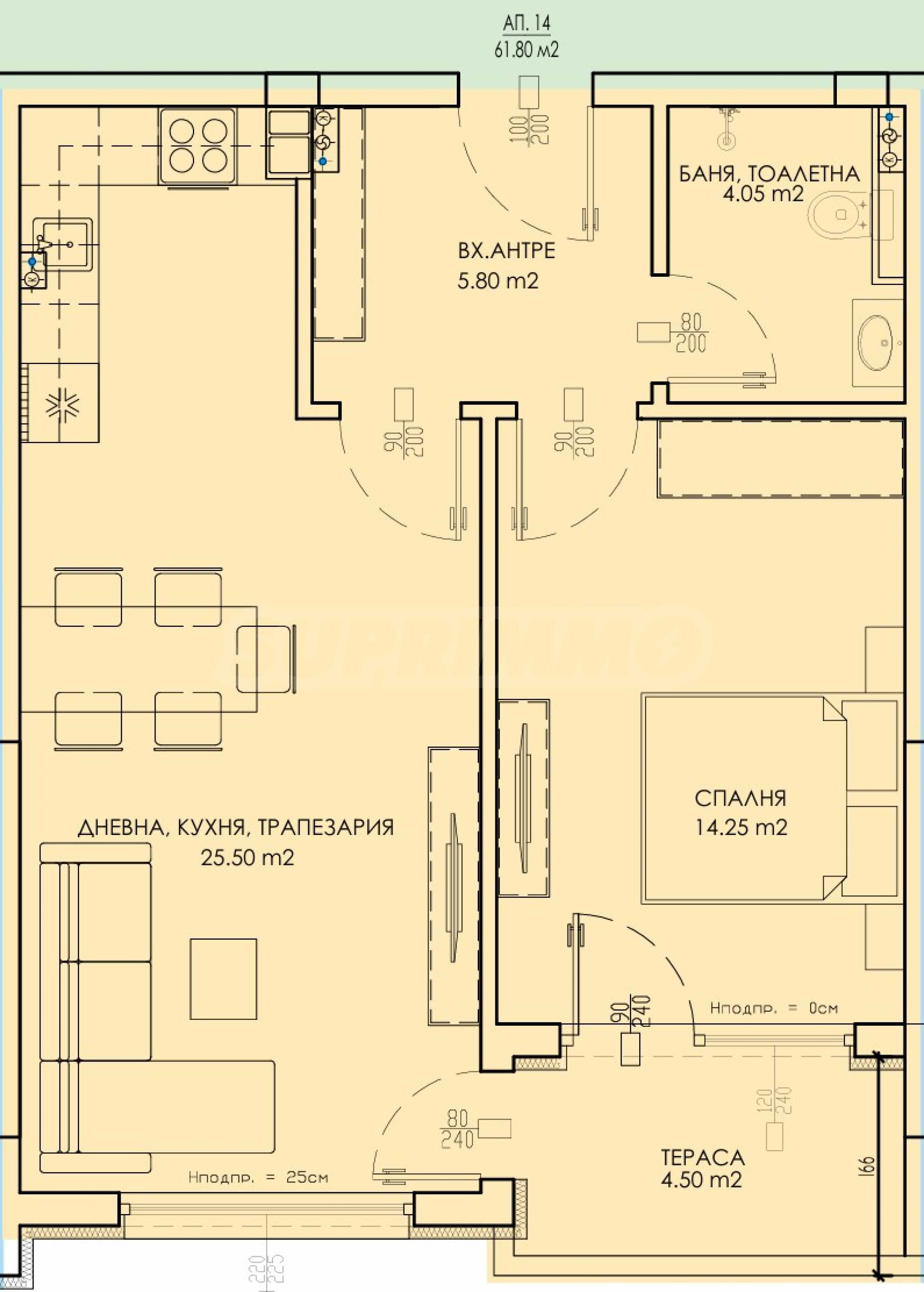 The properties are handed over in a state of completion according to Bulgarian Construction Standards, with plaster and screed.