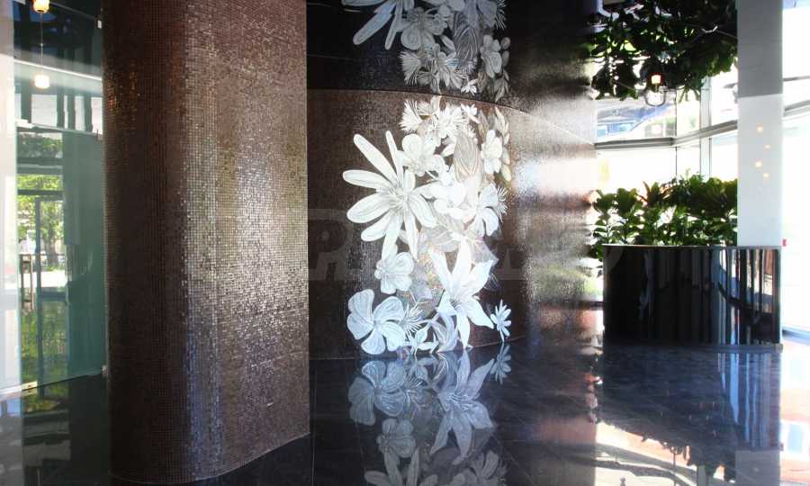 • The lobby of Block A impresses with a black glass ceiling, white glass walls and an artistic Sicis panel made of platinum, gold, silver and glass ceramic elements.
