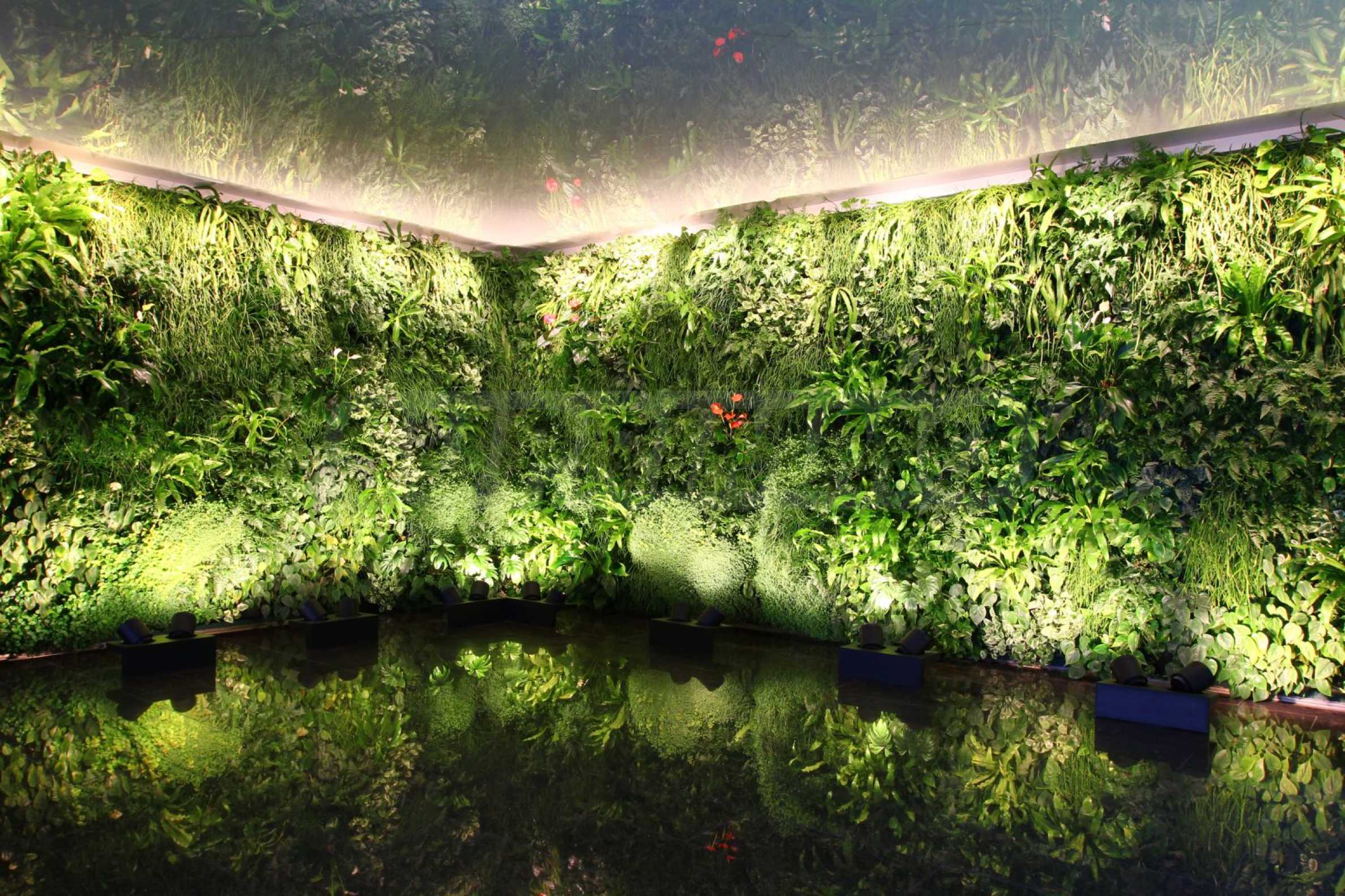 • The lobby of Block B relies on organic shapes, white glass with irregular geometry and a living wall of natural vegetation with an area of 20 m2., creating an area for recreation and relaxation.