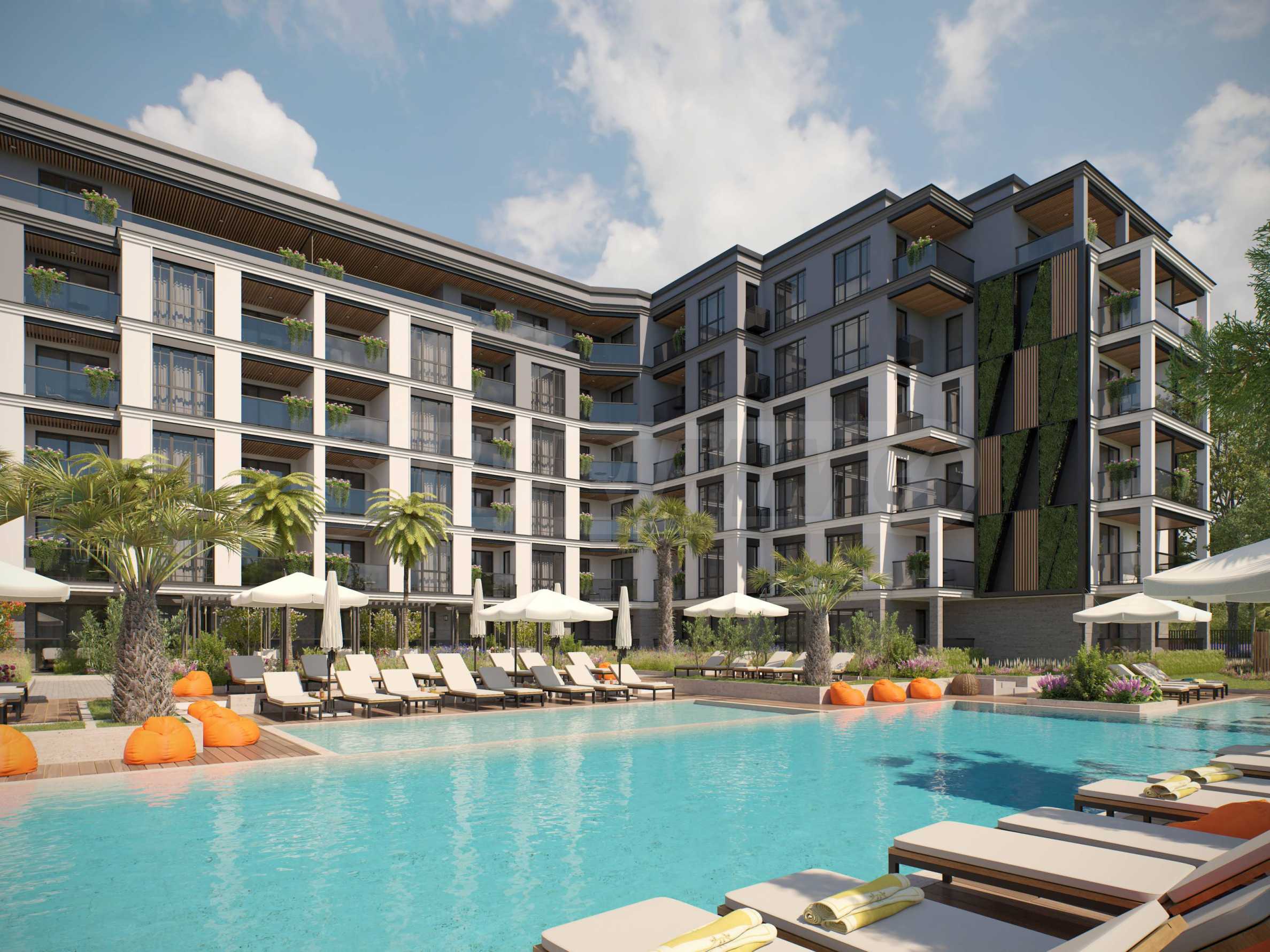 The external reception will connect Buildings 2 and 3 and will serve the management of the complex and the rental of the apartments for clients who have chosen to purchase their property for investment purposes. Each of the two buildings will consist of 31 apartments, spread over 6 floors. In the central part of the complex there will be an Asian-style swimming pool for adults, surrounded by exotic plants, creating the feeling of tranquility in a corner of paradise!
