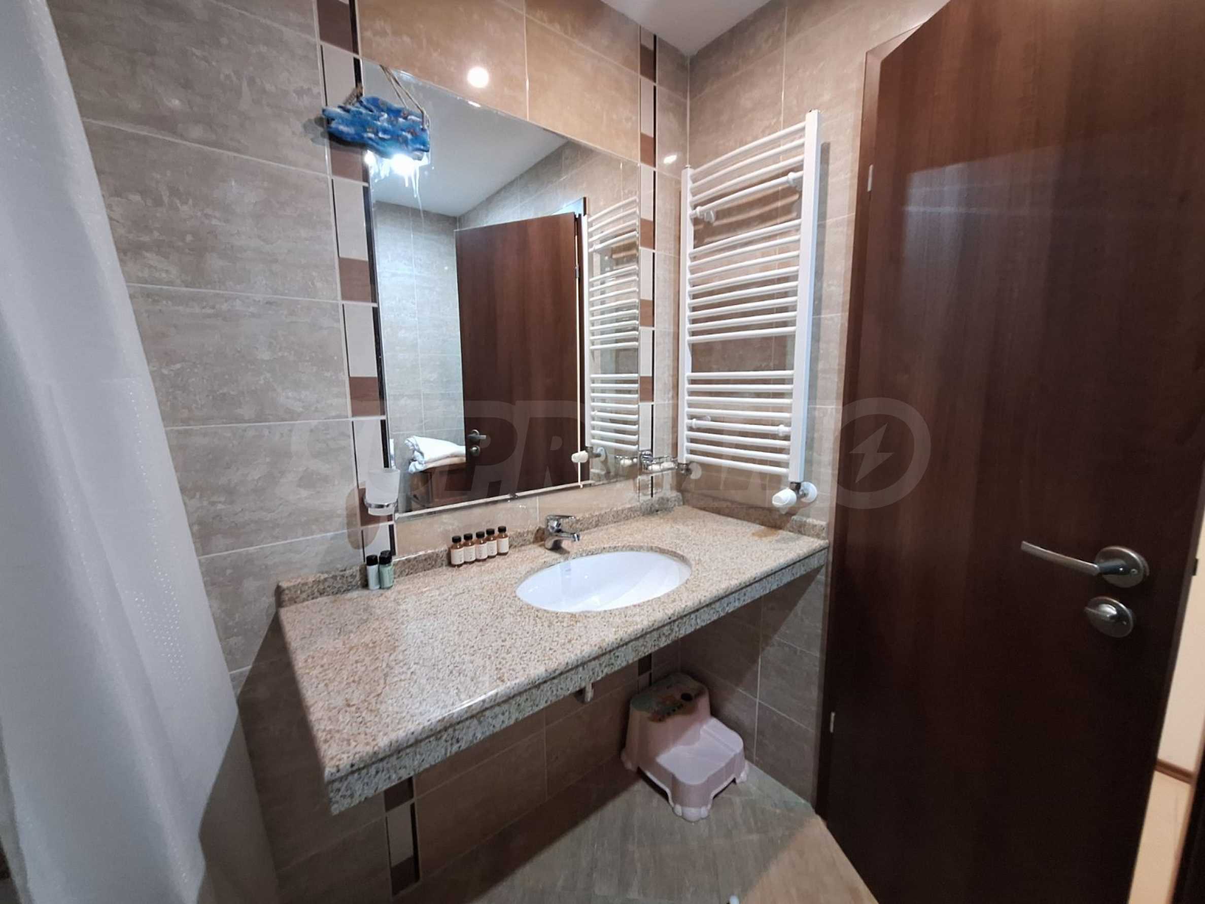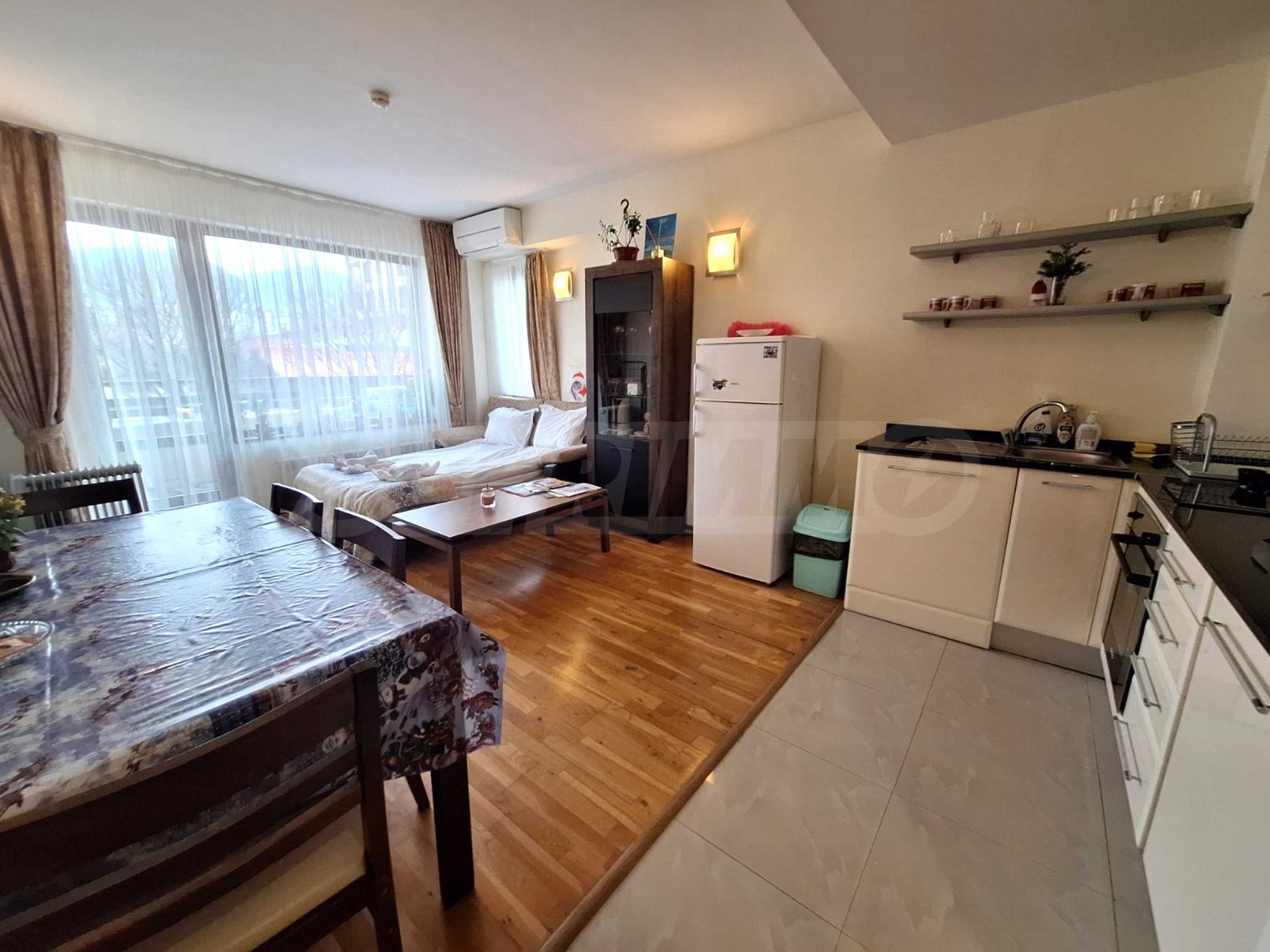 The property is located in the "Bayova Borika" area, with a view of Pirin Mountain and the outdoor pool of the complex from the balcony.