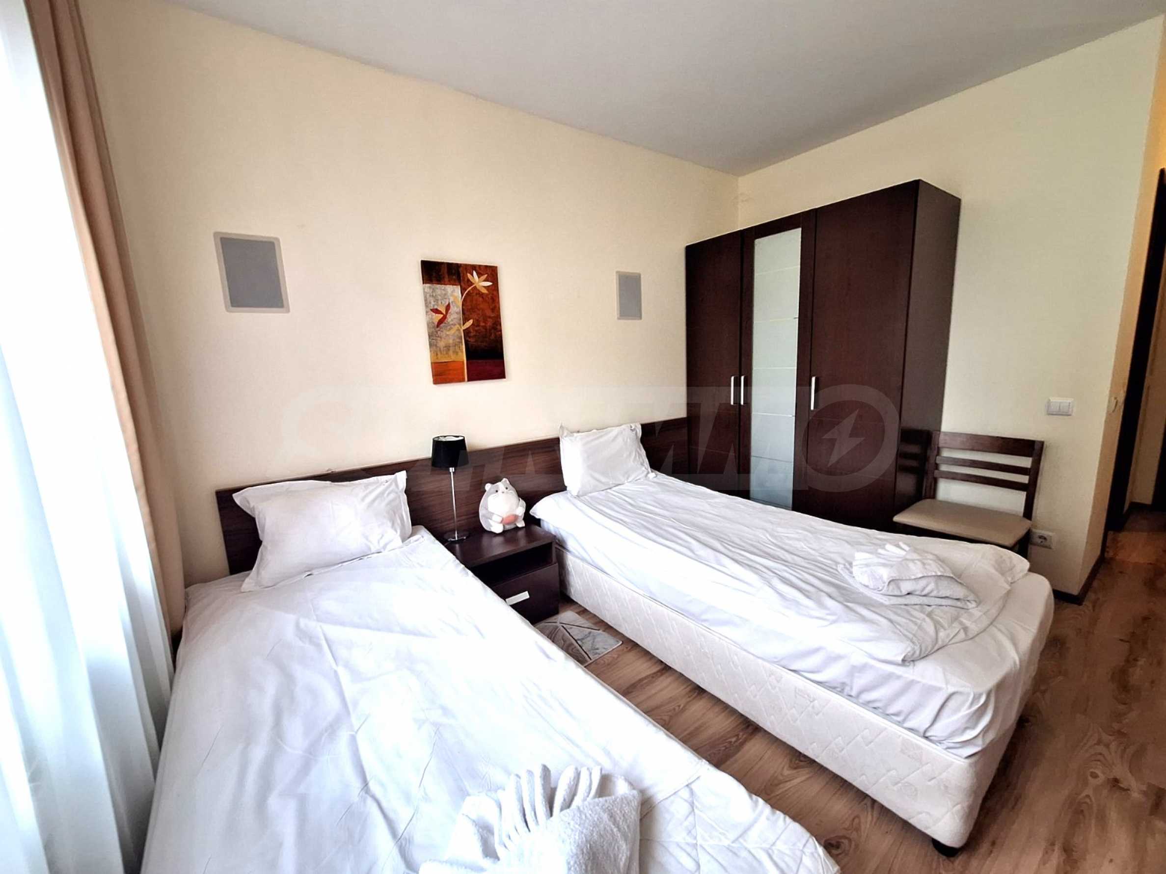 The kitchen is fully furnished and equipped with a glass-ceramic hob, built-in oven, extractor hood, built-in refrigerator, washing machine, electric kettle, sink, cabinets for utensils and dishes, dining table; the living room has a two-seater, sofa bed, coffee table, TV and a cabinet for it; one bedroom has a double bed with a mattress, bedside tables, wardrobe and a private bathroom with a bathtub and toilet; the second bedroom has two single beds, bedside tables, wardrobe and a private bathroom with a shower cabin and toilet.