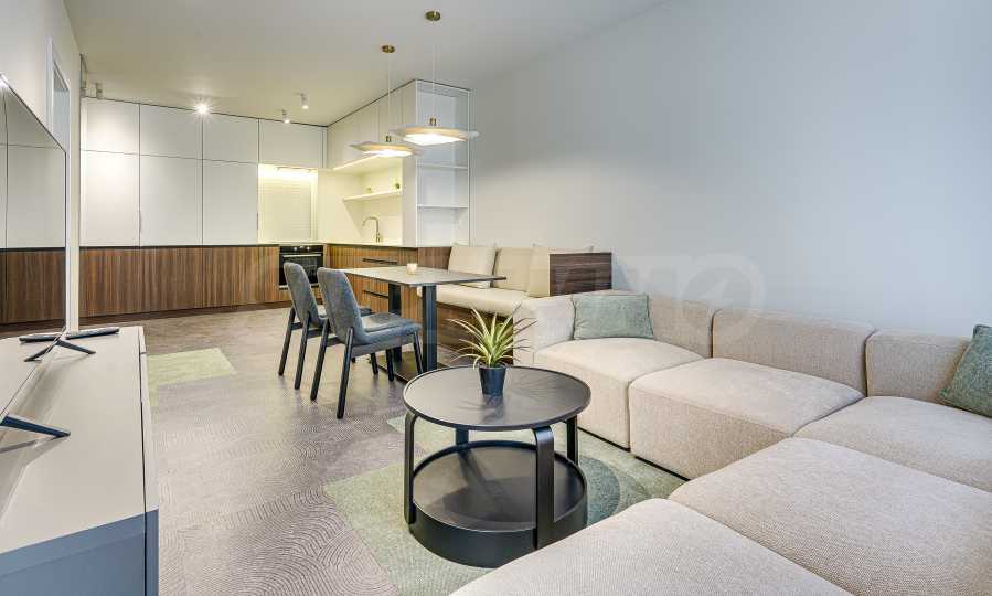 - Living area - Modular 5-seater sofa, TV cabinet with doors, dining table with bench and chairs, fully finished custom-made kitchen, installation of built-in kitchen appliances