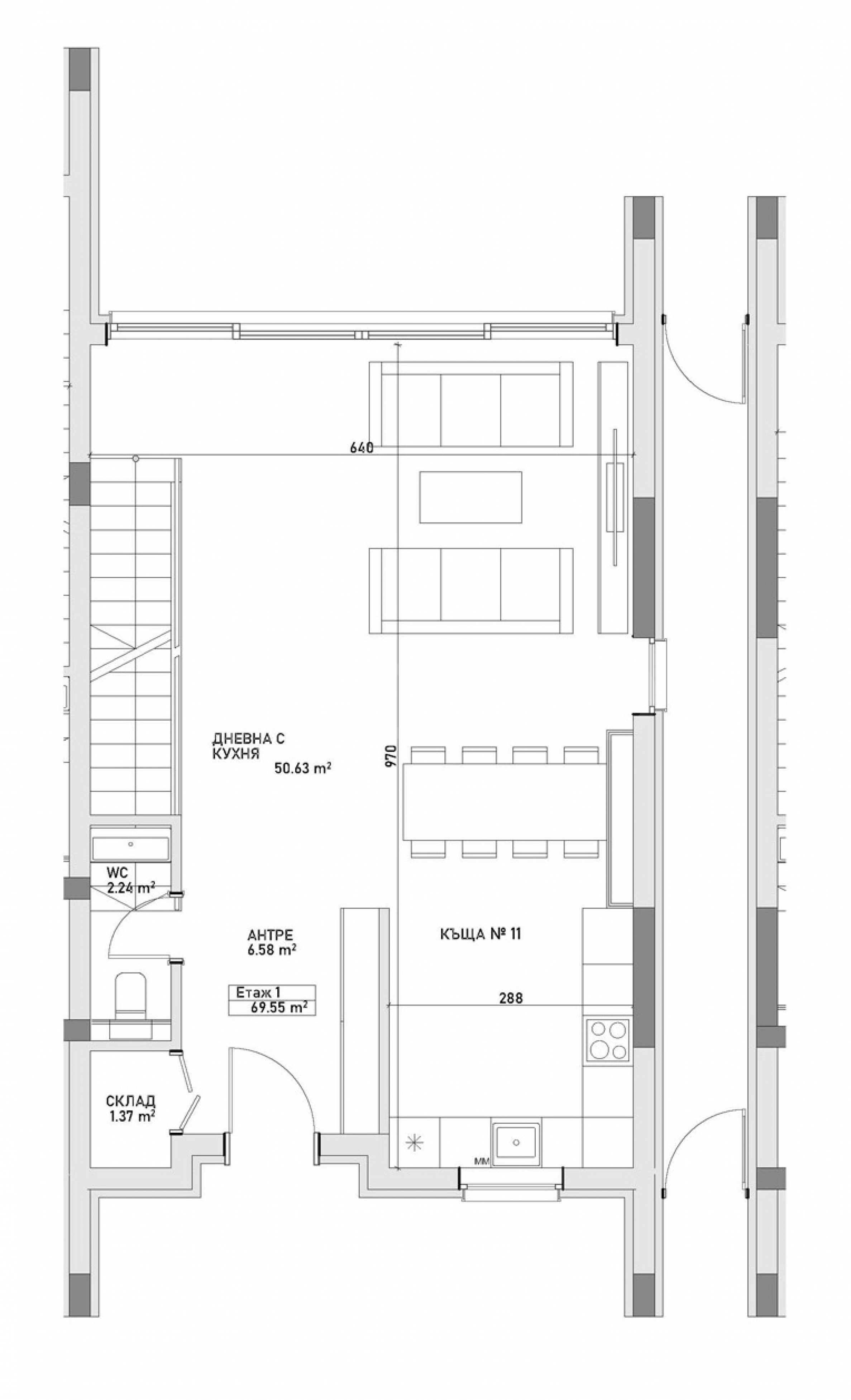 First floor - entrance hall, spacious living room with living room, dining room and kitchen, storage room and bathroom. The built-up area is 69.55 m2.